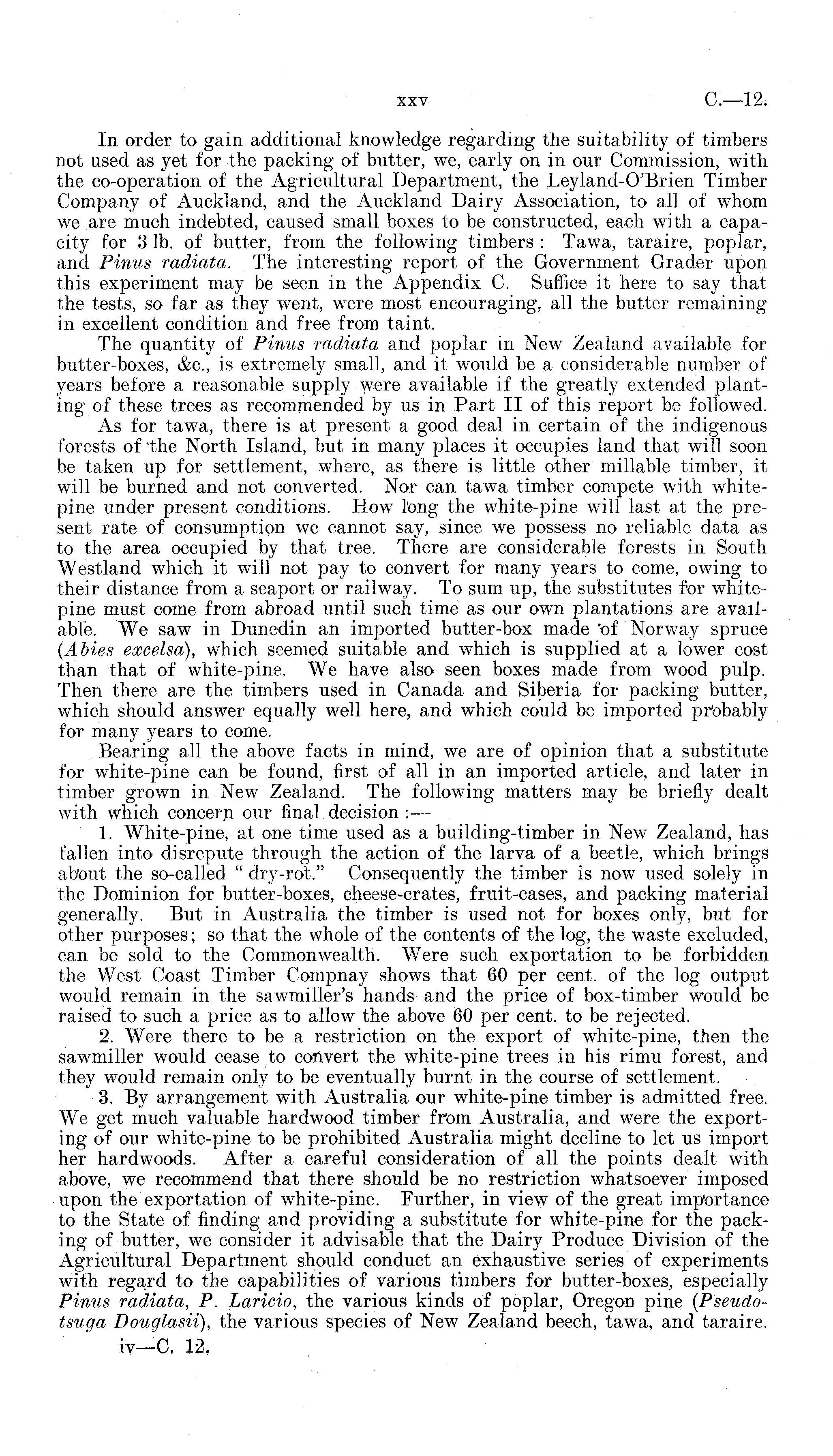 In order to gain additional knowledge regarding the suitability of timbers not used as yet for the packing of butter, we, early on in our Commission, with the co-operation of the Agricultural Department, the Leyland-O'Brien Timber Company of Auckland, and the Auckland Dairy Association, to all of whom we are much indebted, caused small boxes to be constructed, each with a capacity for 3 lb. of butter, from the following timbers : Tawa, taraire, poplar, and Pinus radiata. The interesting report of the Government Grader upon this experiment may be seen in the Appendix C. Suffice it here to say that the tests, so far as they w r ent, were most encouraging, all the butter remaining in excellent condition and free from taint. The quantity of Pinus radiata and poplar in New Zealand available for butter-boxes, &c, is extremely small, and it would be a considerable number of years before a reasonable supply were available if the greatly extended planting of these trees as recommended by us in Part II of this report be followed. As for tawa, there is at present a good deal in certain of the indigenous forests of "the North Island, but in many places it occupies land that will soon be taken up for settlement, where, as there is little other millable timber, it will be burned and not converted. Nor can tawa timber compete with whitepine under present conditions. How long the white-pine will last at the present rate of consumption we cannot say, since we possess no reliable data as to the area occupied by that tree. There are considerable forests in South Westland which it will not pay to convert for many years to come, owing to their distance from a seaport or railway. To sum up, the substitutes for whitepine must come from abroad until such time as our own plantations are available. We saw in Dunedin an imported butter-box made of Norway spruce (Abies excelsa), which seemed suitable and w T hich is supplied at a lower cost than that of white-pine. We have also seen boxes made from wood pulp. Then there are the timbers used in Canada and Siberia for packing butter, which should answer equally well here, and which could be imported probably for many years to come. Bearing all the above facts in mind, we are of opinion that a substitute for white-pine can be found, first of all in an imported article, and later in timber grown in New Zealand. The following matters may be briefly dealt with which concern our final decision : — 1. White-pine, at one time used as a building-timber in New Zealand, has fallen into disrepute through the action of the larva of a beetle, which brings about the so-called " dry-rot." Consequently the timber is now used solely in the Dominion for butter-boxes, cheese-crates, fruit-cases, and packing material generally. But in Australia the timber is used not for boxes only, but for other purposes; so that the whole of the contents of the log, the waste excluded, can be sold to the Commonwealth. Were such exportation to be forbidden the West Coast Timber Compnay shows that 60 per cent, of the log output would remain in the sawmiller's hands and the price of box-timber would be raised to such a price as to allow the above 60 per cent, to be rejected. 2. Were there to be a restriction on the export of white-pine, then the sawmiller would cease to convert the white-pine trees in his rimu forest, and they would remain only to be eventually burnt in the course of settlement. 3. By arrangement with Australia our white-pine timber is admitted free. We get much valuable hardwood timber from Australia, and were the exporting of our white-pine to be prohibited Australia might decline to let us import her hardwoods. After a careful consideration of all the points dealt with above, we recommend that there should be no restriction whatsoever imposed upon the exportation of w r hite-pine. Further, in view of the great importance to the State of finding and providing a substitute for white-pine for the packing of butter, we consider it advisable that the Dairy Produce Division of the Agricultural Department should conduct an exhaustive series of experiments with regard to the capabilities of various timbers for butter-boxes, especially Pinus radiata, P. Laricio, the various kinds of poplar, Oregon pine (Pseudotsuga Douglasii), the various species of New Zealand beech, tawa, and taraire.