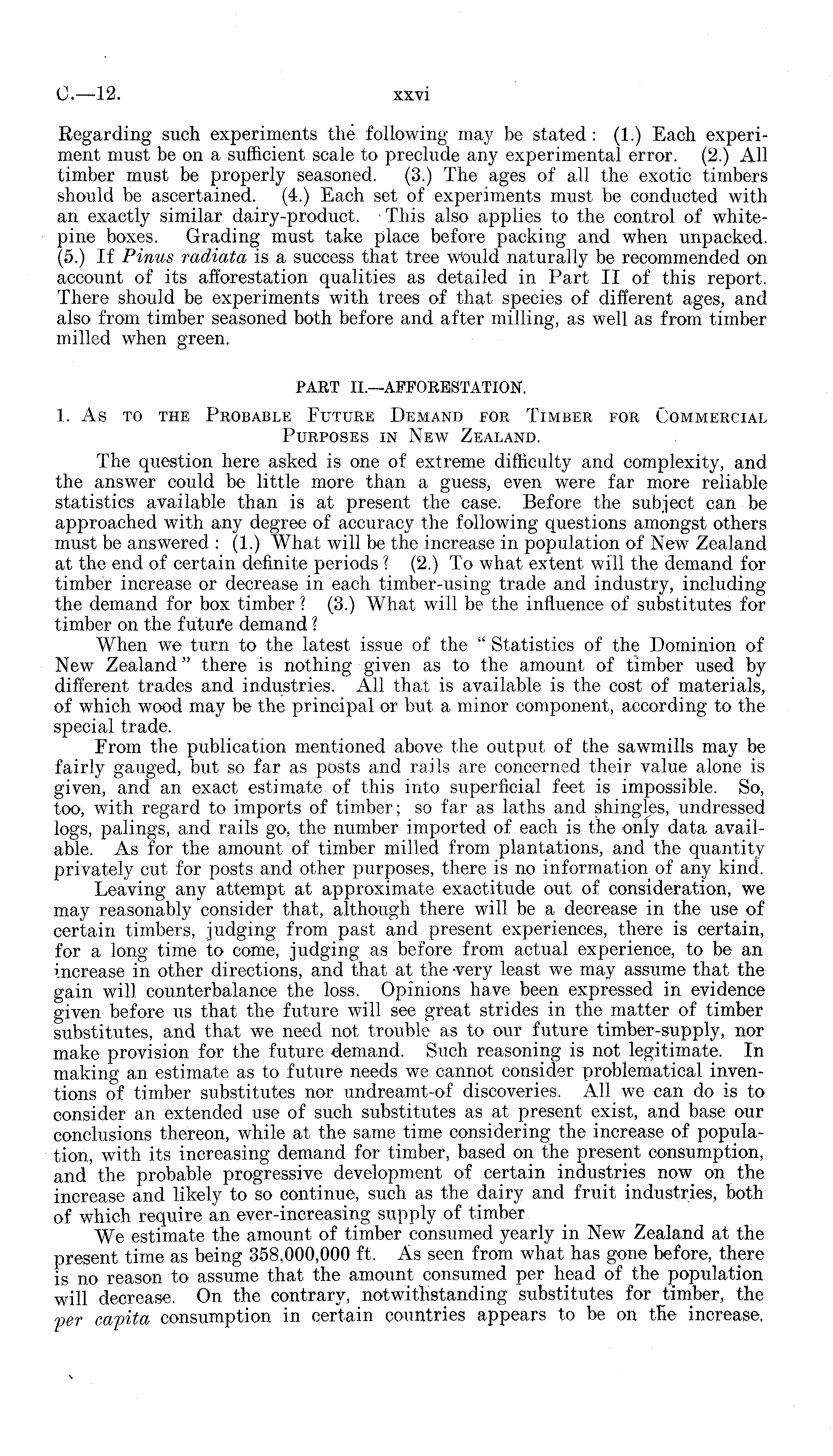 Regarding such experiments the following may be stated : (1.) Each experiment must be on a sufficient scale to preclude any experimental error. (2.) All timber must be properly seasoned. (3.) The ages of all the exotic timbers should be ascertained. (4.) Each set of experiments must be conducted with an exactly similar dairy-product. This also applies to the control of whitepine boxes. Grading must take place before packing and when unpacked. (5.) If Pinus radiata is a success that tree wtould naturally be recommended on account of its afforestation qualities as detailed in Part II of this report. There should be experiments with trees of that species of different ages, and also from timber seasoned both before and after milling, as well as from timber milled when green. PART lI.—AFFORESTATION. 1. As to the Probable Future Demand for Timber for Commercial Purposes in New Zealand. The question here asked is one of extreme difficulty and complexity, and the answer could be little more than a guess, even were far more reliable statistics available than is at present the case. Before the subject can be approached with any degree of accuracy the following questions amongst others must be answered : (1.) What will be the increase in population of New Zealand at the end of certain definite periods ? (2.) To what extent will the demand for timber increase or decrease in each timber-using trade and industry, including the demand for box timber ? (3.) What will be the influence of substitutes for timber on the future demand ? When we turn to the latest issue of the " Statistics of the Dominion of New Zealand" there is nothing given as to the amount of timber used by different trades and industries. All that is available is the cost of materials, of which wood may be the principal or but a minor component, according to the special trade. From the publication mentioned above the output of the sawmills may be fairly gauged, but so far as posts and rails are concerned their value alone is given, and an exact estimate of this into superficial feet is impossible. So, too, with regard to imports of timber; so far as laths and shingles, undressed logs, palings, and rails go, the number imported of each is the only data available. As for the amount of timber milled from plantations, and the quantity privately cut for posts and other purposes, there is no information of any kind. Leaving any attempt at approximate exactitude out of consideration, we may reasonably consider that, although there will be a decrease in the use of certain timbers, judging from past and present experiences, there is certain, for a long time to come, judging as before from actual experience, to be an increase in other directions, and that at the -very least we may assume that the gain will counterbalance the loss. Opinions have been expressed in evidence given before us that the future will see great strides in the matter of timber substitutes, and that we need not trouble as to our future timber-supply, nor make provision for the future demand. Such reasoning is not legitimate. In making an estimate as to future needs we cannot consider problematical inventions of timber substitutes nor undreamt-of discoveries. All we can do is to consider an extended use of such substitutes as at present exist, and base our conclusions thereon, while at the same time considering the increase of population, with its increasing demand for timber, based on the present consumption, and the probable progressive development of certain industries now on the increase and likely to so continue, such as the dairy and fruit industries, both of which require an ever-increasing supply of timber We estimate the amount of timber consumed yearly in New Zealand at the present time as being 358,000,000 ft. As seen from what has gone before, there is no reason to assume that the amount consumed per head of the population will decrease. On the contrary, notwithstanding substitutes for timber, the per capita consumption in certain countries appears to be on the increase.