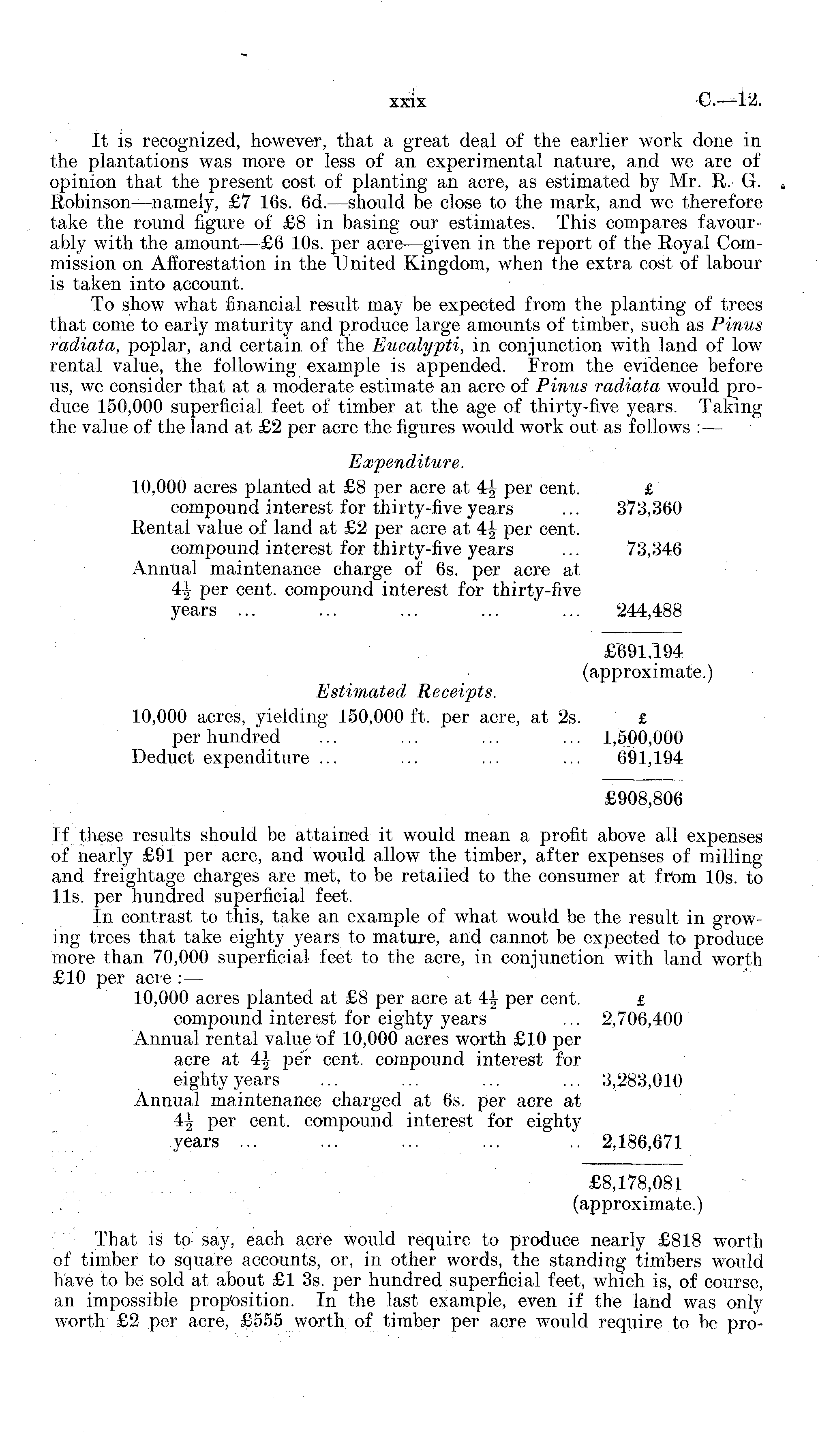It is recognized, however, that a great deal of the earlier work done in the plantations was more or less of an experimental nature, and we are of opinion that the present cost of planting an acre, as estimated by Mr. R. G. » Robinson —namely, £7 16s. 6d.—should be close to the mark, and we therefore take the round figure of £8 in basing our estimates. This compares favourably with the amount —£6 10s. per acre—given in the report of the Royal Commission on Afforestation in the United Kingdom, when the extra cost of labour is taken into account. To show what financial result may be expected from the planting of trees that come to early maturity and produce large amounts of timber, such as Pinus radiata, poplar, and certain of the Eucalypti, in conjunction with land of low rental value, the following example is appended. From the evidence before us, we consider that at a moderate estimate an acre of Pinus radiata would produce 150,000 superficial feet of timber at the age of thirty-five years. Taking the value of the land at £2 per acre the figures would work out as follows : — Expenditure. 10,000 acres planted at £8 per acre at per cent. £ compound interest for thirty-five years ... 373,360 Rental value of land at £2 per acre at per cent. compound interest for thirty-five years ... 73,346 Annual maintenance charge of 6s. per acre at 4| per cent, compound interest for thirty-five years ... ... ... ... ... 244,488 £691,194 (approximate.) Estimated Receipts. 10,000 acres, yielding 150,000 ft. per acre, at 2s. £ per hundred ... ... ... ... 1,500,000 Deduct expenditure ... ... ... ... 691,194 £908,806 If these results should be attained it would mean a profit above all expenses of nearly £91 per acre, and would allow the timber, after expenses of milling and freightage charges are met, to be retailed to the consumer at from 10s. to 11s. per hundred superficial feet. In contrast to this, take an example of what would be the result in growing trees that take eighty years to mature, and cannot be expected to produce more than 70,000 superficial feet to the acre, in conjunction with land worth £10 per acre : — 10,000 acres planted at £8 per acre at per cent. £ compound interest for eighty years ... 2,706,400 Annual rental value 'of 10,000 acres worth £10 per acre at 4-| per cent, compound interest for eighty years ... ... ... ... 3,283,010 Annual maintenance charged at 6s. per acre at 4| per cent, compound interest for eighty years ... ... ... ... .. 2,186,671 £8,178,081 (approximate.) That is to say, each acre would require to produce nearly £818 worth of timber to square accounts, or, in other words, the standing timbers would have to be sold at about £1 3s. per hundred superficial feet, which is, of course, an impossible proposition. In the last example, even if the land was only worth £2 per acre, £555 worth of timber per acre would require to be pro-