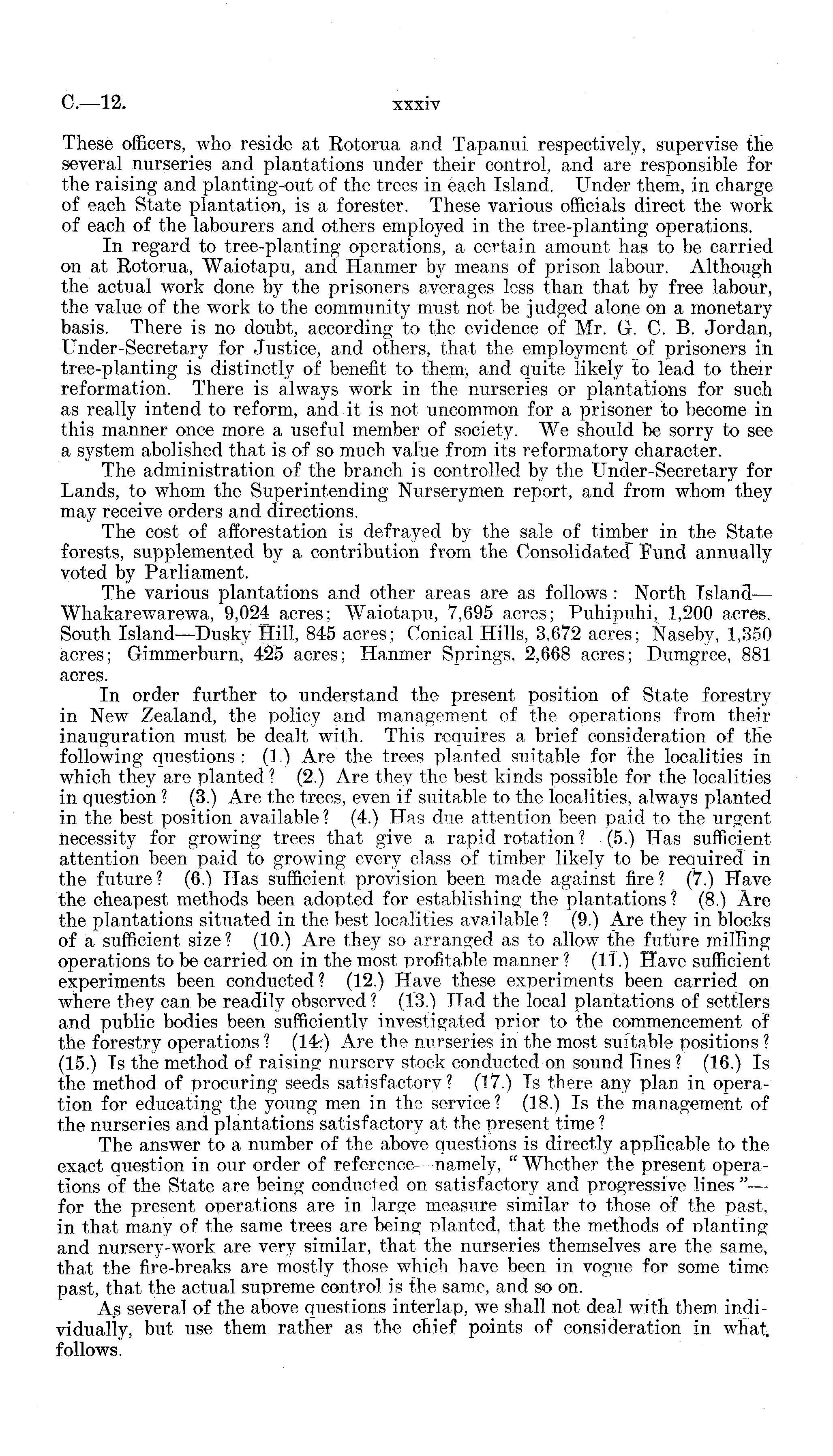 These officers, who reside at Rotorua and Tapanui respectively, supervise the several nurseries and plantations under their control, and are responsible for the raising and planting-out of the trees in each Island. Under them, in charge of each State plantation, is a forester. These various officials direct the work of each of the labourers and others employed in the tree-planting operations. In regard to tree-planting operations, a certain amount has to be carried on at Rotorua, Waiotapu, and Hanmer by means of prison labour. Although the actual work done by the prisoners averages less than that by free labour, the value of the work to the community must not be judged alone on a monetary basis. There is no doubt, according to the evidence of Mr. G. C. B. Jordan, Under-Secretary for Justice, and others, that the employment of prisoners in tree-planting is distinctly of benefit to them, and quite likely to lead to their reformation. There is always work in the nurseries or plantations for such as really intend to reform, and it is not uncommon for a prisoner to become in this manner once more a useful member of society. We should be sorry to see a system abolished that is of so much value from its reformatory character. The administration of the branch is controlled by the Under-Secretary for Lands, to whom the Superintending Nurserymen report, and from whom they may receive orders and directions. The cost of afforestation is defrayed by the sale of timber in the State forests, supplemented by a contribution from the Consolidated" Fund annually voted by Parliament. The various plantations and other areas are as follows : North Island— Whakarewarewa, 9,024 acres; Waiotapu, 7,695 acres; Puhipuhi, 1,200 acres. South Island—Dusky Hill, 845 acres; Conical Hills, 3,672 acres; Naseby, 1,350 acres; Gimmerburn, 425 acres; Hanmer Springs, 2,668 acres; Dumgree, 881 acres. In order further to understand the present position of State forestry in New Zealand, the policy and management of the operations from their inauguration must be dealt with. This requires a brief consideration of the following questions : (1.) Are the trees planted suitable for the localities in which they are planted ? (2.) Are they the best kinds possible for the localities in question ? (3.) Are the trees, even if suitable to the localities, always planted in the best position available? (4.) Has due attention been paid to the urgent necessity for growing trees that give a rapid rotation ? (5.) Has sufficient attention been paid to growing every class of timber likely to be required in the future? (6.) Has sufficient, provision been made against fire? (7.) Have the cheapest methods been adopted for establishing the plantations? (8.) Are the plantations situated in the best localities available? (9.) Are they in blocks of a sufficient size? (10.) Are they so arranged as to allow the future milling operations to be carried on in the most profitable manner ? (11.) Have sufficient experiments been conducted ? (12.) Have these experiments been carried on where they can be readily observed? (13.) Had the local plantations of settlers and public bodies been sufficiently investigated prior to the commencement of the forestry operations ? (14?) Are the nurseries in the most suitable positions ? (15.) Is the method of raising , nursery stock conducted on sound lines ? (16.) Is the method of procuring seeds satisfactory ? (17.) Is there any plan in operation for educating the young men in the service? (18.) Is the management of the nurseries and plantations satisfactory at the present time ? The answer to a number of the above questions is directly applicable to the exact question in our order of reference—namely, " Whether the present operations of the State are being conducted on satisfactory and progressive lines " — for the present operations are in large measure similar to those of the past, in that many of the same trees are being planted, that the methods of planting and nursery-work are very similar, that the nurseries themselves are the same, that the fire-breaks are mostly those which have been in vogue for some time past, that the actual supreme control is the same, and so on. As several of the above questions interlap, we shall not deal with them individually, but use them rather as the chief points of consideration in what follows.