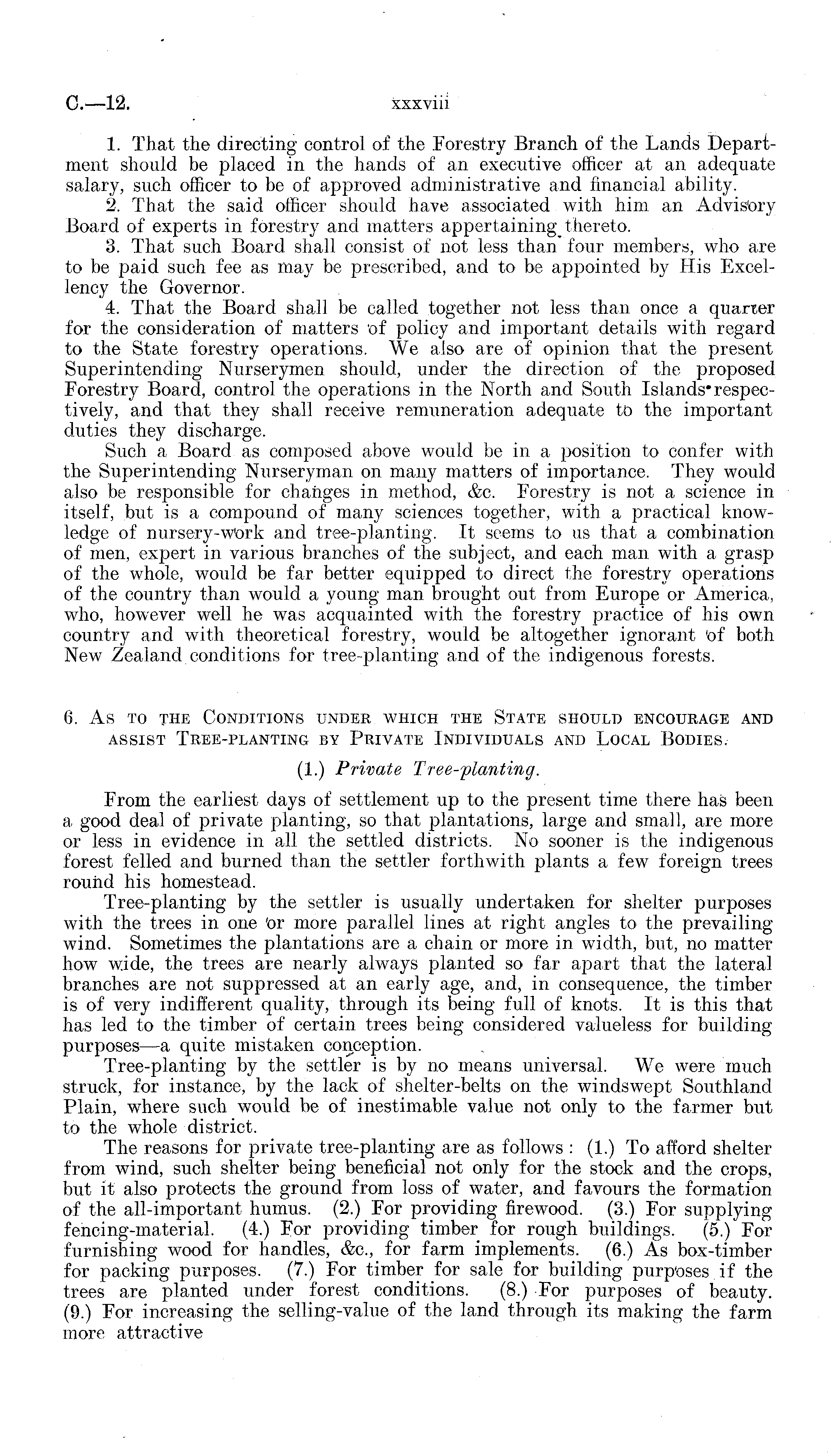 1. That the directing control of the Forestry Branch of the Lands Department should be placed in the hands of an executive officer at an adequate salary, such officer to be of approved administrative and financial ability. 2. That the said officer should have associated with him an Advisory Board of experts in forestry and matters appertaining thereto. 3. That such Board shall consist of not less than four members, who are to be paid such fee as may be prescribed, and to be appointed by His Excellency the Governor. 4. That the Board shall be called together not less than once a quarter for the consideration of matters "of policy and important details with regard to the State forestry operations. We also are of opinion that the present Superintending Nurserymen should, under the direction of the proposed Forestry Board, control the operations in the North and South Islands* respectively, and that they shall receive remuneration adequate to the important duties they discharge. Such a Board as composed above would be in a position to confer with the Superintending Nurseryman on many matters of importance. They would also be responsible for changes in method, &c. Forestry is not a science in itself, but is a compound of many sciences together, with a practical knowledge of nursery-work and tree-planting. It seems to us that a combination of men, expert in various branches of the subject, and each man with a grasp of the whole, would be far better equipped to direct the forestry operations of the country than would a young man brought out from Europe or America, who, however well he was acquainted with the forestry practice of his own country and with theoretical forestry, would be altogether ignorant 'of both New Zealand conditions for tree-planting and of the indigenous forests. 6. As to the Conditions under which the State should encourage and assist Tree-planting by Private Individuals and Local Bodies. (1.) Private Tree-planting. From the earliest days of settlement up to the present time there has been a good deal of private planting, so that plantations, large and small, are more or less in evidence in all the settled districts. No sooner is the indigenous forest felled and burned than the settler forthwith plants a few foreign trees round his homestead. Tree-planting by the settler is usually undertaken for shelter purposes with the trees in one 'or more parallel lines at right angles to the prevailing wind. Sometimes the plantations are a chain or more in width, but, no matter how wide, the trees are nearly always planted so far apart that the lateral branches are not suppressed at an early age, and, in consequence, the timber is of very indifferent quality, through its being full of knots. It is this that has led to the timber of certain trees being considered valueless for building purposes —a quite mistaken conception. Tree-planting by the settler is by no means universal. We were much struck, for instance, by the lack of shelter-belts on the windswept Southland Plain, where such would be of inestimable value not only to the farmer but to the whole district. The reasons for private tree-planting are as follows : (1.) To afford shelter from wind, such shelter being beneficial not only for the stock and the crops, but it also protects the ground from loss of water, and favours the formation of the all-important humus. (2.) For providing firewood. (3.) For supplying fencing-material. (4.) For providing timber for rough buildings. (5.) For furnishing wood for handles, &c, for farm implements. (6.) As box-timber for packing purposes. (7.) For timber for sale for building purposes if the trees are planted under forest conditions. (8.) For purposes of beauty. (9.) For increasing the selling-value of the land through its making the farm more attractive