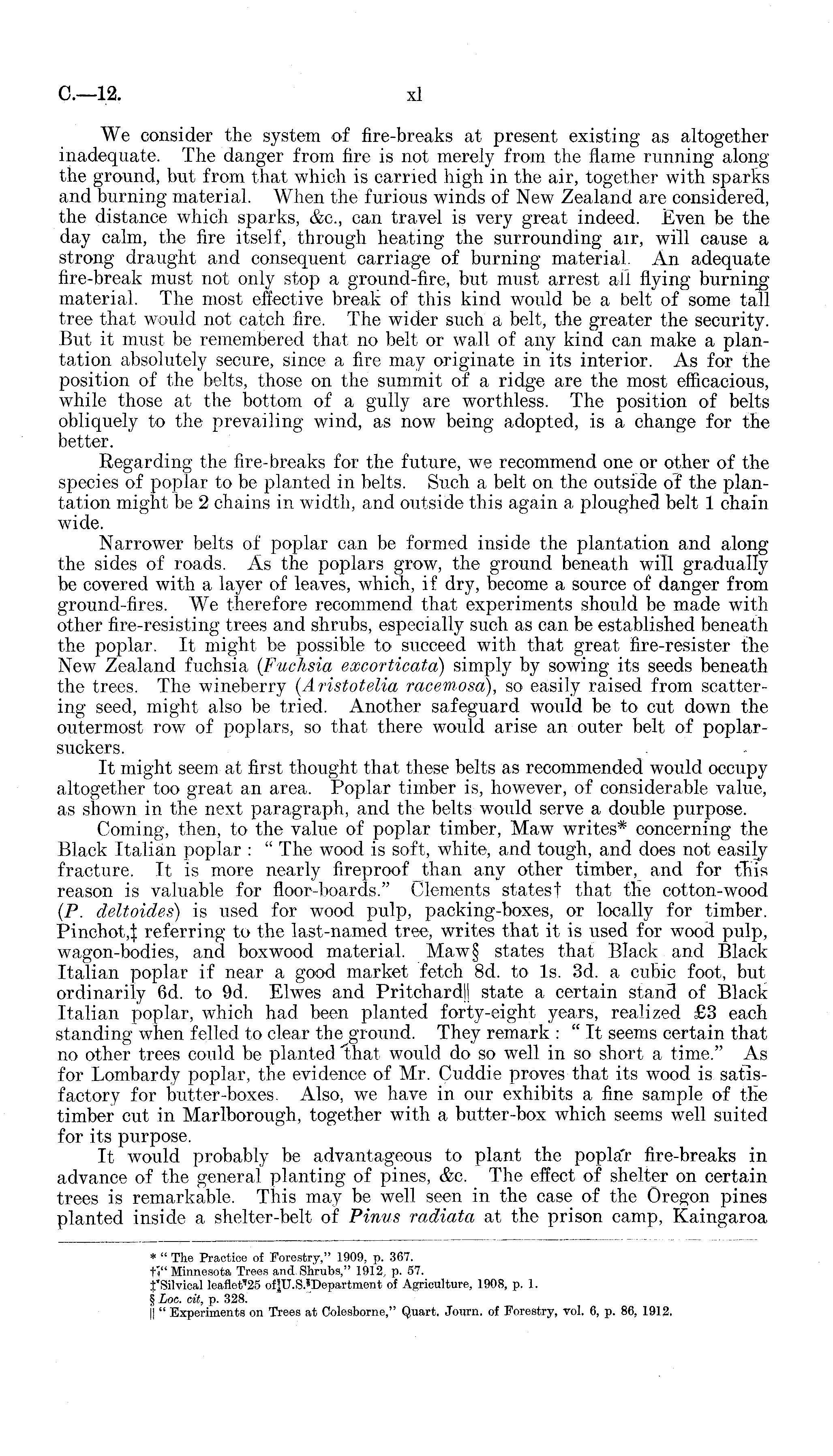 We consider the system of fire-breaks at present existing as altogether inadequate. The danger from fire is not merely from the flame running along the ground, but from that which is carried high in the air, together with sparks and burning material. When the furious winds of New Zealand are considered, the distance which sparks, &c, can travel is very great indeed. Even be the day calm, the fire itself, through heating the surrounding air, will cause a strong draught and consequent carriage of burning material. An adequate fire-break must not only stop a ground-fire, but must arrest all flying burning material. The most effective break of this kind would be a belt of some tall tree that would not catch fire. The wider such a belt, the greater the security. But it must be remembered that no belt or wall of any kind can make a plantation absolutely secure, since a fire may originate in its interior. As for the position of the belts, those on the summit of a ridge are the most efficacious, while those at the bottom of a gully are worthless. The position of belts obliquely to the prevailing wind, as now being adopted, is a change for the better. Regarding the fire-breaks for the future, we recommend one or other of the species of poplar to be planted in belts. Such a belt on the outside oi the plantation might be 2 chains in width, and outside this again a ploughed belt 1 chain wide. Narrower belts of poplar can be formed inside the plantation and along the sides of roads. As the poplars grow, the ground beneath will gradually be covered with a layer of leaves, which, if dry, become a source of danger from ground-fires. We therefore recommend that experiments should be made with other fire-resisting trees and shrubs, especially such as can be established beneath the poplar. It might be possible to succeed with that great fire-resister the New Zealand fuchsia (Fuchsia excorticata) simply by sowing its seeds beneath the trees. The wineberry (Aristotelia racemosa), so easily raised from scattering seed, might also be tried. Another safeguard would be to cut down the outermost row of poplars, so that there would arise an outer belt of poplarsuckers. It might seem at first thought that these belts as recommended would occupy altogether too great an area. Poplar timber is, however, of considerable value, as shown in the next paragraph, and the belts would serve a double purpose. Coming, then, to the value of poplar timber, Maw writes* concerning the Black Italian poplar : " The wood is soft, white, and tough, and does not easily fracture. It is more nearly fireproof than any other timber, and for this reason is valuable for floor-boards." Clements statesf that the cotton-wood (P. deltoides) is used for wood pulp, packing-boxes, or locally for timber. Pinchot,| referring to the last-named tree, writes that it is used for wood pulp, wagon-bodies, and boxwood material. Maw§ states that Black and Black Italian poplar if near a good market fetch Bd. to Is. 3d. a cubic foot, but ordinarily 6d. to 9d. Elwes and Pritchardjl state a certain stand of Black Italian poplar, which had been planted forty-eight years, realized £3 each standing when felled to clear the ground. They remark : "It seems certain that no other trees could be planted that would do so well in so short a time." As for Lombardy poplar, the evidence of Mr. Cuddie proves that its wood is satisfactory for butter-boxes. Also, we have in our exhibits a fine sample of the timber cut in Marlborough, together with a butter-box which seems well suited for its purpose. It would probably be advantageous to plant the poplar fire-breaks in advance of the general planting of pines, &c. The effect of shelter on certain trees is remarkable. This may be well seen in the case of the Oregon pines planted inside a shelter-belt of Pinus radiata at the prison camp, Kaingaroa