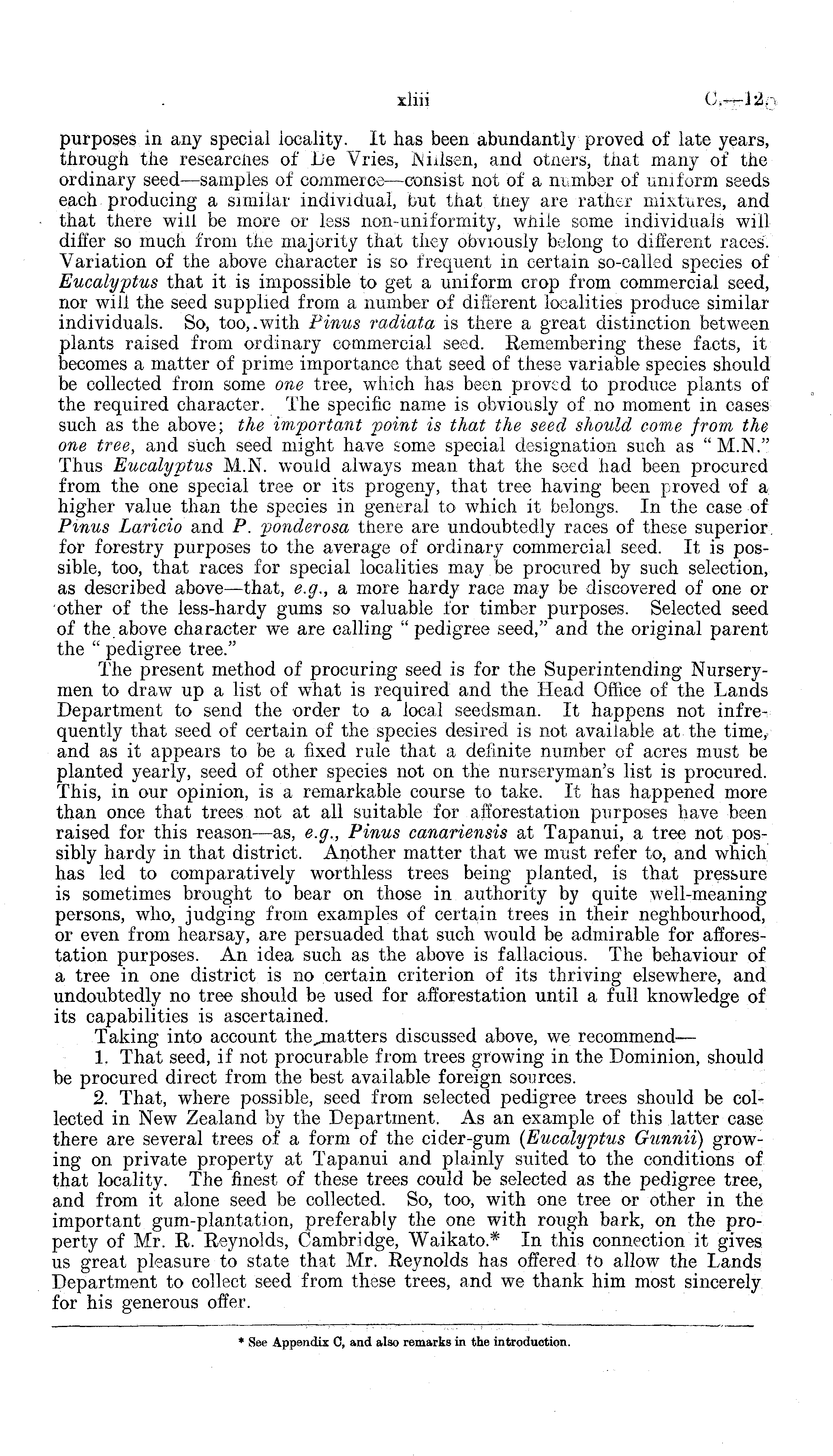 purposes in any special locality. It has been abundantly proved of late years, through the researches of lie Vries, Niilsen, and otners, that many of the ordinary seed —samples of commerce —consist not of a number of uniform seeds each producing a similar individual, but that they are rather mixtures, and that there will be more or less non-uniformity, while some individuals will differ so much from the majority that they obviously belong to different races. Variation of the above character is so frequent in certain so-called species of Eucalyptus that it is impossible to get a uniform crop from commercial seed, nor will the seed supplied from a number of different localities produce similar individuals. So, too, .with Pinus radiata is there a great distinction between plants raised from ordinary commercial seed. Remembering these facts, it becomes a matter of prime importance that seed of these variable species should be collected from some one tree, which has been proved to produce plants of the required character. The specific name is obviously of no moment in cases such as the above; the important point is that the seed should come from the one tree, and such seed might have some special designation such as " M.N." Thus Eucalyptus M.N. would always mean that the seed had been procured from the one special tree or its progeny, that tree having been proved 'of a higher value than the species in general to which it belongs. In the case of Pinus Laricio and P. ponderosa there are undoubtedly races of these superior, for forestry purposes to the average of ordinary commercial seed. It is possible, too, that races for special localities may be procured by such selection, as described above—that, e.g., a more hardy race may be discovered of one or other of the less-hardy gums so valuable for timber purposes. Selected seed of the. above character we are calling " pedigree seed," and the original parent the " pedigree tree." The present method of procuring seed is for the Superintending Nurserymen to draw up a list of w T hat is required and the Head Office of the Lands Department to send the order to a local seedsman. It happens not infrequently that seed of certain of the species desired is not available at the time, and as it appears to be a fixed rule that a definite number of acres must be planted yearly, seed of other species not on the nurseryman's list is procured. This, in our opinion, is a remarkable course to take. It has happened more than once that trees not at all suitable for afforestation purposes have been raised for this reason —as, e.g., Pinus canariensis at Tapanui, a tree not possibly hardy in that district. Another matter that we must refer to, and which has led to comparatively worthless trees being planted, is that pressure is sometimes brought to bear on those in authority by quite well-meaning persons, who, judging from examples of certain trees in their neghbourhood, or even from hearsay, are persuaded that such would be admirable for afforestation purposes. An idea such as the above is fallacious. The behaviour of a tree in one district is no certain criterion of its thriving elsewhere, and undoubtedly no tree should be used for afforestation until a full knowledge of its capabilities is ascertained. Taking into account discussed above, we recommend-— 1. That seed, if not procurable from trees growing in the Dominion, should be procured direct from the best available foreign sources. 2. That, where possible, seed from selected pedigree trees should be collected in New Zealand by the Department. As an example of this latter case there are several trees of a form of the cider-gum (Eucalyptus Gunnii) growing on private property at Tapanui and plainly suited to the conditions of that locality. The finest of these trees could be selected as the pedigree tree, and from it alone seed be collected. So, too, with one tree or other in the important gum-plantation, preferably the one with rough bark, on the property of Mr. R. Reynolds, Cambridge, Waikato.* In this connection it gives us great pleasure to state that Mr. Reynolds has offered to allow the Lands Department to collect seed from these trees, and we thank him most sincerely for his generous offer.