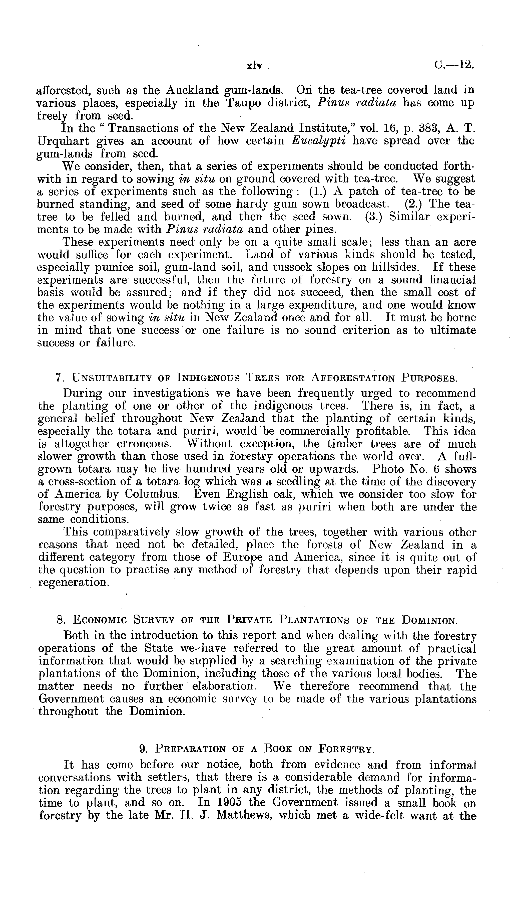 afforested, such as the Auckland gum-lands. On the tea-tree covered land in various places, especially in the Taupo district, Pinus radiata has come up freely from seed. In the " Transactions of the New Zealand Institute," vol. 16, p. 383, A. T. Urquhart gives an account of how certain Eucalypti have spread over the gum-lands from seed. We consider, then, that a series of experiments should be conducted forthwith in regard to sowing in situ on ground covered with tea-tree. We suggest a series of experiments such as the following : (1.) A patch of tea-tree to be burned standing, and seed of some hardy gum sown broadcast. (2.) The teatree to be felled and burned, and then the seed sown. (3.) Similar experiments to be made with Pinus radiata and other pines. These experiments need only be on a quite small scale; less than an acre would suffice for each experiment. Land of various kinds should be tested, especially pumice soil, gum-land soil, and tussock slopes on hillsides. If these experiments are successful, then the future of forestry on a sound financial basis would be assured; and if they did not succeed, then the small cost of the experiments would be nothing in a large expenditure, and one would know the value of sowing in situ in New Zealand once and for all. It must be borne in mind that 'one success or one failure is no sound criterion as to ultimate success or failure. 7. Unsuitability of Indigenous Trees for Afforestation Purposes. During our investigations we have been frequently urged to recommend the planting of one or other of the indigenous trees. There is, in fact, a general belief throughout New Zealand that the planting of certain kinds, especially the totara and puriri, would'be commercially profitable. This idea is altogether erroneous. Without exception, the timber trees are of much slower growth than those used in forestry operations the world over. A fullgrown totara may be five hundred years old or upwards. Photo No. 6 shows a cross-section of a totara log which was a seedling at the time of the discovery of America by Columbus. Even English oak, which we consider too slow for forestry purposes, will grow twice as fast as puriri when both are under the same conditions. This comparatively slow growth of the trees, together with various other reasons that need not be detailed, place the forests of New Zealand in a different category from those of Europe and America, since it is quite out of the question to practise any method of forestry that depends upon their rapid regeneration. 8. Economic Survey of the Private Plantations of the Dominion. Both in the introduction to this report and when dealing with the forestry operations of the State we-have referred to the great amount of practical information that would be supplied by a searching examination of the private plantations of the Dominion, including those of the various local bodies. The matter needs no further elaboration. We therefore recommend that the Government causes an economic survey to be made of the various plantations throughout the Dominion. 9. Preparation of a Book on Forestry. It has come before our notice, both from evidence and from informal conversations with settlers, that there is a considerable demand for information regarding the trees to plant in any district, the methods of planting, the time to plant, and so on. In 1905 the Government issued a small book on forestry by the late Mr. H. J. Matthews, which met a wide-felt want at the