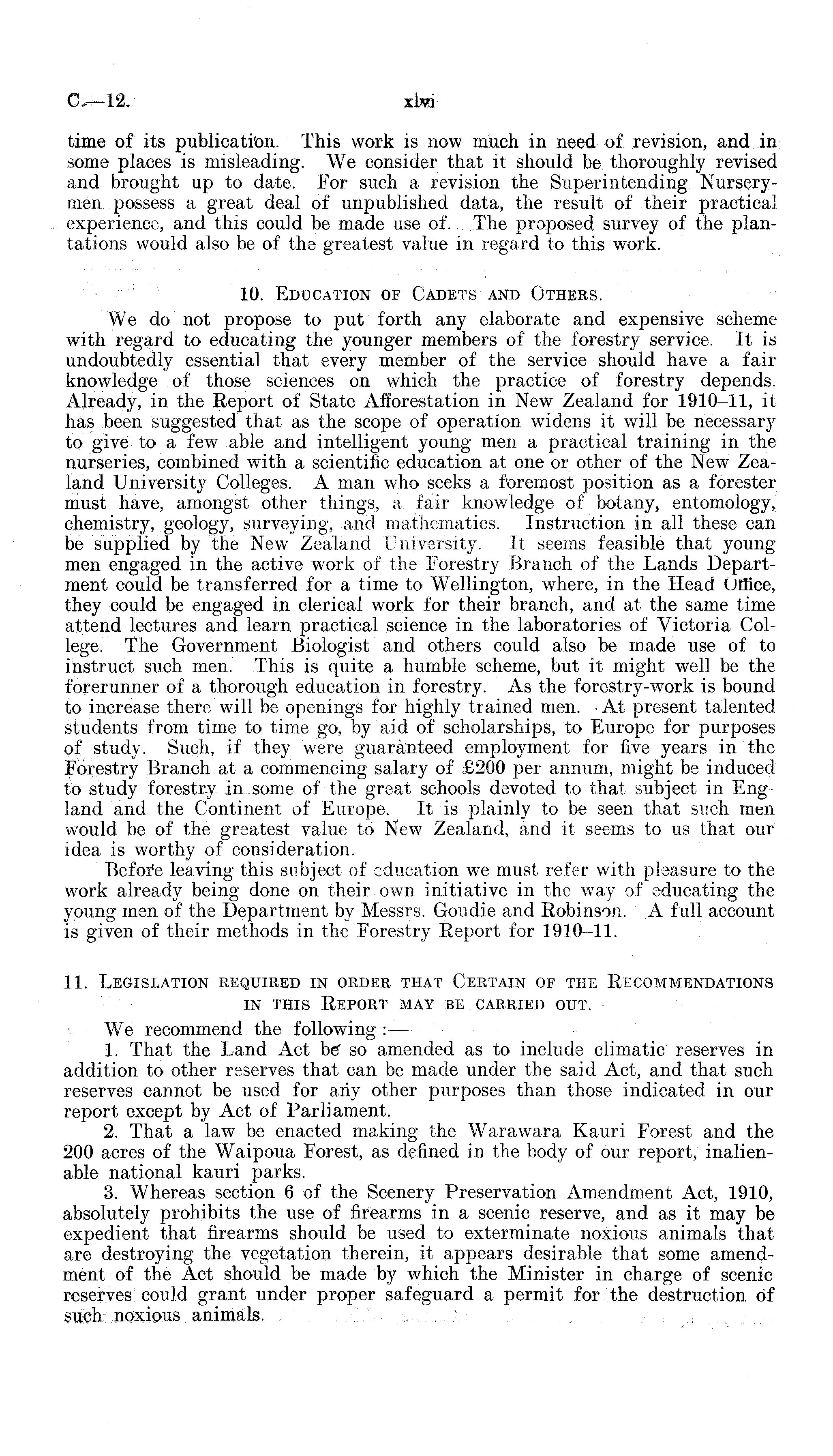 time of its publication. This work is now much in need of revision, and in some places is misleading. We consider that it should be thoroughly revised and brought up to date. For such a revision the Superintending Nurserymen possess a great deal of unpublished data, the result of their practical experience, and this could be made use of. The proposed survey of the plantations would also be of the greatest value in regard to this work. 10. Education of Cadets and Others. We do not propose to put forth any elaborate and expensive scheme with regard to educating the younger members of the forestry service. It is undoubtedly essential that every member of the service should have a fair knowledge of those sciences on which the practice of forestry depends. Already, in the Report of State Afforestation in New Zealand for 1910-11, it has been suggested that as the scope of operation widens it will be necessary to give to a few able and intelligent young men a practical training in the nurseries, combined with a scientific education at one or other of the New Zealand University Colleges. A man who seeks a foremost position as a forester must have, amongst other things, a fair knowledge of botany, entomology, chemistry, geology, surveying, and mathematics. Instruction in all these can be supplied by the New Zealand University. It seems feasible that youngmen engaged in the active work of the Forestry Branch of the Lands Department could be transferred for a time to Wellington, where, in the Head Utfice, they could be engaged in clerical work for their branch, and at the same time attend lectures and learn practical science in the laboratories of Victoria College. The Government Biologist and others could also be made use of to instruct such men. This is quite a humble scheme, but it might well be the forerunner of a thorough education in forestry. As the forestry-work is bound to increase there will be openings for highly trained men. ■ At present talented students from time to time go, by aid of scholarships, to Europe for purposes of study. Such, if they were guaranteed employment for five years in the Forestry Branch at a commencing salary of £200 per annum, might be induced to study forestry in some of the great schools devoted to that subject in England and the Continent of Europe. It is plainly to be seen that such men would be of the greatest value to New Zealand, and it seems to us that our idea is worthy of consideration. Before leaving this subject of education we must refer with pleasure to the work already being done on their own initiative in the way of educating the young men of the Department by Messrs. Goudie and Robinson. A full account is given of their methods in the Forestry Report for 1910-11. 11. Legislation required in order that Certain of the Recommendations in this Report may be carried out. We recommend the following :— 1. That the Land Act be" so amended as to include climatic reserves in addition to other reserves that can be made under the said Act, and that such reserves cannot be used for any other purposes than those indicated in our report except by Act of Parliament. 2. That a law be enacted making the Warawara Kauri Forest and the 200 acres of the Waipoua Forest, as defined in the body of our report, inalienable national kauri parks. 3. Whereas section 6 of the Scenery Preservation Amendment Act, 1910, absolutely prohibits the use of firearms in a scenic reserve, and as it may be expedient that firearms should be used to exterminate noxious animals that are destroying the vegetation therein, it appears desirable that some amendment of the Act should be made by which the Minister in charge of scenic reserves could grant under proper safeguard a permit for the destruction of such noxious animals.