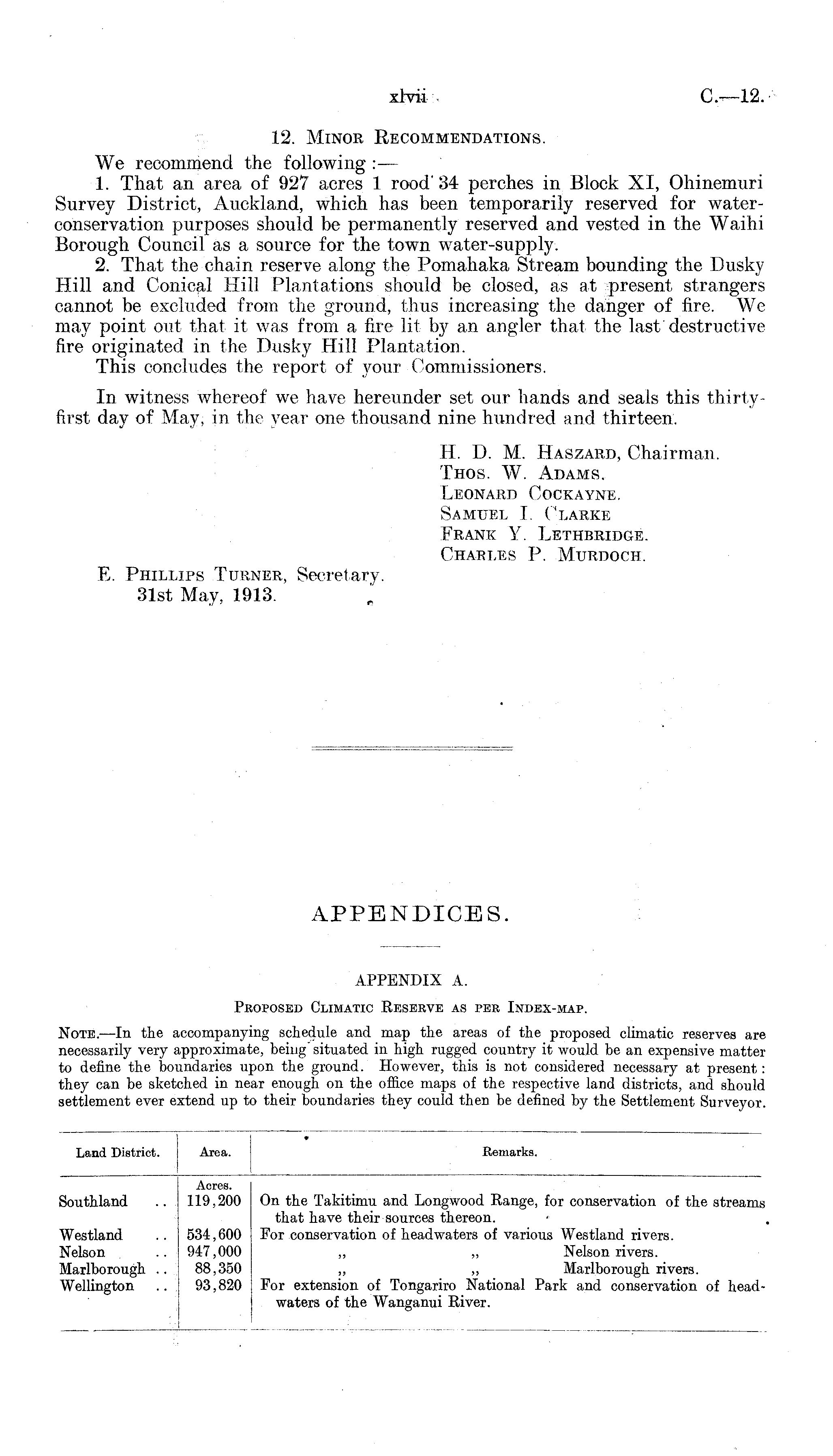 12. Minor Recommendations. We recommend the following : — 1. That an area of 927 acres 1 rood' 34 perches in Block XI, Ohinemnri Survey District, Auckland, which has been temporarily reserved for waterconservation purposes should be permanently reserved and vested in the Waihi Borough Council as a source for the town water-supply. 2. That the chain reserve along the Pomahaka Stream bounding the Dusky Hill and Conical Hill Plantations should be closed, as at present strangers cannot be excluded from the ground, thus increasing the danger of fire. We may point out that it was from a fire lit by an angler that the last destructive fire originated in the Dusky Hill Plantation. This concludes the report of your Commissioners. In witness whereof we have hereunder set our hands and seals this thirty - first day of May, in the year one thousand nine hundred and thirteen. H. D. M. Haszard, Chairman. Thos. W. Adams. Leonard Cockayne. Samuel I. Clarke Frank Y. Lethbridge. Charles P. Murdoch. E. Phillips Turner, Secretary. 31st May, 1913.