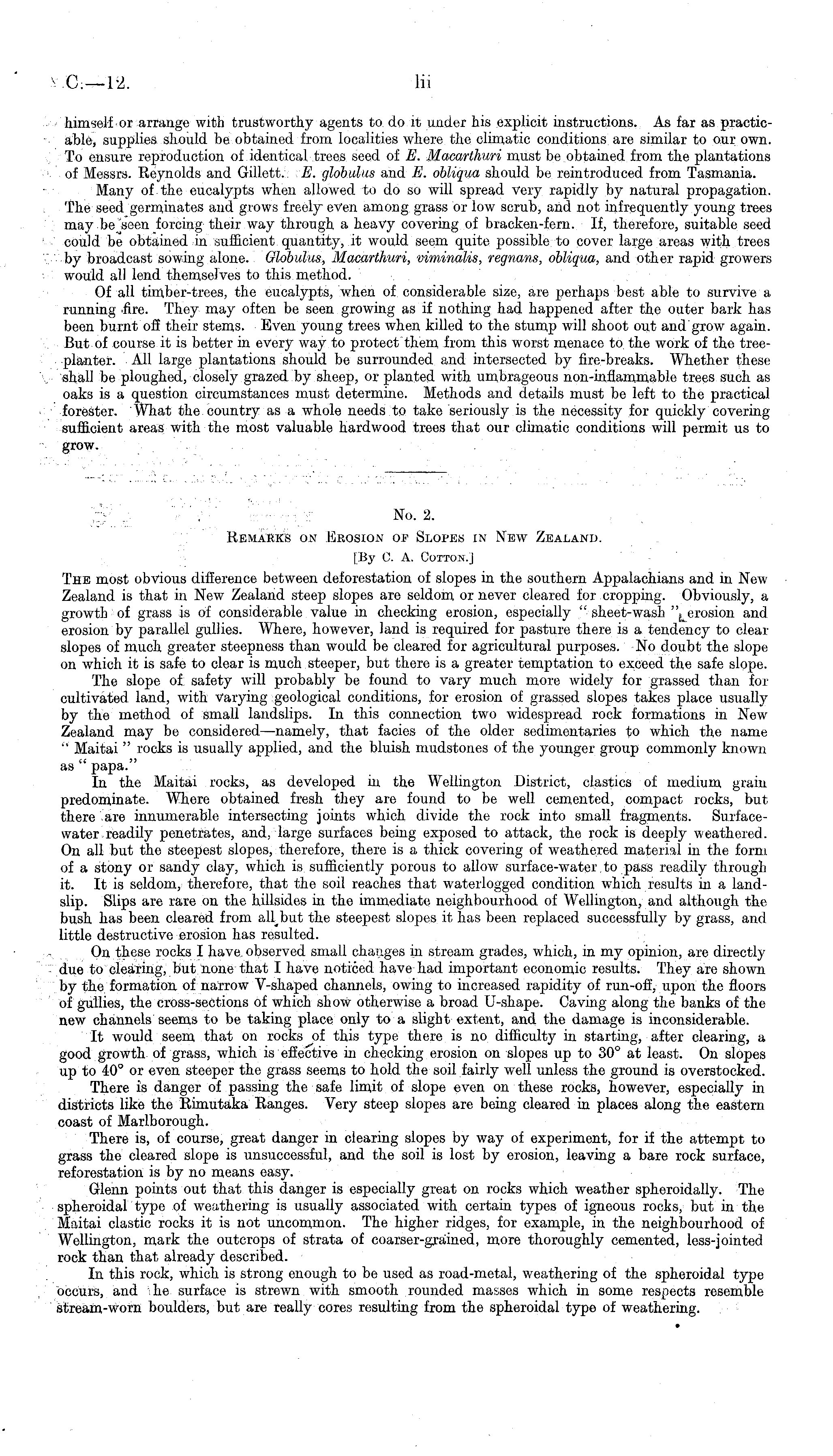 -: : : . ' ' . :: No. 2. Remarks on Erosion oj? Slopes in New Zealand. [By C. A. Cotton.] The most obvious difference between deforestation of slopes in the southern Appalachians and in New Zealand is that in New Zealand steep slopes are seldom or never cleared for cropping. Obviously, a growth of grass is of considerable value in checking erosion, especially " sheet-wash " L erosion and erosion by parallel gullies. Where, however, land is required for pasture there is a tendency to clear slopes of much greater steepness than would be cleared for agricultural purposes. No doubt the slope on which it is safe to clear is much steeper, but there is a greater temptation to exceed the safe slope. The slope of safety will probably be found to vary much more widely for grassed than for cultivated land, with varying geological conditions, for erosion of grassed slopes takes place usually by the method of small landslips. In this connection two widespread rock formations in New Zealand may be considered —namely, that facies of the older sedimentaries to which the name " Maitai " rocks is usually applied, and the bluish mudstones of the younger group commonly known as " papa." In the Maitai rocks, as developed in the Wellington District, elastics of medium grain predominate. Where obtained fresh they are found to be well cemented, compact rocks, but there are innumerable intersecting joints which divide the rock into small fragments. Surfacewater readily penetrates, and, large surfaces being exposed to attack, the rock is deeply weathered. On all but the steepest slopes, therefore, there is a thick covering of weathered material in the form of a stony or sandy clay, which is sufficiently porous to allow surface-water, to pass readily through it. It is seldom, therefore, that the soil reaches that waterlogged condition which results in a landslip. Slips are rare on the hillsides in the immediate neighbourhood of Wellington, and although the bush has been cleared from the steepest slopes it has been replaced successfully by grass, and little destructive erosion has resulted. On these rocks I have observed small changes in stream grades, which, in my opinion, are directly due to clearing, but none that I have noticed have had important economic results. They are shown by the formation of narrow V-shaped channels, owing to increased rapidity of run-oft', upon the floors of gullies, the cross-sections of which show otherwise a broad U-shape. Caving along the banks of the new channels seems to be taking place only to a slight extent, and the damage is inconsiderable. It would seem that on rocks of this type there is no difficulty in starting, after clearing, a good growth of grass, which is effective in checking erosion on slopes up to 30° at least. On slopes up to 40° or even steeper the grass seems to hold the soil fairly well unless the ground is overstocked. There is danger of passing the safe limit of slope even on these rocks, however, especially in districts like the Rimutaka Ranges. Very steep slopes are being cleared in places along the eastern coast of Marlborough. There is, of course, great danger in clearing slopes by way of experiment, for if the attempt to grass the cleared slope is unsuccessful, and the soil is lost by erosion, leaving a bare rock surface, reforestation is by no means easy. Glenn points out that this danger is especially great on rocks which weather spheroidally. The spheroidal type of weathering is usually associated with certain types of igneous rocks, but in the Maitai clastic rocks it is not uncommon. The higher ridges, for example, in the neighbourhood of Wellington, mark the outcrops of strata of coarser-grained, more thoroughly cemented, less-jointed rock than that already described. In this rock, which is strong enough to be used as road-metal, weathering of the spheroidal type "occurs, and ; he surface is strewn with smooth rounded masses which in some respects resemble stream-worn boulders, but are really cores resulting from the spheroidal type of weathering.
