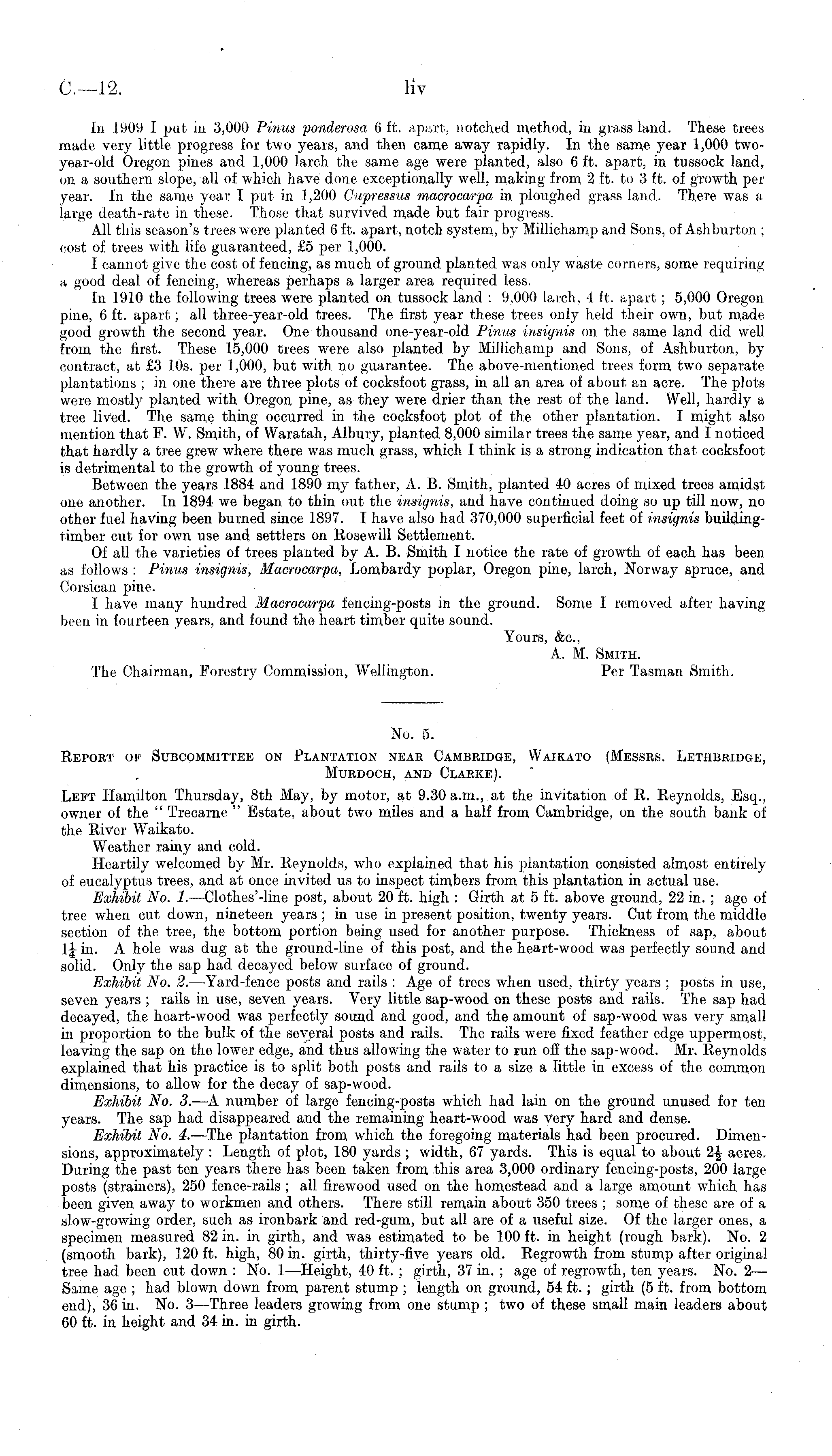 No. 5. Report of Subcommittee on Plantation near Cambridge, Waikato (Messrs. Lethbridue, Murdoch, and Clarke). Left Hamilton Thursday, Bth May, by motor, at 9.30 a.m., at the invitation of R. Reynolds, Esq., owner of the " Trecarne " Estate, about two miles and a half from Cambridge, on the south bank of the River Waikato. Weather rainy and cold. Heartily welcomed by Mr. Reynolds, who explained that his plantation consisted almost entirely of eucalyptus trees, and at once invited us to inspect timbers from this plantation in actual use. Exhibit No. I. —Clothes-line post, about 20 ft. high : Girth at 5 ft. above ground, 22 in. ; age of tree when cut down, nineteen years ; in use in present position, twenty years. Cut from the middle section of the tree, the bottom portion being used for another purpose. Thickness of sap, about 1J in. A hole was dug at the ground-line of this post, and the heart-wood was perfectly sound and solid. Only the sap had decayed below surface of ground. Exhibit No. 2. —Yard-fence posts and rails : Age of trees when used, thirty years ; posts in use, seven years ; rails in use, seven years. Very little sap-wood on these posts and rails. The sap had decayed, the heart-wood was perfectly sound and good, and the amount of sap-wood was very small in proportion to the bulk of the several posts and rails. The rails were fixed feather edge uppermost, leaving the sap on the lower edge, and thus allowing the water to run off the sap-wood. Mr. Reynolds explained that his practice is to split both posts and rails to a size a little in excess of the common dimensions, to allow for the decay of sap-wood. Exhibit No. 3. —A number of large fencing-posts which had lain on the ground unused for ten years. The sap had disappeared and the remaining heart-wood was Very hard and dense. Exhibit No. 4. —The plantation from which the foregoing materials had been procured. Dimensions, approximately : Length of plot, 180 yards ; width, 67 yards. This is equal to about 2J acres. During the past ten years there has been taken from this area 3,000 ordinary fencing-posts, 200 large posts (strainers), 250 fence-rails ; all firewood used on the homestead and a large amount which has been given away to workmen and others. There still remain about 350 trees ; some of these are of a slow-growing order, such as ironbark and red-gum, but all are of a useful size. Of the larger ones, a specimen measured 82 in. in girth, and was estimated to be 100 ft. in height (rough bark). No. 2 (smooth bark), 120 ft. high, 80 in. girth, thirty-five years old. Regrowth from stump after original tree had been cut down : No. I—Height, 40 ft. ; girth, 37 in. ; age of regrowth, ten years. No. 2— Same age ; had blown down from parent stump ; length on ground, 54 ft.; girth (5 ft. from bottom end), 36 in. No. 3—Three leaders growing from one stump ; two of these small main leaders about 60 ft. in height and 34 in. in girth.
