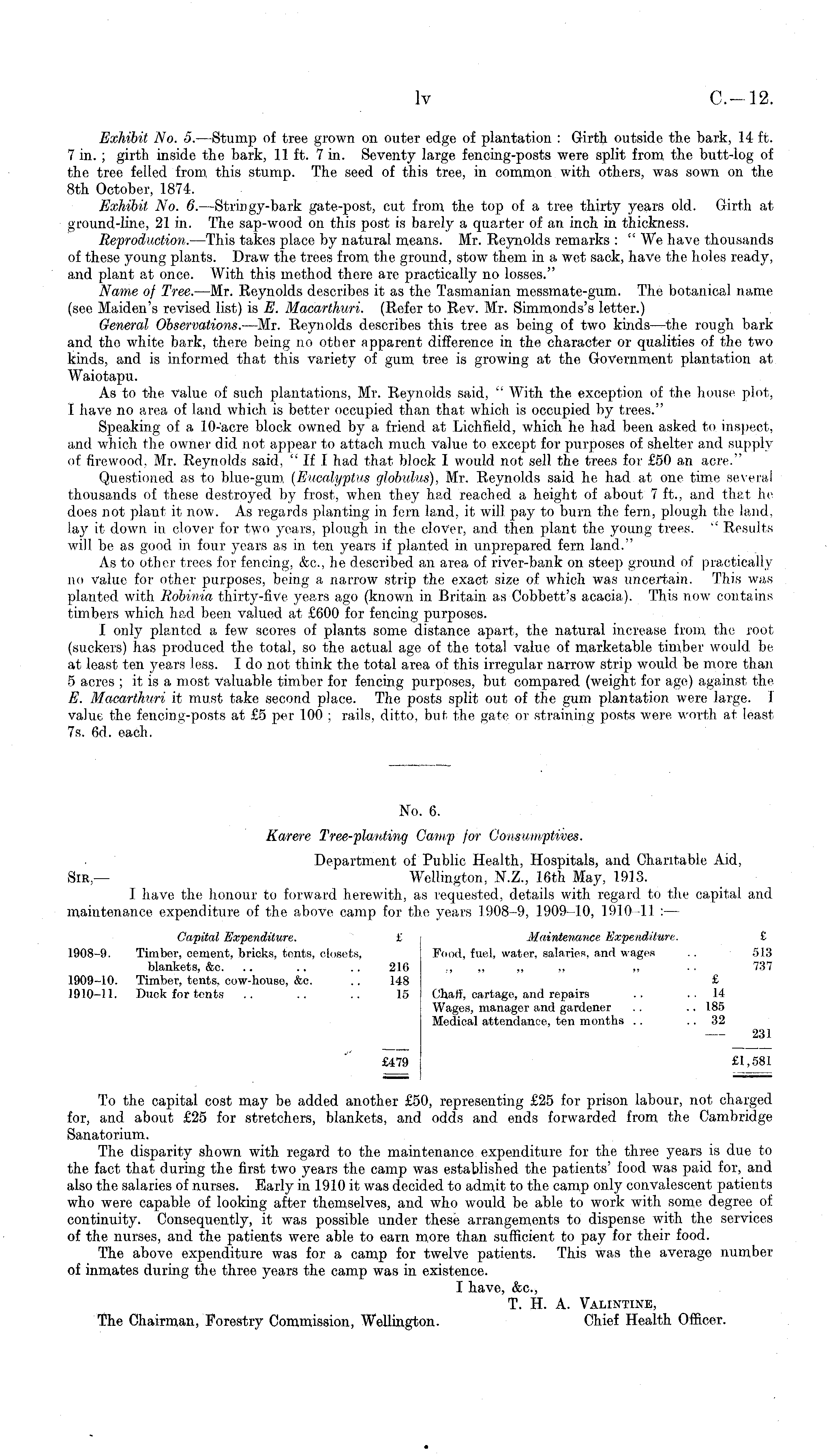 No. 6. Karere Tree-planting Cantq) for Consumptives. Department of Public Health, Hospitals, and Charitable Aid, Sir— Wellington, N.Z., 16th May, 1913. 1 have the honour to forward herewith, as requested, details with regard to the capital and maintenance expenditure of the above camp for the years 1908-9, 1909-10, 1910 11 : — Capital Expenditure. £ Maintenaiice Expenditure. £ 1908-9. Timber, cement, bricks, tents, closets, Food, fuel, water, salaries, and wages .. 513 blankets, &c. .. .. .. 216 ~ „ ~ ~ ~ •■ 737 1909-10. Timber, tents, cow-house, &c. 148 £ 1910-11. Duck for tents .. .. .. 15 Chalf, cartage, and repairs .. ..14 Wages, manager and gardener . ... 185 Medical attendance, ten months .. 32 231 £479 £1,581 To the capital cost may be added another £50, representing £25 for prison labour, not charged for, and about £25 for stretchers, blankets, and odds and ends forwarded from the Cambridge Sanatorium. The disparity shown with regard to the maintenance expenditure for the three years is due to the fact that during the first two years the camp was established the patients' food was paid for, and also the salaries of nurses. Early in 1910 it was decided to admit to the camp only convalescent patients who were capable of looking after themselves, and who would be able to work with some degree of continuity. Consequently, it was possible under these arrangements to dispense with the services of the nurses, and the patients were able to earn more than sufficient to pay for their food. The above expenditure was for a camp for twelve patients. This was the average number of inmates during the three years the camp was in existence. I have, &c, T. H. A. Valintinb, The Chairman, Forestry Commission, Wellington. Chief Health Officer.