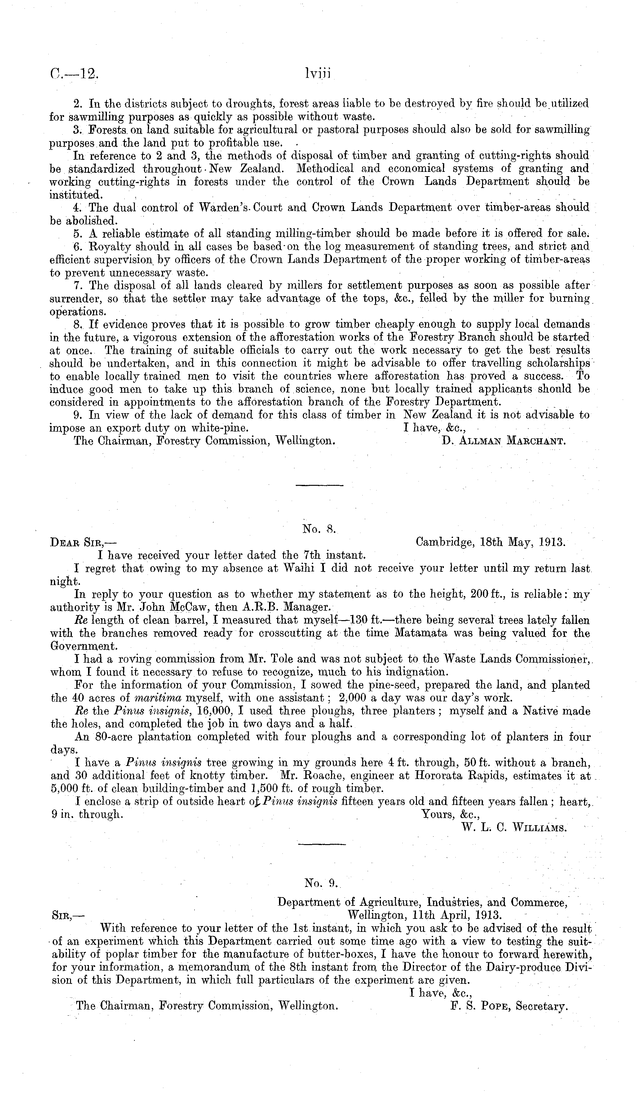 No. 8. Dear Sir,— Cambridge, 18th May, 1913. I have received your letter dated the 7th instant. I regret that owing to my absence at Waihi I did not receive your letter until my return last night. In reply to your question as to whether my statement as to the height, 200 ft., is reliable: my authority is Mr. John McCaw, then A.R.B. Manager. Re length of clean barrel, I measured that myself —130 ft. —there being several trees lately fallen with the branches removed ready for crosscutting at the time Matamata was being valued for the Government. I had a roving commission from Mr. Tole and was not subject to the Waste Lands Commissioner, whom I found it necessary to refuse to recognize, much to his indignation. For the information of your Commission, I sowed the pine-seed, prepared the land, and planted the 40 acres of maritima myself, with one assistant; 2,000 a day was our day's work. Re the Pinus insignis, 16,000, I used three ploughs, three planters ; myself and a Native made the holes, and completed the job in two days and a half. An 80-acre plantation completed with four ploughs and a corresponding lot of planters in four days. I have a Pinus insignis tree growing in my grounds here 4 ft. through, 50 ft. without a branch, and 30 additional feet of knotty timber. Mr. Roache, engineer at Hororata Rapids, estimates it at 5,000 ft. of clean building-timber and 1,500 ft. of rough timber. I enclose a strip of outside heart of, Pinus insignis fifteen years old and fifteen years fallen; heart, 9 in. through. Yours, &c, W. L. C. Williams.