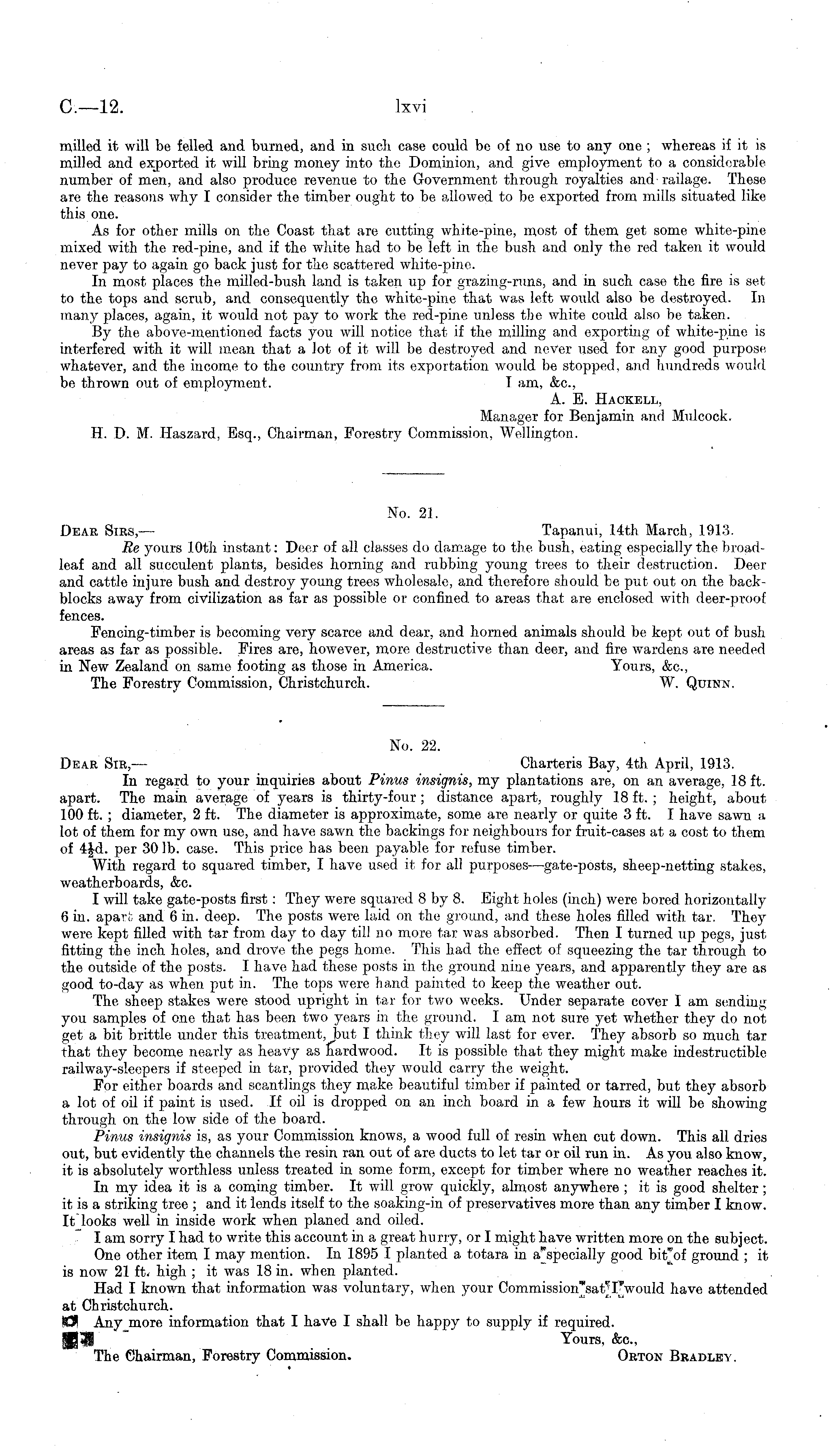 milled it will be felled and burned, and in such case could be of no use to any one ; whereas if it is milled and exported it will bring money into the Dominion, and give employment to a considerable number of men, and also produce revenue to the Government through royalties and-railage. These are the reasons why I consider the timber ought to be allowed to be exported from mills situated like this one. As for other mills on the Coast that are cutting white-pine, most of thorn get some white-pine mixed with the red-pine, and if the white had to be left in the bush and only the rod taken it would never pay to again go back just for the scattered white-pine. In most places the milled-bush land is taken up for grazing-runs, and in such case the fire is set to the tops and scrub, and consequently the white-pine that was left would also be destroyed. In many places, again, it would not pay to work the red-pine unless the white could also be taken. By the above-mentioned facts you will notice that if the milling and exporting of white-pine is interfered with it will mean that a lot of it will be destroyed and never used for any good purpose whatever, and the income to the country from its exportation would be stopped, and hundreds would be thrown out of employment. T am, &c, A. E. Hackell, Manager for Benjamin and Mulcock. H. D. M. Haszard, Esq., Chairman, Forestry Commission, Wellington.