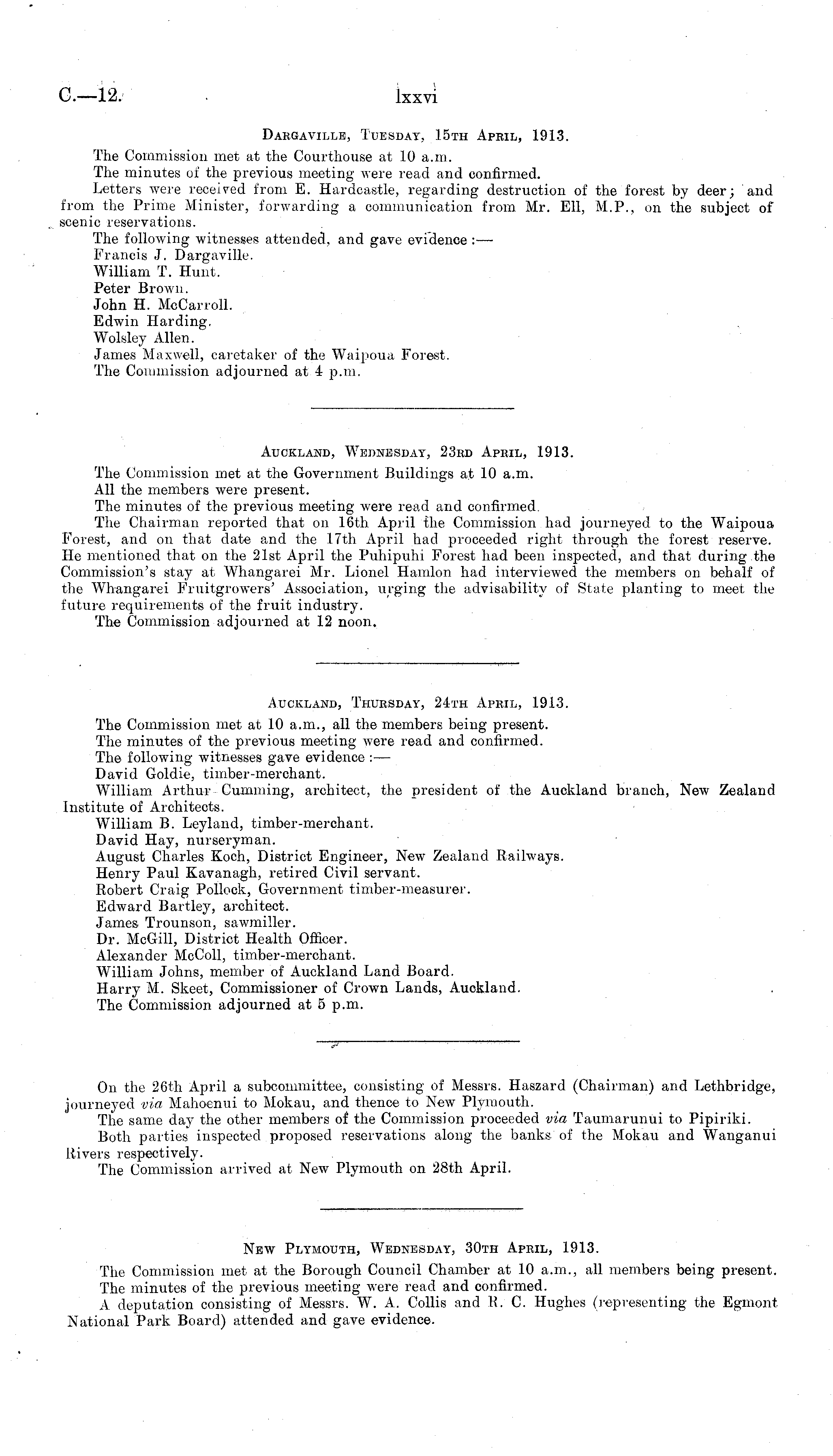 Dargavillb, Tuesday, 15th April, 1913. The Commission met at the Courthouse at 10 a.m. The minutes of the previous meeting were read and confirmed. Letters were received from E. Hardcastle, regarding destruction of the forest by deer; and from the Prime Minister, forwarding a communication from Mr. Ell, M.P., on the subject of scenic reservations. The following witnesses attended, and gave evidence : — Francis J. Dargaville. William T. Hunt. Peter Brown. John H. McCarroll. Edwin Harding. Wolsley Allen. James Maxwell, caretaker of the Waipoua Forest. The Commission adjourned at 4 p.m.
