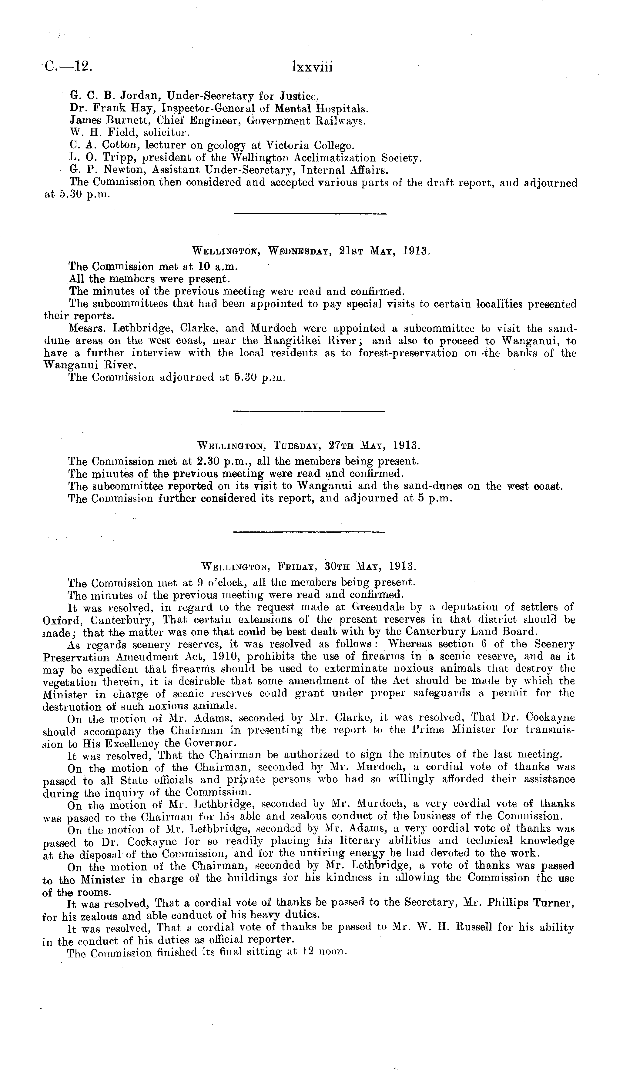 Wellington, Friday, 30th May, 1913. The Commission met at 9 o'clock, all the members being present. The minutes of the previous meeting were read and confirmed. It was resolved, in regard to the request made at Greendale by a deputation of settlers of Oxford, Canterbury, That certain extensions of the present reserves in that district should be made; that the matter was one that could be best dealt with by the Canterbury Land Board. As regards scenery reserves, it was resolved as follows : Whereas section 6 of the Scenery Preservation Amendment Act, 1910, prohibits the use of firearms in a scenic reserve, and as it may be expedient that firearms should be used to exterminate noxious animals that destroy the vegetation therein, it is desirable that some amendment of the Act should be made by which the Minister in charge of scenic reserves could grant under proper safeguards a permit for the destruction of such noxious animals. On the motion of Mr. Adams, seconded by Mr. Clarke, it was resolved, That Dr. Cockayne should accompany the Chairman in presenting the report to the Prime Minister for transmission to His Excellency the Governor. It was resolved, That the Chairman be authorized to sign the minutes of the last meeting. On the motion of the Chairman, seconded by Mr. Murdoch, a cordial vote of thanks was passed to all State officials and private persons who had so willingly afforded their assistance during the inquiry of the Commission. On the motion of Mr. Lethbridge, seconded by Mr. Murdoch, a very cordial vote of thanks was passed to the Chairman for his able and zealous conduct of the business of the Commission. On the motion of Mr. Lethbridge, seconded by Mr. Adams, a very cordial vote of thanks was passed to Dr. Cockayne for so readily placing his literary abilities and technical knowledge at the disposal of the Commission, and for the untiring energy he had devoted to the work. On the motion of the Chairman, seconded by Mr. Lethbridge, a vote of thanks was passed to the Minister in charge of the buildings for his kindness in allowing the Commission the use of the rooms. It was resolved, That a cordial vote of thanks be passed to the Secretary, Mr. Phillips Turner, for his zealous and able conduct of his heavy duties. It was resolved, That a cordial vote of thanks be passed to Mr. W. H. Russell for his ability in the conduct of his duties as official reporter. The Commission finished its final sitting at 12 noon.