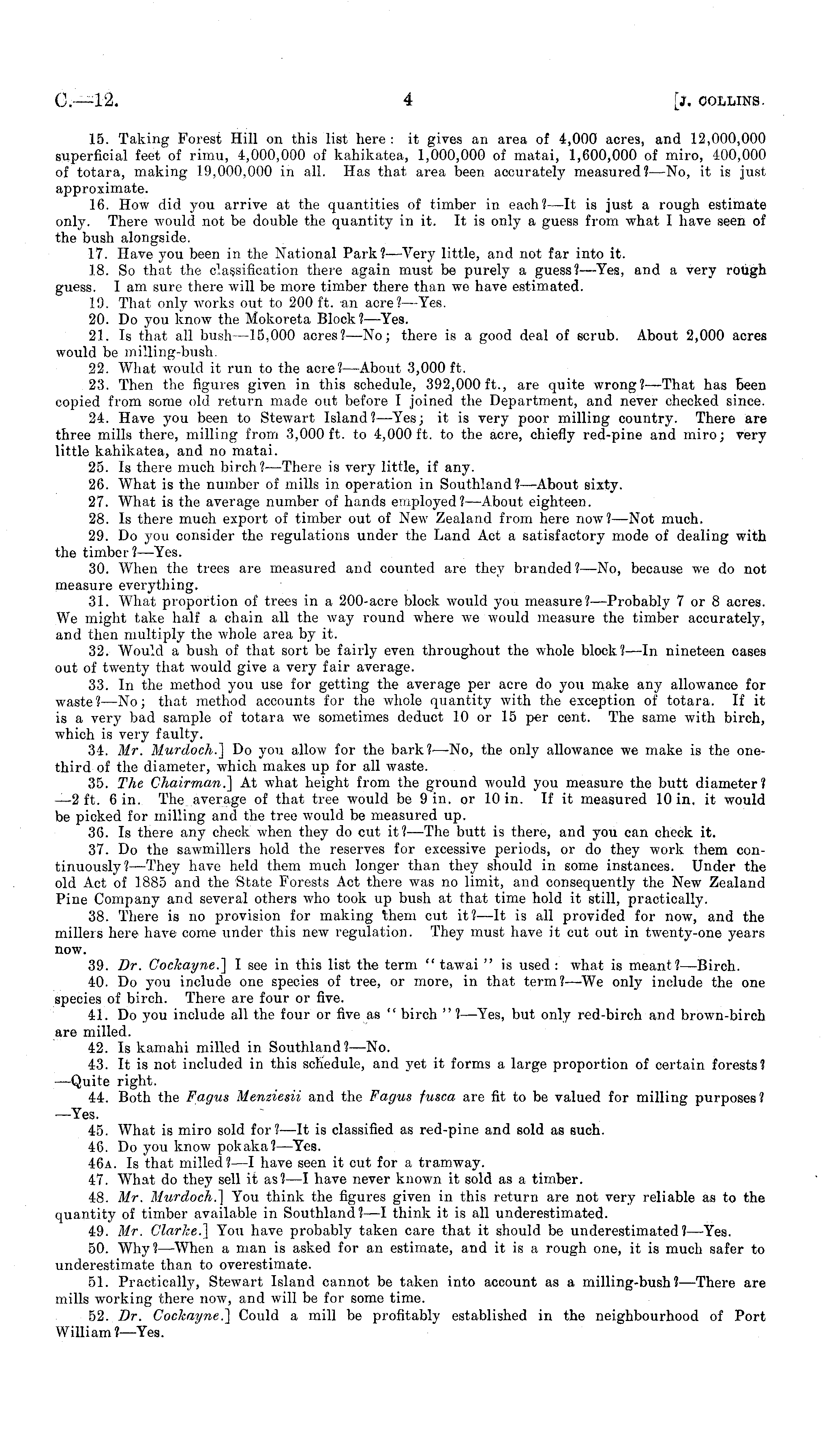 15. Taking Forest Hill on this list here : it gives an area of 4,000 acres, and 12,000,000 superficial feet of rimu, 4,000,000 of kahikatea, 1,000,000 of matai, 1,600,000 of miro, 100,000 of totara, making 19,000,000 in all. Has that area been accurately measured? —No, it is just approximate. 16. How did you arrive at the quantities of timber in each?—lt is just a rough estimate only. There would not be double the quantity in it. It is only a guess from what I have seen of the bush alongside. 17. Have you been in the National Park? —Very little, and not far into it. 18. So that the classification there again must be purely a guess?— Yes, and a very rough guess. lam sure there will be more timber there than we have estimated. 19. That only works out to 200 ft. an acre?— Yes. 20. Do you know the Mokoreta Block? —Yes. 21. Is that all bush —15,000 acres?—No; there is a good deal of scrub. About 2,000 acres would be milling-bush. 22. What would it run to the acre? —About 3,000 ft. 23. Then the figures given in this schedule, 392,000 ft., are quite wrong?— That has Been copied from some old return made out before I joined the Department, and never checked since. 24. Have you been to Stewart Island? —Yes; it is very poor milling country. There are three mills there, milling from 3,000 ft. to 4,000 ft. to the acre, chiefly red-pine and miro; very little kahikatea, and no matai. 25. Is there much birch?— There is very little, if any. 26. What is the number of mills in operation in Southland?— About sixty. 27. What is the average number of hands employed? —About eighteen. 28. Is there much export of timber out of New Zealand from here now?— Not much. 29. Do you consider the regulations under the Land Act a satisfactory mode of dealing with the timber? —Yes. 30. When the trees are measured and counted are they branded?—No, because we do not measure everything. 31. What proportion of trees in a 200-acre block would you measure?— Probably 7 or 8 acres. We might take half a chain all the way round where we would measure the timber accurately, and then multiply the whole area by it. 32. Would a bush of that sort be fairly even throughout the whole block? —In nineteen cases out of twenty that would give a very fair average. 33. In the method you use for getting the average per acre do you make any allowance for waste?—No; that method accounts for the whole quantity with the exception of totara. If it is a very bad sample of totara we sometimes deduct 10 or 15 per cent. The same with birch, which is very faulty. 34. Mr. Murdoch.] Do you allow for the bark?—No, the only allowance we make is the onethird of the diameter, which makes up for all waste. 35. The Chairman.] At what height from the ground would you measure the butt diameter? —2 ft. 6 in. The average of that tree would be 9 in. or 10 in. If it measured 10 in. it would be picked for milling and the tree would be measured up. 36. Is there any check when they do cut it? —The butt is there, and you can check it. 37. Do the sawmillers hold the reserves for excessive periods, or do they work them continuously? —They have held them much longer than they should in some instances. Under the old Act of 1885 and the 'State Forests Act there was no limit, and consequently the New Zealand Pine Company and several others who took up bush at that time hold it still, practically. 38. There is no provision for making them cut it? —It is all provided for now, and the millers here have come under this new regulation. They must have it cut out in twenty-one years now. 39. Dr. Cockayne.] I see in this list the term " tawai " is used : what is meant? —Birch. 40. Do you include one species of tree, or more, in that term? —We only include the one species of birch. There are four or five. 41. Do you include all the four or five as " birch " ?—Yes, but only red-birch and brown-birch are milled. 42. Is kamahi milled in Southland? —No. 43. It is not included in this schedule, and yet it forms a large proportion of certain forests? —Quite right. 44. Both the Fagus Menziesii and the Fagus fusca are fit to be valued for milling purposes? —Yes. 45. What is miro sold for? —It is classified as red-pine and sold as such. 46. Do you know pokaka?—Yes. 46a. Is that milled? —I have seen it cut for a tramway. 47. What do they sell it as? —I have never known it sold as a timber. 48. Mr. Murdoch.] You think the figures given in this return are not very reliable as to the quantity of timber available in Southland? —I think it is all underestimated. 49. Mr. Clarke.] You have probably taken care that it should be underestimated? —Yes. 50. Why? —When a man is asked for an estimate, and it is a rough one, it is much safer to underestimate than to overestimate. 51. Practically, Stewart Island cannot be taken into account as a milling-bush? —There are mills working there now, and will be for some time. 52. Dr. Cockayne.] Could a mill be profitably established in the neighbourhood of Port William?— Yes.