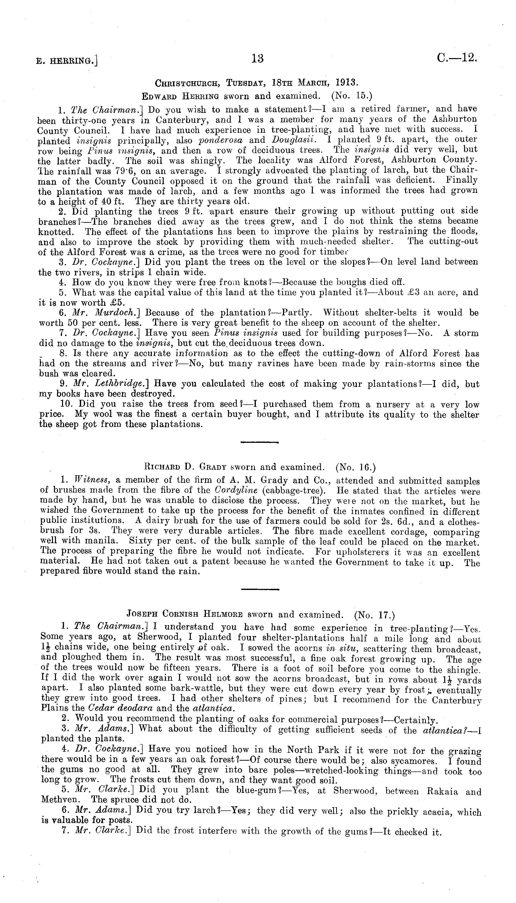 Christchurch, Tuesday, 18th March, 1913. Edward Herring sworn and examined. (No. 15.) 1. The Chairman.] Do you wish to make a statement? —I am a retired farmer, and have been thirty-one years in Canterbury, and I was a member for many years of the Ashburton County Council. I have had much experience in tree-planting, and have met with success. I planted insignis principally, also ponderosa and Bouglasii. I planted 9 ft. apart, the outer row being Finns insignis, and then a row of deciduous trees. The insignis did very well, but the latter badly. The soil was shingly. The locality was Alford Forest, Ashburton County. The rainfall was 796, on an average. I strongly advocated the planting of larch, but the Chairman of the County Council opposed it on the ground that the rainfall was deficient. Finally the plantation was made of larch, and a few months ago 1 was informed the trees had grown to a height of 40 ft. They are thirty years old. 2. Did planting the trees 9 ft. apart ensure their growing up without putting out side branches? —The branches died away as the trees grew, and I do not think the stems became knotted. The effect of the plantations has been to improve the plains by restraining the floods, and also to improve the stock by providing them with much-needed shelter. The cutting-out of the Alford Forest was a crime, as the trees were no good for timber , 3. Dr. Cockayne.] Did you plant the trees on the level or the slopes?—On level land between the two rivers, in strips 1 chain wide. 4. How do you know they were free from knots? —Because the boughs died off. 5. What was the capital value of this land at the time you planted it?— About £3 an acre, and it is now worth £5. 6. Mr. Murdoch.] Because of the plantation? —Partly. Without shelter-belts it would be worth 50 per cent. less. There is very great benefit to the sheep on account of the shelter. 7. Dr. Cockayne.] Have you seen Pinus insignis used for building purposes? —No. A storm did no damage to the insignis, but cut the.deciduous trees down. 8. Is there any accurate information as to the effect the cutting-down of Alford Forest has had on the streams and river? —No, but many ravines have been made by rain-storms since the bush was cleared. 9. Mr. Lethbridge.] Have you calculated the cost of making your plantations?—l did, but my books have been destroyed. 10. Did you raise the trees from seed? —I purchased them from a nursery at a very low price. My wool was the finest a certain buyer bought, and I attribute its quality to the shelter the sheep got from these plantations.