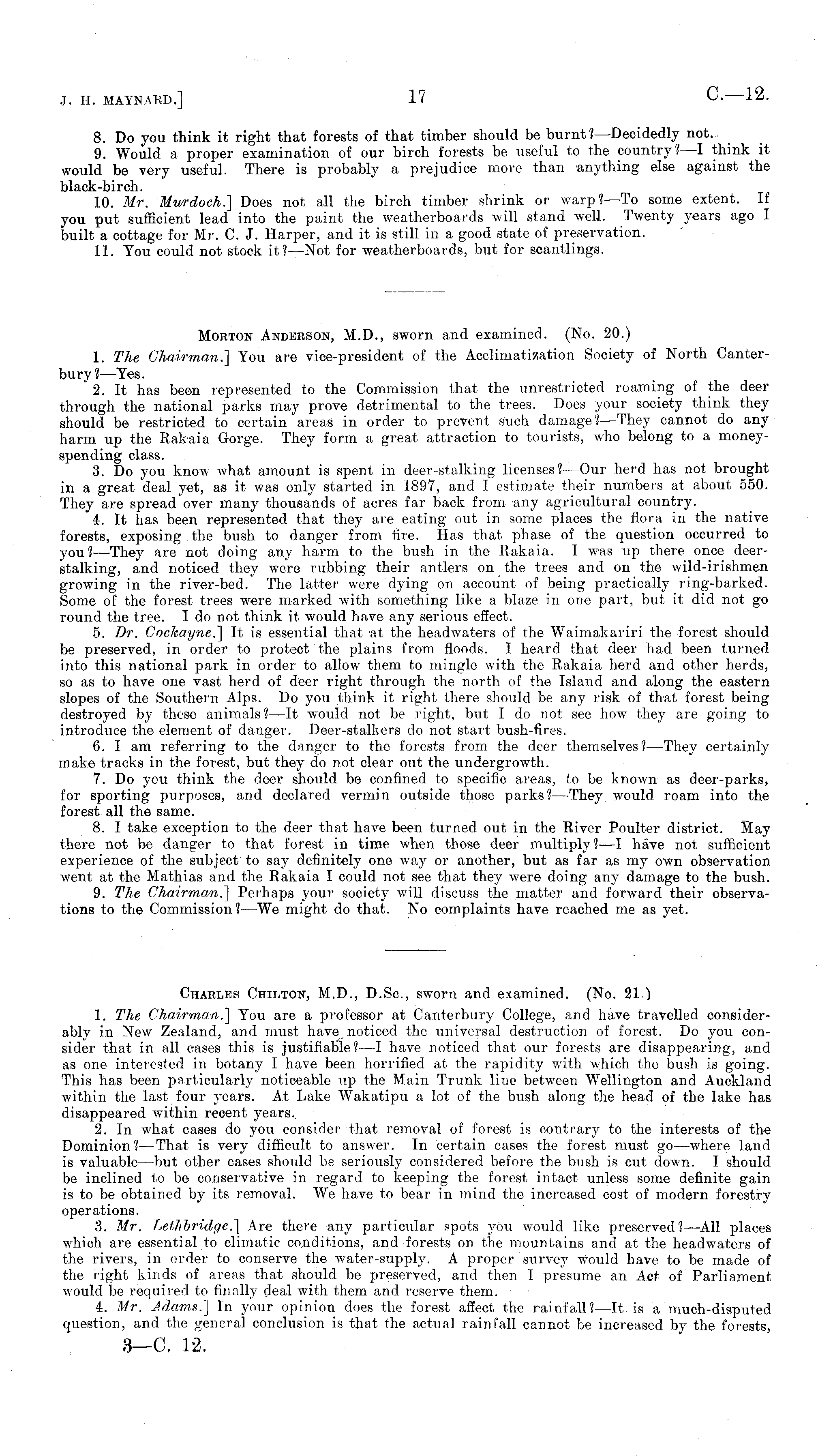 8. Do you think it right that forests of that timber should be burnt? —Decidedly not. 9. Would a proper examination of our birch forests be useful to the country?—l think it would be very useful. There is probably a prejudice more than anything else against the black-birch. 10. Mr. Murdoch.] Does not all the birch timber shrink or warp? —To some extent. If you put sufficient lead into the paint the weatherboards will stand well. Twenty years ago I built a cottage for Mr. C. J. Harper, and it is still in a good state of preservation. 11. You could not stock it? —Not for weatherboards, but for scantlings.