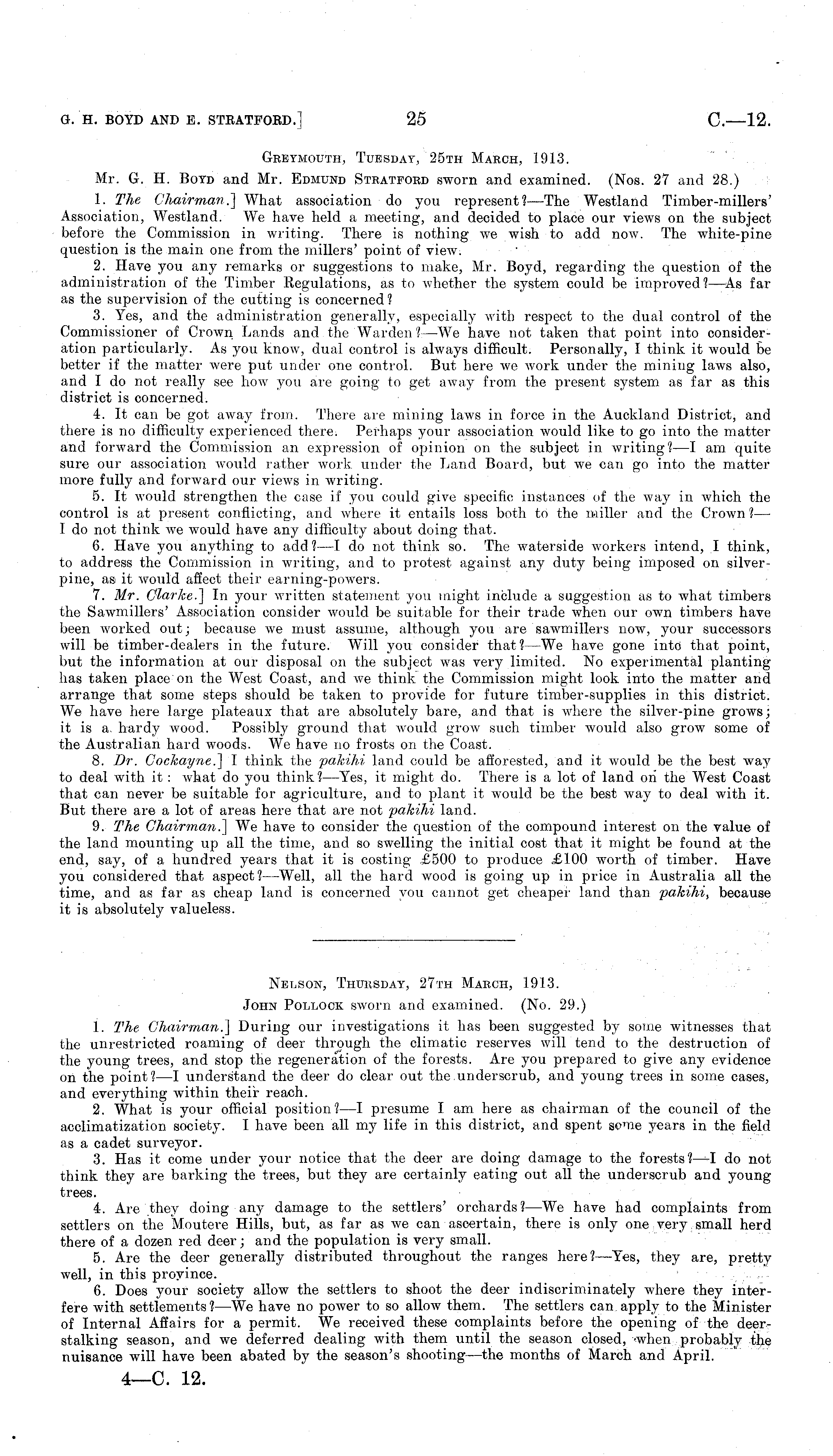 Nelson, Thursday, 27th March, 1913. John Pollock sworn and examined. (No. 29.) 1. The. Chairman.] During our investigations it has been suggested by some witnesses that the unrestricted roaming of deer through the climatic reserves will tend to the destruction of the young trees, and stop the regeneration of the forests. Are you prepared to give any evidence on the point? —I understand the deer do clear out the underscrub, and young trees in some cases, and everything within their reach. 2. What is your official position? —I presume I am here as chairman of the council of the acclimatization society. I have been all my life in this district, and spent some years in the field as a cadet surveyor. 3. Has it come under your notice that the deer are doing damage to the forests? —I do not think they are barking the trees, but they are certainly eating out all the underscrub and young trees. 4. Are they doing any damage to the settlers' orchards?—We have had complaints from settlers on the Moutere Hills, but, as far as we can ascertain, there is only one very small herd there of a dozen red deer; and the population is very small. 5. Are the deer generally distributed throughout the ranges here? —Yes, they are, pretty well, in this province. 6. Does your society allow the settlers to shoot the deer indiscriminately where they interfere with settlements? —We have no power to so allow them. The settlers can apply to the Minister of Internal Affairs for a permit. We received these complaints before the opening of the deerstalking season, and we deferred dealing with them until the season closed, <when probably the nuisance will have been abated by the season's shooting—the months of March and April.