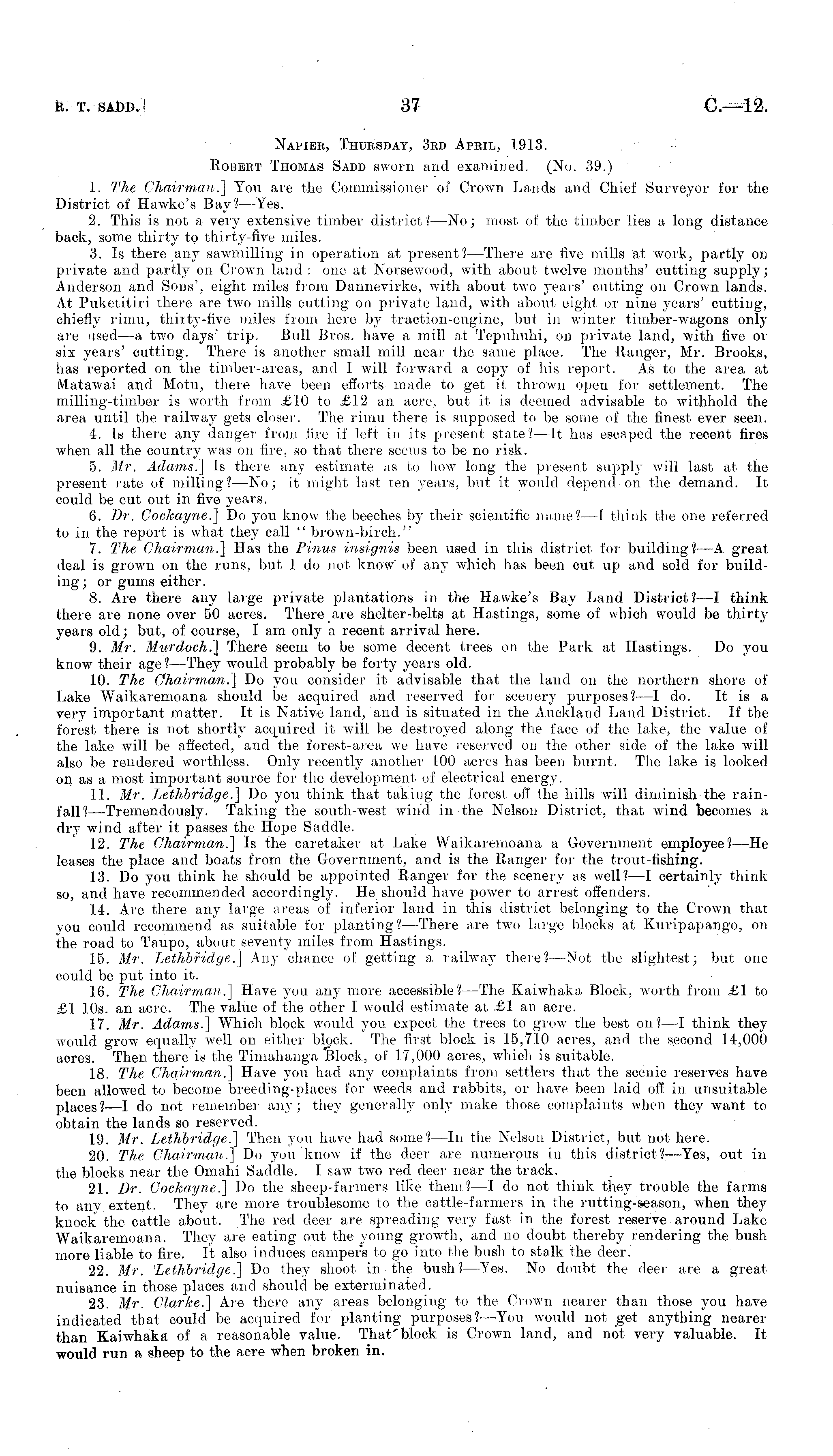 Napier, Thursday, 3rd Apeil, 1913. Robert Thomas Sadd sworn and examined. (No. 39.) 1. The Chairman.] You are the Commissioner of Crown Lands and Chief Surveyor for the District of Hawke's Bay? —Yes. 2. This is not a very extensive timber district?—No; most of the timber lies a long distance back, some thirty to thirty-five miles. 3. Is there any sawmilling in operation at present?— There are five mills at work, partly on private and partly on Crown laud : one at Norsewood, with about twelve months' cutting supply; Anderson and Sons', eight miles from Dannevirke, with about two years' cutting on Crown lands. At Puketitiri there are two mills cutting on private laud, with about eight or nine years' cutting, chiefly riimi, thirty-five miles from here by traction-engine, but in winter timber-wagons only are used —a two days' trip. Bull Bros, have a mill at. Tepuhuhi, on private land, with five or six years' cutting. There is another small mill near the same place. The Ranger, Mr. Brooks, has reported on the timber-areas, and I will forward a copy of his report. As to the area at Matawai and Motu, there have been efforts made to get it thrown open for settlement. The milling-timber is worth from £10 to ,£l2 an acre, but it is deemed advisable to withhold the area until the railway gets closer. The rimu there is supposed to be some of the finest ever seen. 4. Is there any danger from fire if left in its present state? —It has escaped the recent fires when all the country was on fire, so that there seems to be no risk. 5. Mr. Adams.] Is there any estimate as to how long the present supply will last at the present rate of milling?—No; it might last ten years, but it would depend on the demand. It could be cut out in five years. 6. Br. Cockayne.] Do you know (lie beeches by their scientific name? —I think the one referred to in the report is what they call " brown-birch." 7. The Chairman.] Has the Pinus intsignis been used in this district for building?—A great deal is grown on the runs, but I do not know of any which has been cut up and sold for building; or gums either. 8. Are there any large private plantations in the Hawke's Bay Land District? —I think there are none over 50 acres. There are shelter-belts at Hastings, some of which would be thirty years old; but, of course, I am only a recent arrival here. 9. Mr. Murdoch.] There seem to be some decent trees on the Park at Hastings. Do you know their age ?—They would probably be forty years old. 10. The Chairman.] Do you consider it advisable that the laud on the northern shore of Lake Waikaremoana should be acquired and reserved for scenery purposes? —1 do. It is a very important matter. It is Native laud, and is situated in the Auckland Land District. If the forest there is not shortly acquired it will be destroyed along the face of the lake, the value of the lake will be affected, and the forest-area we have reserved on the other side of the lake will also be rendered worthless. Only recently another 100 acres has been burnt. The lake is looked on as a most important source for the development of electrical energy. 11. Mr. Lethbridge.] Do you think that taking the forest off the hills will diminish the rainfall? —Tremendously. Taking the south-west wind in the Nelson District, that wind becomes a dry wind after it passes the Hope Saddle. 12. The Chairman.] Is the caretaker at Lake Waikaremoana a Government employee? —He leases the place and boats from the Government, and is the Ranger for the trout-fishing. 13. Do you think he should be appointed Ranger for the scenery as well? —I certainly think so, and have recommended accordingly. He should have power to arrest offenders. 14. Are there any large areas of inferior land in this district belonging to the Crown that you could recommend as suitable for planting?— There are two large blocks at Kuripapango, on the road to Taupo, about seventy miles from Hastings. 15. Mr. Lethbridge.] Any chance of getting a railway there? —Not the slightest; but one could be put into it. 16. The Chairman.] Have you any more accessible? —The Kaiwhaka Block, worth from £1 to £1 10s. an acre. The value of the other I would estimate at £1 an acre. 17. Mr. Adams.] Which block would you expect the trees to grow the best on?— 1 think they would grow equally well on either block. The first block is 15,710 acres, and the second 14,000 acres. Then there is the Timahanga Block, of 17,000 acres, which is suitable. 18. The Chairman.] Have you had any complaints from settlers that the scenic reserves have been allowed to become breeding-places for weeds and rabbits, or have been laid off in unsuitable places?—l d 0 not remember any; they generally only make those complaints when they want to obtain the lands so reserved. 19. Mr. Lethbridge.] Then you have had some? —In the Nelson District, but not here. 20. The. Chairman.] Do you know if the deer are numerous in this district? —Yes, out in the blocks near the Omahi Saddle. I saw two red deer near the track. 21. Dr. Cockayne.] Do tile sheep-farmers like them?—l do not think they trouble the farms to any extent. They are more troublesome to the cattle-farmers in the rutting-season, when they knock the cattle about. The red deer are spreading , very fast in the forest reserve around Lake Waikaremoana. They are eating out the young growth, and no doubt thereby rendering the bush more liable to fire. It also induces campers to go into the bush to stalk the deer. 22. Mr. Lethbridge.] Do they shoot in the bush? —Yes. No doubt the deer are a great nuisance in those places and should be exterminated. 23. Mr. Clarke.] Are there any areas belonging to the Crown nearer than those you have indicated that could be acquired for planting purposes?— You would not get anything nearer than Kaiwhaka of a reasonable value. That'block is Crown land, and not very valuable. It would run a sheep to the acre when broken in.