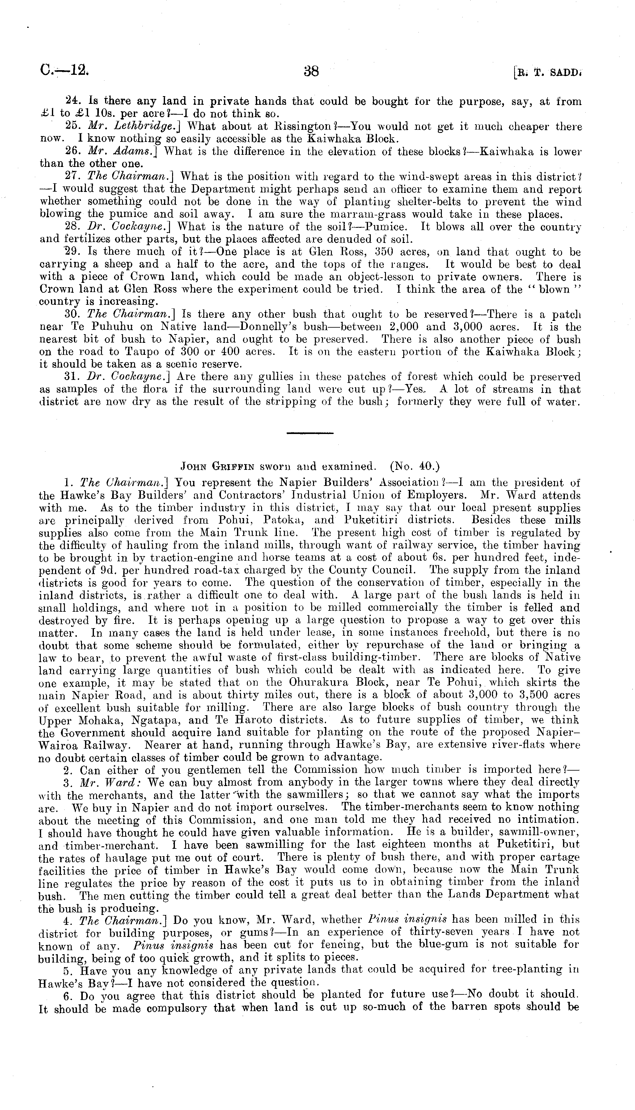 John Griffin sworn and examined. (No. 40.) 1. The Chairman.] You represent the Napier Builders' Association 'I —l am the president of the Hawke's Bay Builders' and Contractors' Industrial Union of Employers. Mr. Ward attends with me. As to the timber industry in this district, I may say that our local present supplies a,re principally derived from Pohui, Patoka, and Puketitiri districts. Besides these mills supplies also come from the Main Trunk line. The present high cost of timber is regulated by the difficulty of hauling from the inland mills, through want of railway service, the timber having to be brought in by traction-engine and horse teams at a cost of about 6s. per hundred feet, independent of 9d. per hundred road-tax charged by the County Council. The supply from the inland districts is good for years to come. The question of the conservation of timber, especially in the inland districts, is rather a difficult one to deal with. A large part of the busli lands is held in small holdings, and where not in a position to be milled commercially the timber is felled and destroyed by fire. It is perhaps opening up a large question to propose a way to get over this matter. In many cases the land is held under lease, in some instances freehold, but there is no doubt that some scheme should be formulated, either by repurchase of the land or bringing a law to bear, to prevent the awful waste of first-class building-timber. There are blocks of Native land carrying large quantities of bush which could be dealt with as indicated here. To give one example, it may be stated that on the Ohurakura Block, near Te Pohui, which skirts the main Napier Road, and is about thirty miles out, there is a block of about 3,000 to 3,500 acres of excellent bush suitable for milling. There are also large blocks of bush country through the Upper Mohaka, Ngatapa, and Te Haroto districts. As to future supplies of timber, we think the Government should acquire land suitable for planting on the route of the proposed NapierWairoa Railway. Nearer at hand, running through Hawke's Bay, are extensive river-flats where no doubt certain classes of timber could be grown to advantage. 2. Can either of you gentlemen tell the Commission how much timber is imported here?— 3. Mr. Ward: We can buy almost from anybody in the larger towns where they deal directly with the merchants, and the latter with the sawmillers; so that we cannot say what the imports are. We buy in Napier and do not import ourselves. The timber-merchants seem to know nothing about the meeting of this Commission, and one man told me they had received no intimation. I should have thought he could have given valuable information. He is a builder, sawmill-owner, and timber-merchant. I have been sawmilling for the last eighteen months at Puketitiri, but the rates of haulage put me out of court. There is plenty of bush there, and with proper cartage facilities the price of timber in Hawke's Bay would come down, because now the Main Trunk line regulates the price by reason of the cost it puts us to in obtaining timber from the inland bush. The men cutting the timber could tell a great deal better than the Lands Department what the bush is producing. 4. The Chairman.] Do you know, Mr. Ward, whether Finns insignis has been milled in this district for building purposes, or gums?—ln an experience of thirty-seven years I have not known of any. Pinus insignis has been cut for fencing, but the blue-gum is not suitable for building, being of too quick growth, and it splits to pieces. 5. Have you any knowledge of any private lands that could be acquired for tree-planting in Hawke's Bay?—l have not considered the question. 6. Do you agree that this district should be planted for future use? —No doubt it should. It should be made compulsory that when land is cut up so-much of the barren spots should be