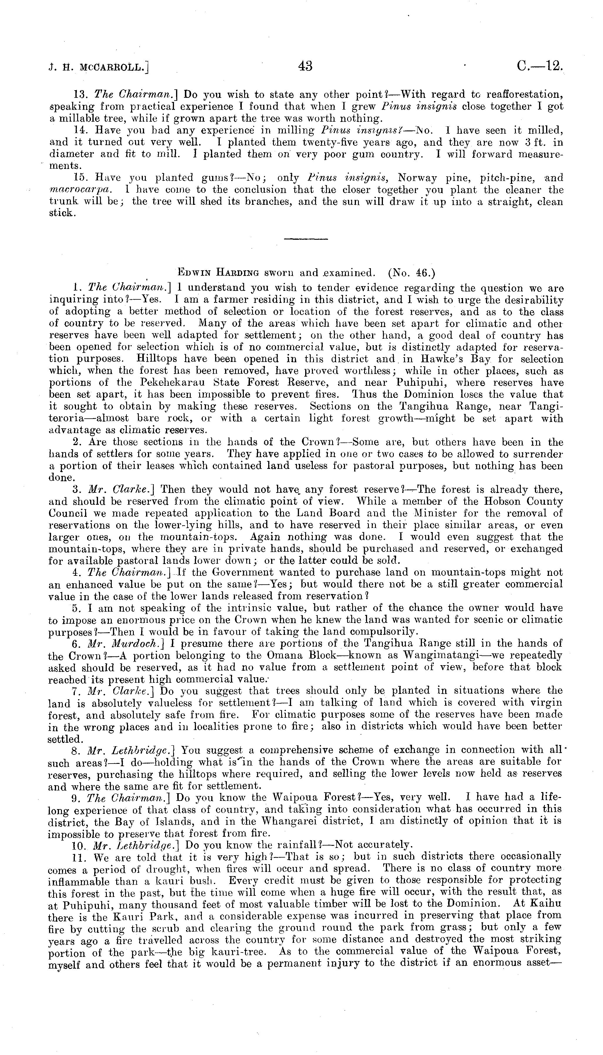 Edwin Habding sworu and .examined. (No. 46.) 1. The Chairman.] 1 understand you wish to tender evidence regarding the question we are inquiring into ? —Yes. I am a farmer residing in this district, and I wish to urge the desirability of adopting a better method of selection or location of the forest reserves, and as to the class of country to be reserved. Many of the areas which have been set apart for climatic and othei reserves have been well adapted for settlement; on the other hand, a good deal of country has been opened for selection which is of no commercial value, but is distinctly adapted for reservation purposes. Hilltops have been opened in this district and in Hawke's Bay for selection which, when the forest has been removed, have proved worthless; while in other places, such as portions of the Pekehekarau State Forest Reserve, and near Puhipuhi, where reserves have been set apart, it has been impossible to prevent fires. Thus the Dominion loses the value that it sought to obtain by making these reserves. Sections on the Tangihua Range, near Tangiteroria —almost bare rock, or with a certain light forest growth—might be set apart with advantage as climatic reserves. 2. Are those sections in the hands of the Crown'I —Some are, but others have been in the hands of settlers for some years. They have applied in one or two cases to be allowed to surrender a portion of their leases which contained land useless for pastoral purposes, but nothing has been done. 3. Mr. Clarke.] Then they would not have, any forest reserve?—-The forest is already there, and should be reserved from the climatic point of view. While a member of the Hobson County Council we made repeated application to the Land Board and the Minister for the removal of reservations on the lower-lying hills, and to have reserved in their place similar areas, or even larger ones, on the mountain-tops. Again nothing was done. I would even suggest that the mountain-tops, where they are in private hands, should be purchased and reserved, or exchanged for available pastoral lands lower down; or the latter could be sold. 4. The Chairman.] If the Government wanted to purchase land on mountain-tops might not an enhanced value be put on the same? —Yes; but would there not be a still greater commercial value in the case of the lower lands released from reservation ? 5. I am not speaking of the intrinsic value, but rather of the chance the owner would have to impose an enormous price on the Crown when he knew the land was wanted for scenic or climatic purposes ? —Then 1 would be in favour of taking the land compulsorily. 6. Mr. Murdoch.] I presume there are portions of the Tangihua Range still in the hands of the Crown ?—A portion belonging to the Omana Block—known as Wangimatangi—we repeatedly asked should be reserved, as it had no value from a settlement point of view, before that block reached its present high commercial value.7. Mr. Clarke.] Do you suggest that trees should only be planted in situations where the land is absolutely valueless for settlement? —I am talking of land which is covered with virgin forest, and absolutely safe from fire. For climatic purposes some of the reserves have been made in the wrong places and in localities prone to fire; also in districts which would have been better settled. 8. Mr. Ltthbridge.] You suggest a comprehensive scheme of exchange in connection with all such areas? —I do —holding what is""in the hands of the Crown where the areas are suitable for reserves, purchasing the hilltops where required, and selling the lower levels now held as reserves and where the same are fit for settlement. 9. The Chairman.] Do you know the Waipoua Forest?— Yes, very well. I have had a lifelong experience of that class (if country, and taking into consideration what has occurred in this district, the Bay of Islands, and in the Whangarei district, I am distinctly of opinion that it is impossible to preserve that forest from fire. 10. Mr. Lethbridge.] Do you know the rainfall? —Not accurately. 11. We are told that it is very high?— That is so; but in such districts there occasionally comes a period of drought, when fires will occur and spread. There is no class of country more inflammable than a kauri bush. Every credit must be given, to those responsible for protecting this forest in the past, but the time will come when a huge fire will occur, with the result that, as at Puhipuhi, many thousand feet of most valuable timber will be lost to the Dominion. At Kaihu there is the Kauri Park, and a considerable expense was incurred in preserving that place from tire by cutting the scrub and clearing the ground round the park from grass; but only a few years ago a fire travelled across the country for some distance and destroyed the most striking "portion of the park—the big kauri-tree. As to the commercial value of the Waipoua Forest, myself and others feel that it would be a permanent injury to the district if an enormous asset—