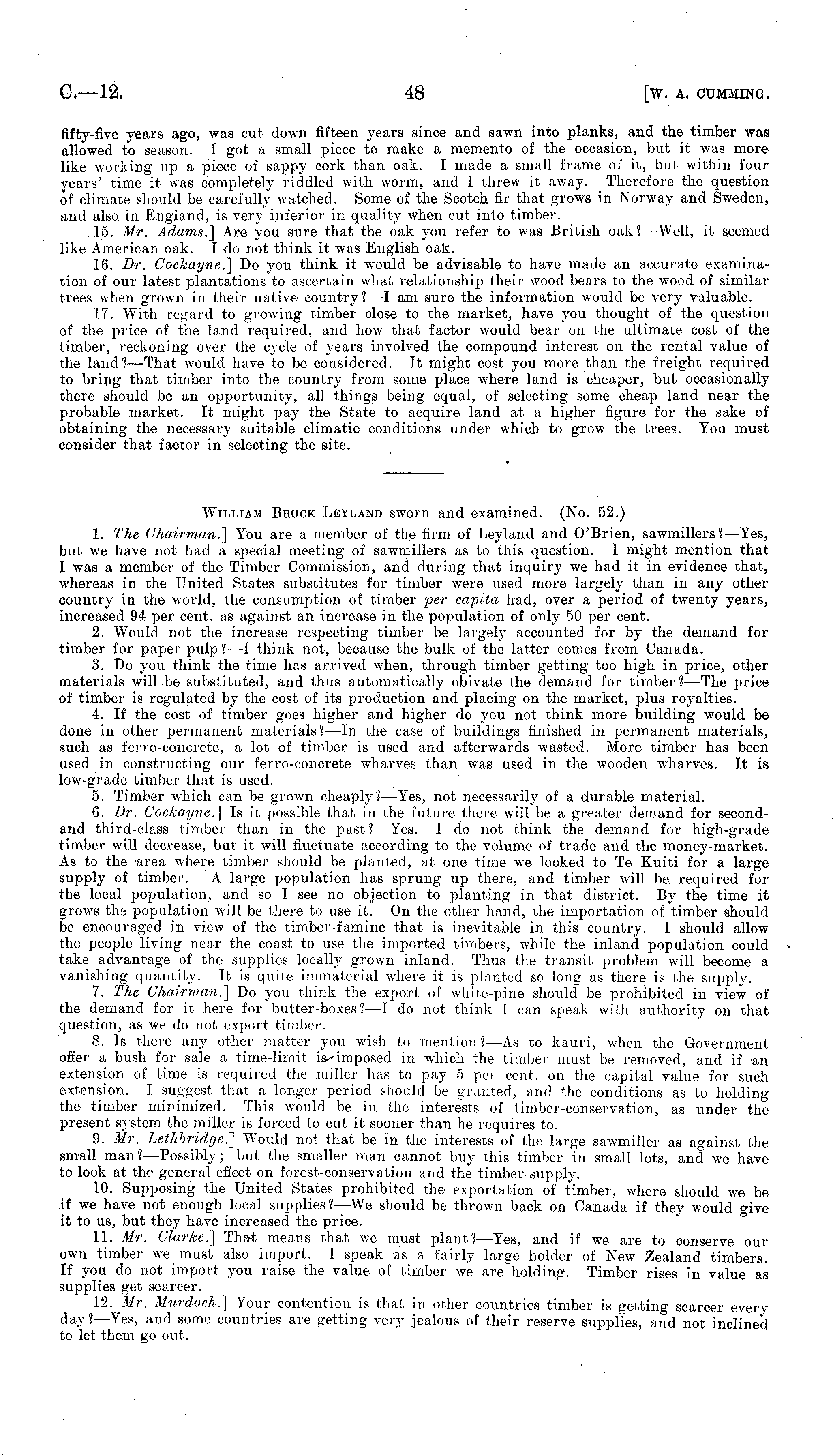 William Brock Lbyland sworn and examined. (No. 52.) 1. The Chairman.'] You are a member of the firm of Leyland and O'Brien, sawmillers? —Yes, but we have not had a special meeting of sawmillers as to this question. I might mention that I was a member of the Timber Commission, and during that inquiry we had it in evidence that, whereas in the United States substitutes for timber were used more largely than in any other country in the world, the consumption of timber per capita had, over a period of twenty years, increased 94 per cent, as against an increase in the population of only 50 per cent. 2. Would not the increase respecting timber be largely accounted for by the demand for timber for paper-pulp?—l think not, because the bulk of the latter comes from Canada. 3. Do you think the time has arrived when, through timber getting too high in price, other materials will be substituted, and thus automatically obivate the demand for timber I —The price of timber is regulated by the cost of its production and placing on the market, plus royalties. 4. If the cost of timber goes higher and higher do you not think more building would be done in other permanent materials? —In the case of buildings finished in permanent materials, such as ferro-concrete, a lot of timber is used and afterwards wasted. More timber has been used in constructing our ferro-concrete wharves than was used in the wooden wharves. It is low-grade timber that is used. 5. Timber which can be grown cheaply? —Yes, not necessarily of a durable material. 6. Dr. Cockayne.] Is it possible that in the future there will be a greater demand for secondand third-class timber than in the past?— Yes. I do not think the demand for high-grade timber will decrease, but it will fluctuate according to the volume of trade and the money-market. As to the area where timber should be planted, at one time we looked to Te Kuiti for a large supply of timber. A large population has sprung up there, and timber will be. required for the local population, and so I see no objection to planting in that district. By the time it grows the population will be there to use it. On the other hand, the importation of timber should be encouraged in view of the timber-famine that is inevitable in this country. I should allow the people living near the coast to use the imported timbers, while the inland population could take advantage of the supplies locally grown inland. Thus the transit problem will become a vanishing quantity. It is quite immaterial where it is planted so long as there is the supply. 7. The Chairman.] Do you think the export of white-pine should be prohibited in view of the demand for it here for butter-boxes? —I do not think 1 can speak with authority on that question, as we do not export timber. 8. Is there any other matter you wish to mention ?—As to kauri, when the Government offer a bush for sale a time-limit is--imposed in which the timber must be removed, and if 'an extension of time is required the miller has to pay 5 per cent, on the capital value for such extension. I suggest that a longer period should be granted, and the conditions as to holding the timber minimized. This would be in the interests of timber-conservation, as under the present system the miller is forced to cut it sooner than he requires to. 9. Mr. Lethbridge.] Would not that be in the interests of the large sawmiller as against the small man?— Possibly; but the smaller man cannot buy this timber in small lots, and we have to look at the general effect on forest-conservation and the timber-supply. 10. Supposing the United States prohibited the exportation of timber, where should we be if we have not enough local supplies?—We should be thrown back on Canada if they would give it to us, but they have increased the price. 11. Mr. Clarke.] That means that we must plant?— Yes, and if we are to conserve our own timber we must also import. I speak as a fairly large holder of New Zealand timbers. If you do not import you raise the value of timber we are holding. Timber rises in value as supplies get scarcer. 12. Mr. Murdoch.] Your contention is that in other countries timber is getting scarcer everyday ? —Yes, and some countries are getting very jealous of their reserve supplies, and not inclined to let them go out.