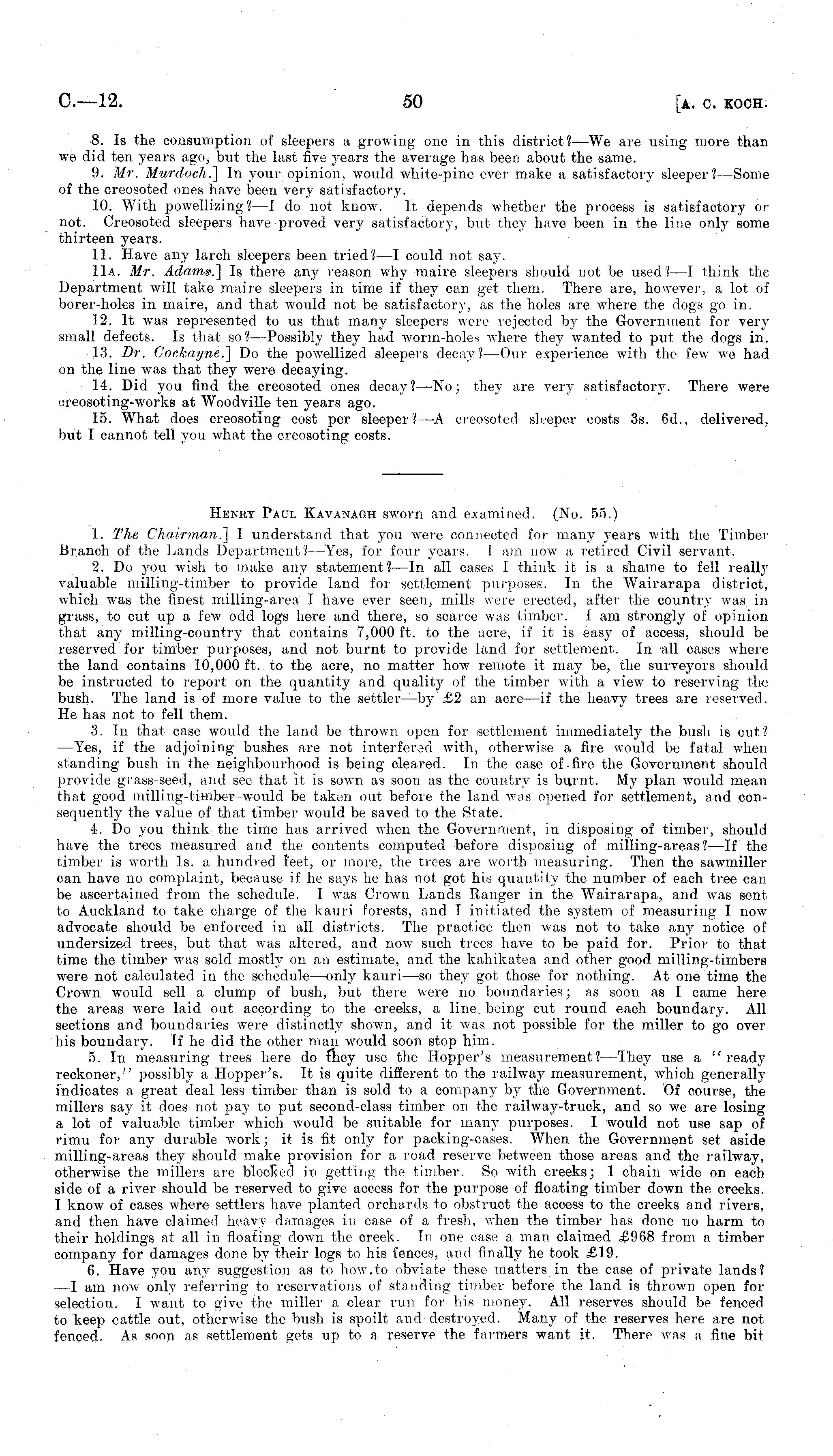 8. Is the consumption of sleepers a growing one in this district I— We are using more than we did ten years ago, but the last five years the average has been about the same. 9. Mr. Murdoch.] In your opinion, would white-pine ever make a satisfactory sleeper?— Some of the creosoted ones have been very satisfactory. 10. With powellizing ? —I do not know. It depends whether the process is satisfactory or not. Creosoted sleepers have proved very satisfactory, but they have been in the line only some thirteen years. 11. Have any larch sleepers been tried?—l could not say. 11a. Mr. Adams:] Is there any reason why maire sleepers should not be used?—l think the Department will take maire sleepers in time if they can get them. There are, however, a lot of borer-holes in maire, and that would not be satisfactory, as the holes are where the dogs go in. 12. It was represented to us that many sleepers were rejected by the Government for very small defects. Is that so? —Possibly they had worm-holes where they wanted to put the dogs in. 13. Dr. Cockayne.] Do the powellized sleepers decay? —Our experience with the few we had on the line was that they were decaying. 14. Did you find the creosoted ones decay?—No; they are very satisfactory. There were creosoting-works at Woodville ten years ago. 15. What does creosoting cost per sleeper?—A creosoted sleeper costs 3s. 6d., delivered, but I cannot tell you what the creosoting costs.