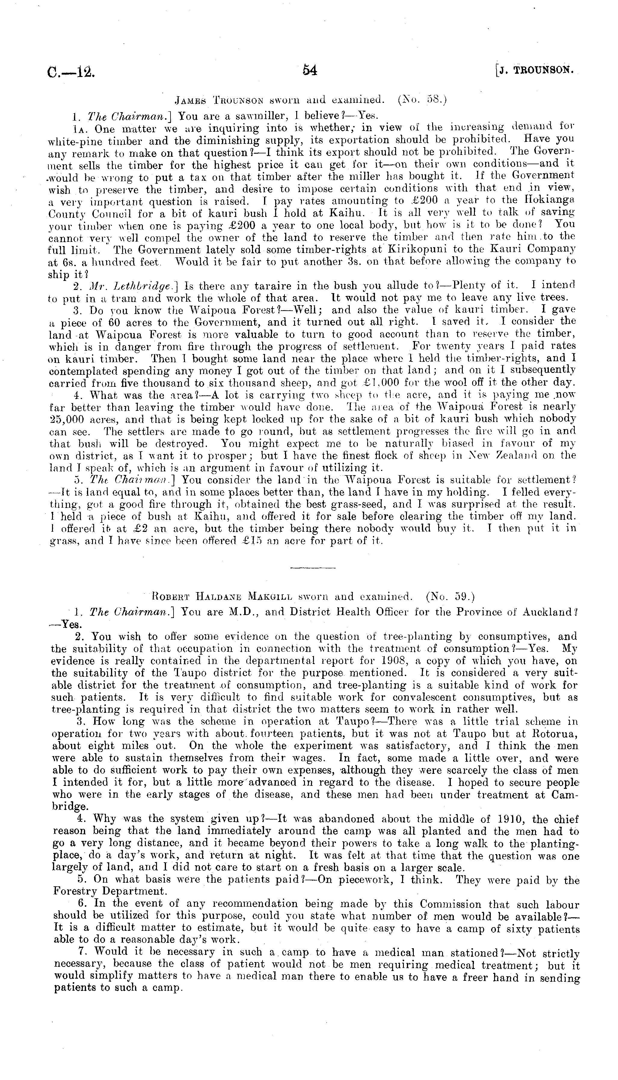 Robert Haldane Makgill sworn and examined. (No. 59.) 1. The Chairman.} You are M.D., and District Health Officer for the Province of Auckland? —Yes. 2. You wish to offer some evidence on the question of tree-planting by consumptives, and the suitability of that occupation in connection with the treatment of consumption?— Yes. My evidence is really contained in the departmental report for 1908, a copy of which you have, on the suitability of the I'aupo district for the purpose mentioned. It is considered a very suitable district for the treatment of consumption, and tree-planting is a suitable kind of work for such patients. It is very difficult to find suitable work for convalescent consumptives, but as tree-planting is required in that district the two matters seem to work in rather well. 3. How long was the scheme in operation at Taupo?—There was a little trial scheme in operation for two years with about, fourteen patients, but it was not at Taupo but at Kotorua, about eight miles out. On the whole the experiment was satisfactory, and I think the men were able to sustain themselves from their wages. In fact, some made a little over, and were able to do sufficient work to pay their own expenses, although they vvere scarcely the class of men I intended it for, but a little moreadvanced in regard to the disease. I hoped to secure people who were in the early stages of the disease, and these men had been under treatment at Cambridge. 4. Why was the system given up?—lt was abandoned about the middle of 1910, the chief reason being that the land immediately around the camp was all planted and the men had to go a very long distance, and it became beyond their powers to take a long walk to the plantingplace, do a day's work, and return at night. It was felt at that time that the question was one largely of land, and I did not care to start on a fresh basis on a larger scale. 5. On what basis were the patients paid?—On piecework, I think. They were paid by the Forestry Department. 6. In the event of any recommendation being made by this Commission that such labour should be utilized for this purpose, could you state what number of men would be available?— It is a difficult matter to estimate, but it would be quite easy to have a camp of sixty patients able to do a reasonable day's work. 7. Would it l)e necessary in such a camp to have a medical man stationed? —Not strictly necessary, because the class of patient would not be men requiring medical treatment; but it would simplify matters to have a medical man there to enable us to have a freer hand in sending patients to such a camp.