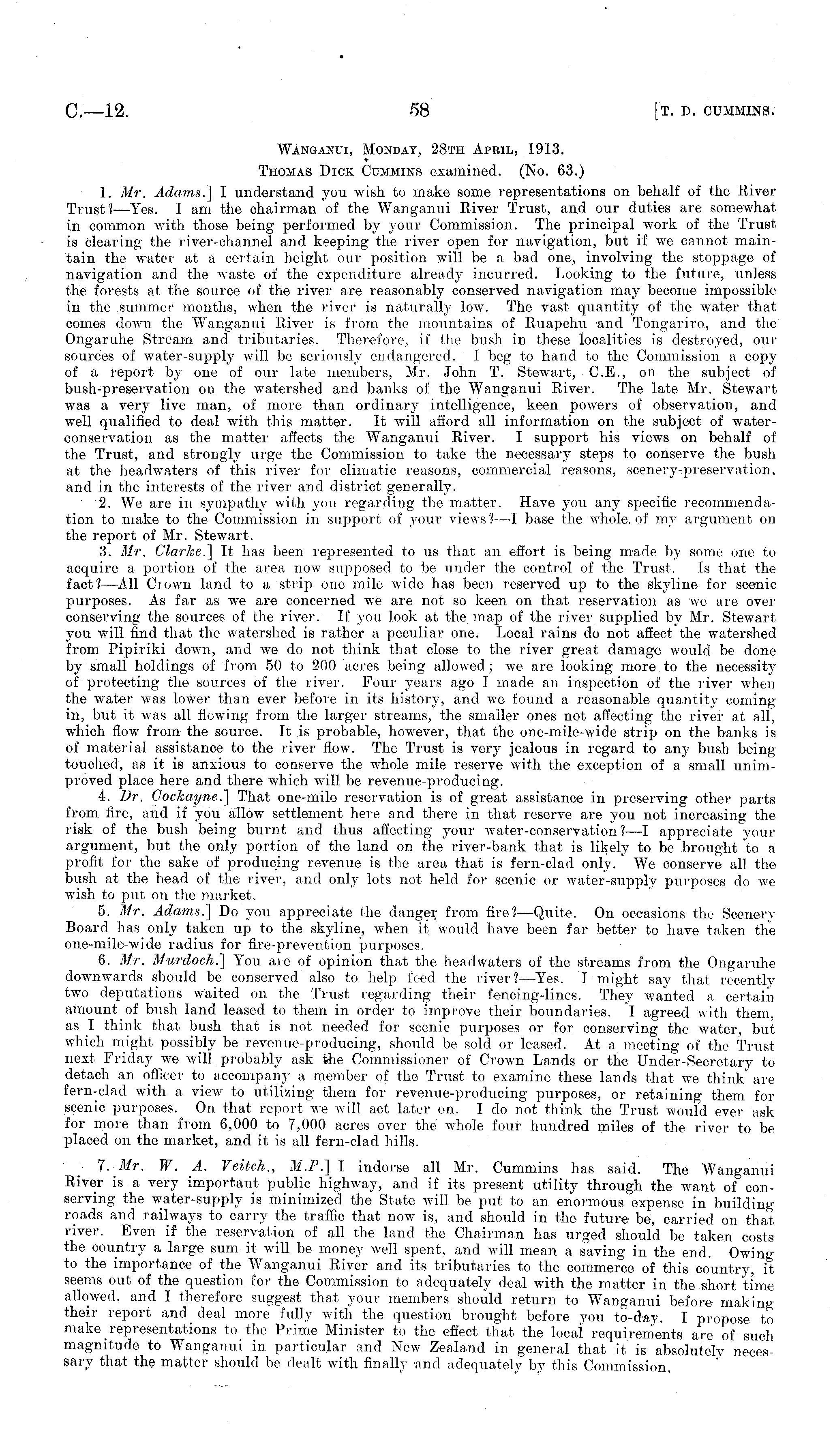 Wangantji, Monday, 28th April, 1913. Thomas Dick Cummins examined. (No. 63.) 1. Mr. Adams.] I understand you wish to make some representations on behalf of the River Trust? —Yes. I am the chairman of the Wanganui River Trust, and our duties are somewhat in common with those being performed by your Commission. The principal work of the Trust is clearing the river-channel and keeping the river open for navigation, but if we cannot maintain the water at a certain height our position will be a bad one, involving the stoppage of navigation and the waste of the expenditure already incurred. Looking to the future, unless the forests at the source of the river are reasonably conserved navigation may become impossible in the summer months, when the river is naturally low. The vast quantity of the water that comes down the Wanganui River is from the mountains of Ruapehu and Tongariro, and the Ongaruhe Stream and tributaries. Therefore, if the bush in these localities is destroyed, our sources of water-supply will be seriously endangered. I beg to hand to the Commission a copy of a report by one of our late members, Mr. John T. Stewart, C.E., on the subject of bush-preservation on the watershed and banks of the Wanganui River. The late Mr. Stewart was a very live man, of more than ordinary intelligence, keen powers of observation, and well qualified to deal with this matter. It will afford all information on the subject of waterconservation as the matter affects the Wanganui River. I support his views on behalf of the Trust, and strongly urge the Commission to take the necessary steps to conserve the btish at the headwaters of this river for climatic reasons, commercial reasons, scenery-preservation, and in the interests of the river and district generally. 2. We are in sympathy with you regarding the matter. Have you any specific recommendation to make to the Commission in support of your views ?—I base the whole, of my argument on the report of Mr. Stewart. 3. Mr. Clarke.] It lias been represented to us that an effort is being made by some one to acquire a portion of the area now supposed to be under the control of the Trust. Is that the fact?— All Crown land to a strip one mile wide has been reserved up to the skyline for scenic purposes. As far as we are concerned we are not so keen on that reservation as we are over conserving the sources of the river. If you look at the map of the river supplied by Mr. Stewart you will find that the watershed is rather a peculiar one. Local rains do not affect the watershed from Pipiriki down, and we do not think that close to the river great damage would be done by small holdings of from 50 to 200 acres being allowed; we are looking more to the necessity of protecting the sources of the river. Four years ago I made an inspection of the river when the water was lower than ever before in its history, and we found a reasonable quantity coming in, but it was all flowing from, the larger streams, the smaller ones not affecting the river at all, which flow from the source. It is probable, however, that the one-mile-wide strip on the banks is of material assistance to the river flow. The Trust is very jealous in regard to any bush being touched, as it is anxious to conserve the whole mile reserve with, the exception of a small unimproved place here and there which will be revenue-producing. 4. Dr. Cockayne.] That one-mile reservation is of great assistance in preserving other parts from fire, and if you allow settlement here and there in that reserve are you not increasing the risk of the bush being burnt and thus affecting your water-conservation ?—I appreciate your argument, but the only portion of the land on the river-bank that is likely to be brought to a profit for the sake of producing revenue is the area that is fern-clad only. We conserve all the bush at the head of the river, and only lots not held for scenic or water-supply purposes do we wish to put on the market, 5. Mr. Adams.] Do you appreciate the danger from fire? —Quite. On occasions the Scenery Board has only taken up to the skyline, when it would have been far better to have taken the one-mile-wide radius for fire-prevention purposes. 6. Mr. Murdoch.] You are of opinion that the headwaters of the streams from the Ongaruhe downwards should be conserved also to help feed the river?— Yes. I might say that recently two deputations waited on the Trust regarding their fencing-lines. They wanted a certain amount of bush land leased to them in order to improve their boundaries. I agreed with them, as I think that bush that is not needed for scenic purposes or for conserving the water, but which might possibly be revenue-producing, should be sold or leased. At a meeting of the Trust next Friday we will probably ask the Commissioner of Crown Lands or the Under-Secretary to detach an officer to accompany a member of the Trust to examine these lands that we think" are fern-clad with a view to utilizing them for revenue-producing purposes, or retaining them for scenic purposes. On that report we will act later on. I do not think the Trust would ever ask for more than from 6,000 to 7,000 acres over the whole four hundred miles of the river to be placed on the market, and it is all fern-clad hills. 7. Mr. W. A. Veitch., M.P.] I indorse all Mr. Cummins has said. The Wanganui River is a very important public highway, and if its present utility through the want of conserving the water-supply is minimized the State will be put to an enormous expense in buildingroads and railways to carry the traffic that now is, and should in the future be, carried on that river. Even if the reservation of all the land the Chairman has urged should be taken costs the country a large sum it will be money well spent, and will mean a saving in the end. Owing to the importance of the Wanganui River and its tributaries to the commerce of this country, it seems out of the question for the Commission to adequately deal with th