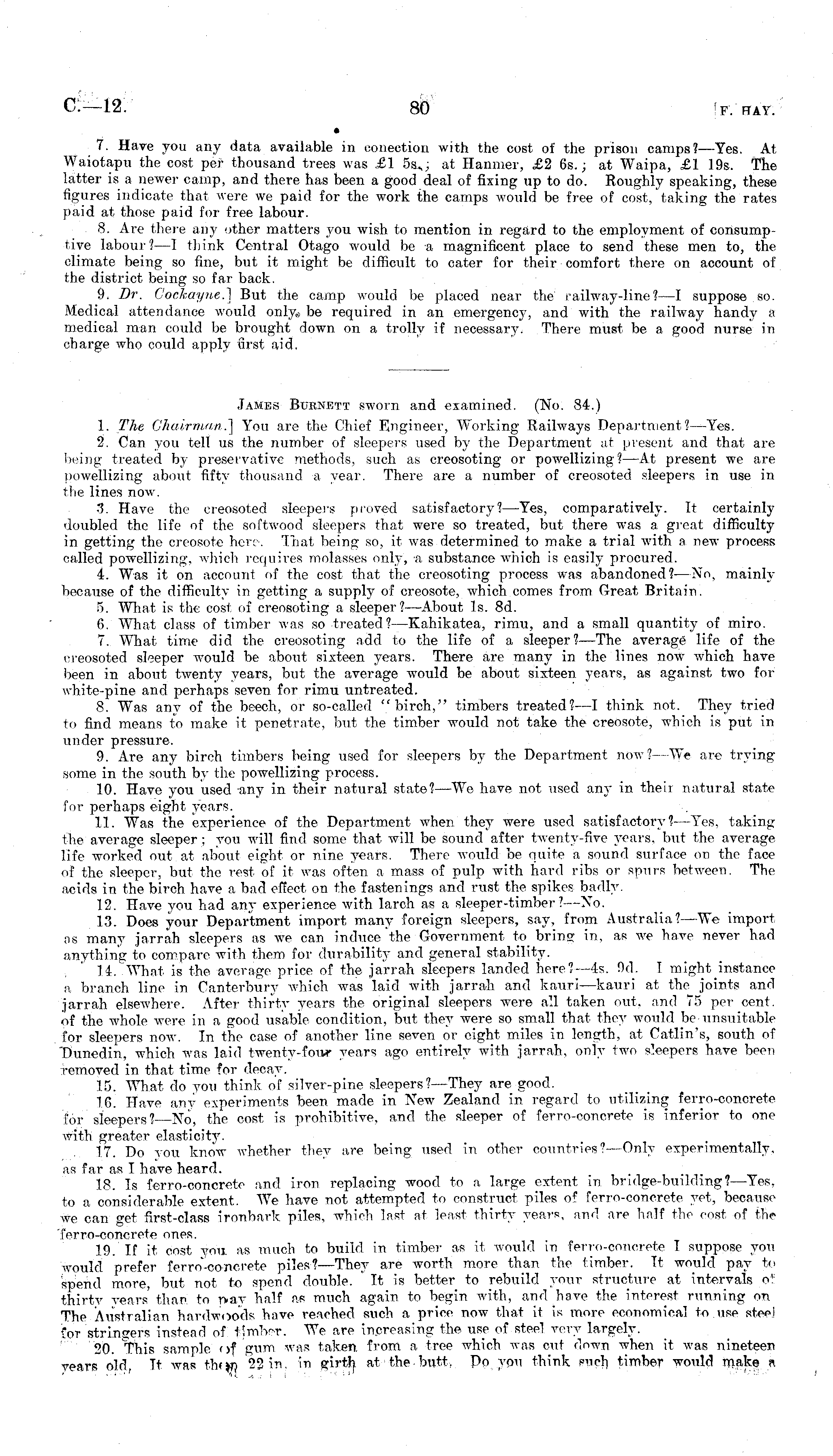 James Burnett sworn and examined. (No. 84.) 1. The Chairman.] You are the Chief Engineer, Working Railways Department?— Yes. 2. Can you tell us the number of sleepers used by the Department at present and that are lieing treated by preservative methods, such as creosoting or powellizing?—At present we are powellizing about fifty thousand a year. There are a number of creosoted sleepers in use in the lines now. 3. Have the creosoted sleepers proved satisfactory?— Yes, comparatively. It certainlydoubled the life of the softwood sleepers that were so treated, but there was a great difficulty in getting the creosote here. That being so, it was determined to make a trial with a new process called powellizing, which requires molasses only, a substance which is easily procured. 4. Was it on account of the cost that the creosoting process was abandoned? —No, mainly because of the difficulty in getting a supply of creosote, which comes from Great Britain. 5. What is the cost of creosoting a sleeper?— About Is. Bd. 6. What class of timber was so treated? —Kahikatea, rimu, and a small quantity of miro. 7. What time did the creosoting add to the life of a sleeper?— The average' life of the creosoted sleeper would be about sixteen years. There are many in the lines now which have been in about twenty years, but the average would be about sixteen years, as against two for white-pine and perhaps seven for rimu untreated. 8. Was any of the beech, or so-called "birch," timbers treated?—l think not. They tried to find means to make it penetrate, but the timber would not take the creosote, which is put in under pressure. 9. Are any birch timbers being used for sleepers by the Department now? —We are trying some in the south by the powellizing process. 10. Have you used any in their natural state?—We have not used any in their natural state for perhaps eight years. 11. Was the experience of the Department when they were used satisfactory? —Yes, taking the average sleeper ; you will find some that will be sound after twenty-five years, but the average life worked out at about eight or nine years. There would be quite a sound surface on the face of the sleeper, but the rest of it was often a mass of pulp with hard ribs or spurs between. The acids in the birch have a bad effect on the fastenings and rust the spikes badly. 12. Have you had any experience with larch as a sleeper-timber? —Xo. 13. Does your Department import many foreign sleepers, say, from Australia? —We import as many jarrah sleepers as we can induce the Government to brins: in, as we have never had anything to compare with them for durability and general stability. 14. What is the average price of the jarrah sleepers landed here?—4s. 9d. I might instance a branch line in Canterbury which was laid with jarrah and kauri —kauri at the joints and jarrah elsewhere. After thirty years the original sleepers were all taken out, and 75 per cent, of the whole were in a good usable condition, but they were so small that they would be unsuitable for sleepers now. In the case of another line seven or eight miles in length, at Catlin's, south of Thmedin, which was laid twenty-foiw years ago entirely with jarrah, only two sleepers have been removed in that time for decay. 15. What do yon think of silver-pine sleepers?— They are good. IC. Have any experiments been made in New Zealand in regard to utilizing ferro-conorete for sleepers? -No, the cost is prohibitive, and the sleeper of ferro-concrete is inferior to one with greater elasticity. 17. Do you know whether they are being used in other countries? —Only experimentally, as far as T have heard. 18. Is ferro-concrete and iron replacing wood to a large extent in bridge-building?— Yes, to a considerable extent. We have not attempted to construct piles of ferro-concrete yet, because we can get first-class ironbark piles, which last at least thirty years, and are half the cost of the "ferro-concrete ones.