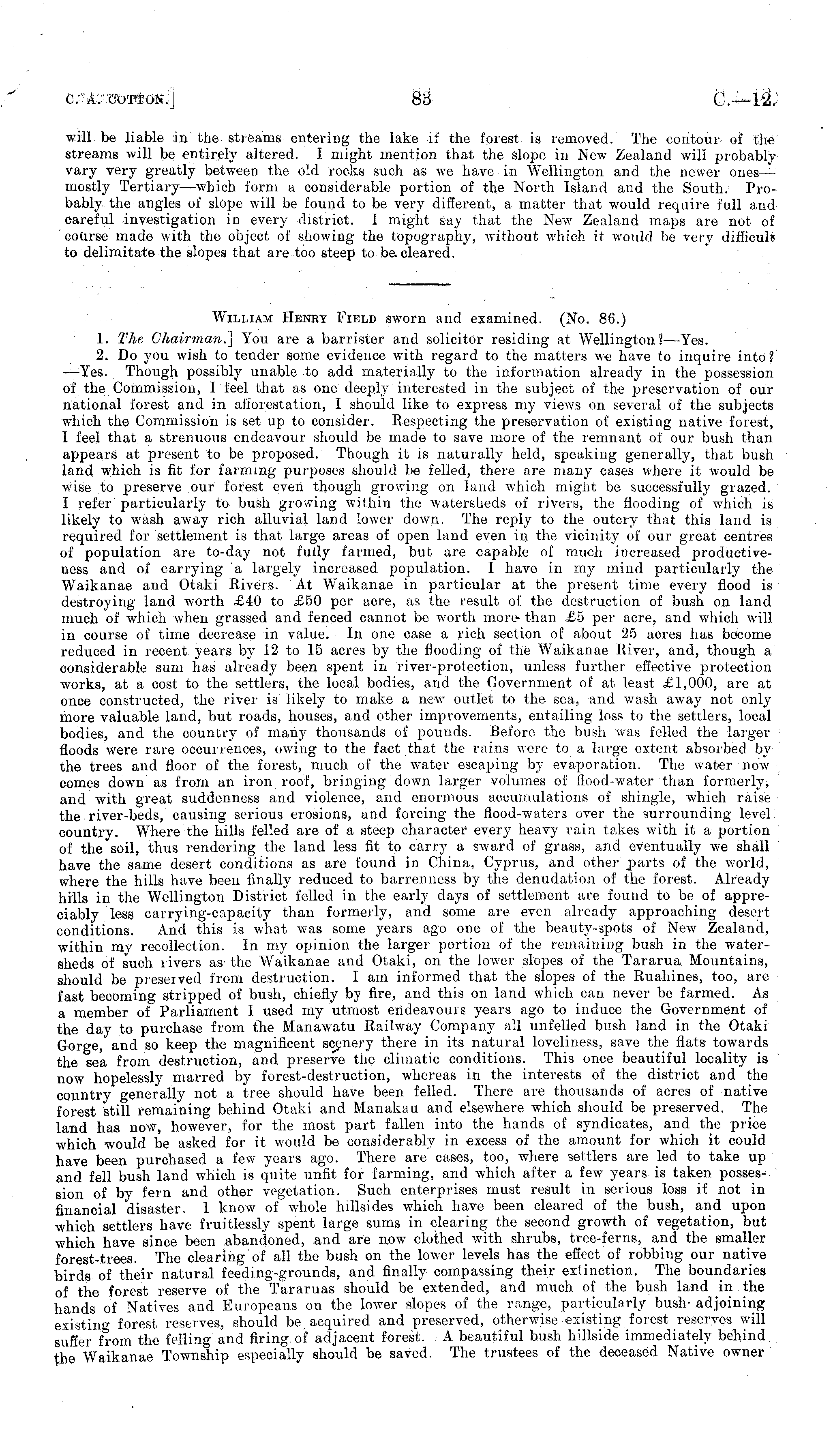 William Henry Field sworn and examined. (No. 86.) 1. The Chairman.] You are a barrister and solicitor residing at Wellington?— Yes. 2. Do you wish to tender some evidence with regard to the matters we have to inquire into 1 —Yes. Though possibly unable to add materially to the information already in the possession of the Commission, I feel that as one deeply interested in the subject of the preservation of our national forest and in afforestation, I should like to express my views on several of the subjects which the Commission is set up to consider. Respecting the preservation of existing native forest, I feel that a strenuous endeavour should be made to save more of the remnant of our bush than appears at present to be proposed. Though it is naturally held, speaking generally, that bush land which is fit for farming purposes should be felled, there are many cases where it would be wise to preserve our forest even though growing on laud which might be successfully grazed. I refer particularly to bush growing within the watersheds of rivers, the flooding of which is likely to wash away rich alluvial land lower down. The reply to the outcry that this land is required for settlement is that large areas of open land even in the vicinity of our great centres of population are to-day not fully farmed, but are capable of much increased productiveness and of carrying a largely increased population. I have in my mind particularly the Waikanae and Otaki Rivers. At Waikanae in particular at the present time every flood is destroying land worth £40 to £50 per acre, as the result of the destruction of bush on land much of which when grassed and fenced cannot be worth more- than £5 per acre, and which will in course of time decrease in value. In one case a rich section of about 25 acres has become reduced in recent years by 12 to 15 acres by the flooding of the Waikanae River, and, though a considerable sum has already been spent in river-protection, unless further effective protection works, at a cost to the settlers, the local bodies, and the Government of at least £1,000, are at once constructed, the river is likely to make a new outlet to the sea, and wash away not only more valuable land, but roads, houses, and other improvements, entailing loss to the settlers, local bodies, and the country of many thousands of pounds. Before the bush was felled the larger floods were rare occurrences, owing to the fact that the rains were to a large extent absorbed by the trees and floor of the forest, much of the water escaping by evaporation. The water now comes down as from an iron roof, bringing down larger volumes of flood-water than formerly, and with great suddenness and violence, and enormous accumulations of shingle, which raise the river-beds, causing serious erosions, and forcing the flood-waters over the surrounding level country. Where the hills felled are of a steep character every heavy rain takes with it a portion of the soil, thus rendering the land less fit to carry a sward of grass, and eventually we shall have the same desert conditions as are found in China, Cyprus, and other parts of the world, where the hills have been finally reduced to barrenness by the denudation of the forest. Already hills in the Wellington District felled in the early days of settlement are found to be of appreciably less carrying-capacity than formerly, and some are even already approaching desert conditions. And this is what was some years ago one of the beauty-spots of New Zealand, within my recollection. In my opinion the larger portion of the remaining bush in the watersheds of such rivers as- the Waikanae and Otaki, on the lower slopes of the Tararua Mountains, should be preserved from destruction. I am informed that the slopes of the Ruahines, too, are fast becoming stripped of bush, chiefly by fire, and this on land which can never be farmed. As a member of Parliament I used my utmost endeavours years ago to induce the Government of the day to purchase from the Manawatu Railway Company all unfelled bush land in the Otaki Gorge, and so keep the magnificent scenery there in its natural loveliness, save the flats towards the sea from destruction, and preserve the climatic conditions. This once beautiful locality is now hopelessly marred by forest-destruction, whereas in the interests of the district and the country generally not a tree should have been felled. There are thousands of acres of native forest still remaining behind Otaki and Manakau and elsewhere which should be preserved. The land has now, however, for the most part fallen into the hands of syndicates, and the price which would be asked for it would be considerably in excess of the amount for which it could have been purchased a few years ago. There are cases, too, where settlers are led to take up and fell bush land which is quite unfit for farming, and which after a few years is taken possession of by fern and other vegetation. Such enterprises must result in serious loss if not in financial disaster. 1 know of whole hillsides which have been cleared of the bush, and upon which settlers have fruitlessly spent large sums in clearing the second growth of vegetation, but which have since been abandoned, and are now clothed with shrubs, tree-ferns, and the smaller forest-trees. The clearing of all the bush on the lower levels has the effect of robbing our native birds of their natural feeding-grounds, and finally compassing their extinction. The boundaries of the forest reserve of the Tararuas should be extended, and much of the bush land in the hands of Natives and Europeans on the lower slopes of the range, particularly bush- adjoining existing forest reserves, should be acquired and preserved, otherwise existing forest reserves will suffer from the felling and firing of adjacent forest. A beautiful bush hillside immediately behind. the Waikanae Township especially should be saved. The trustees of the deceased Native owner