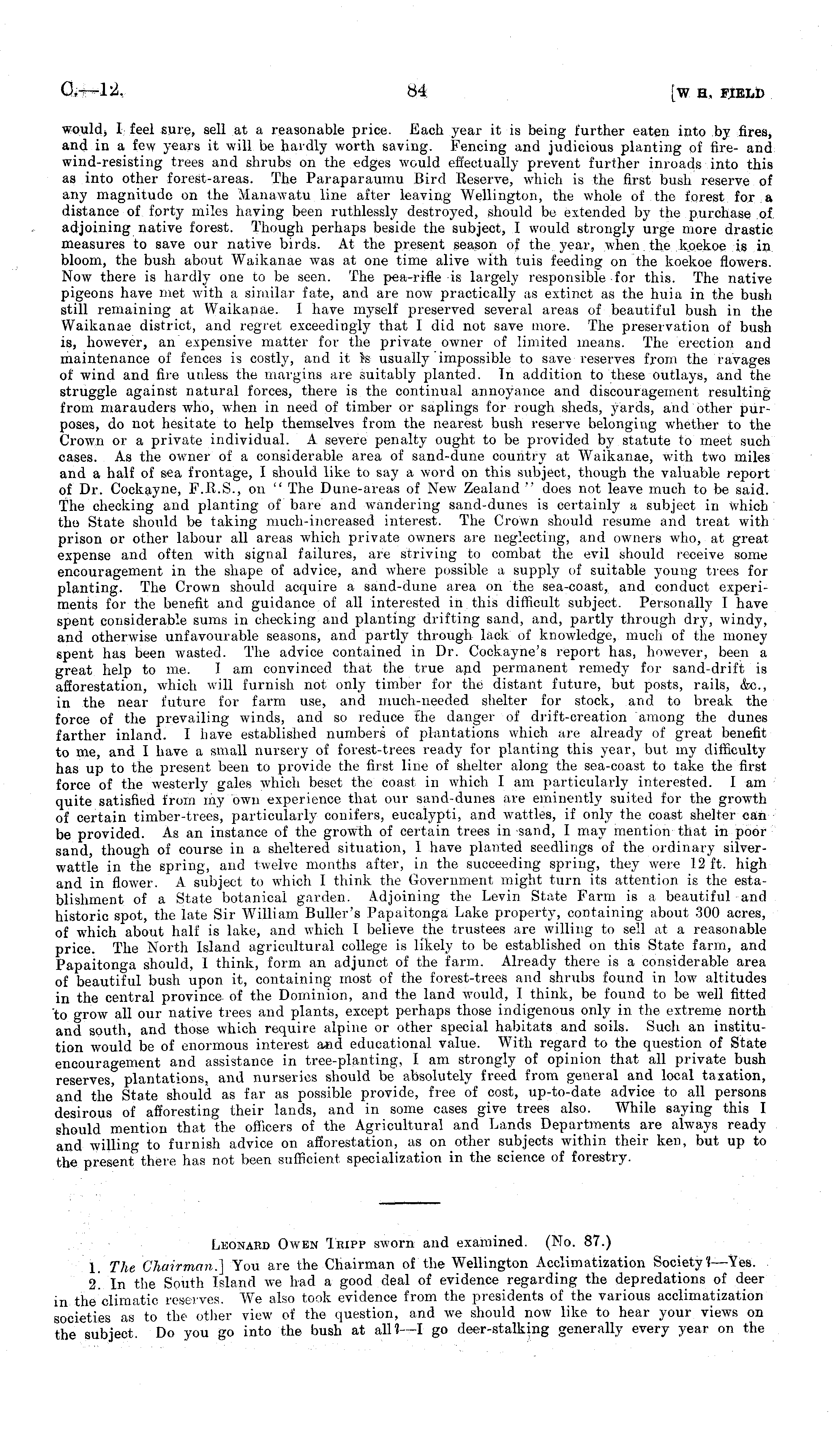 Leonard Owen Tripp sworn and examined. (No. 87.) 1. The Chairman.} You are the Chairman of the Wellington Acclimatization Society?— Yes. i. In the South Island we had a good deal of evidence regarding the depredations of deer in the climatic reserves. We also took evidence from the presidents of the various acclimatization societies as to the other view of the question, and we should now like to hear your views on the subject. Do you go into the bush at all? —I go deer-stalking generally every year on the
