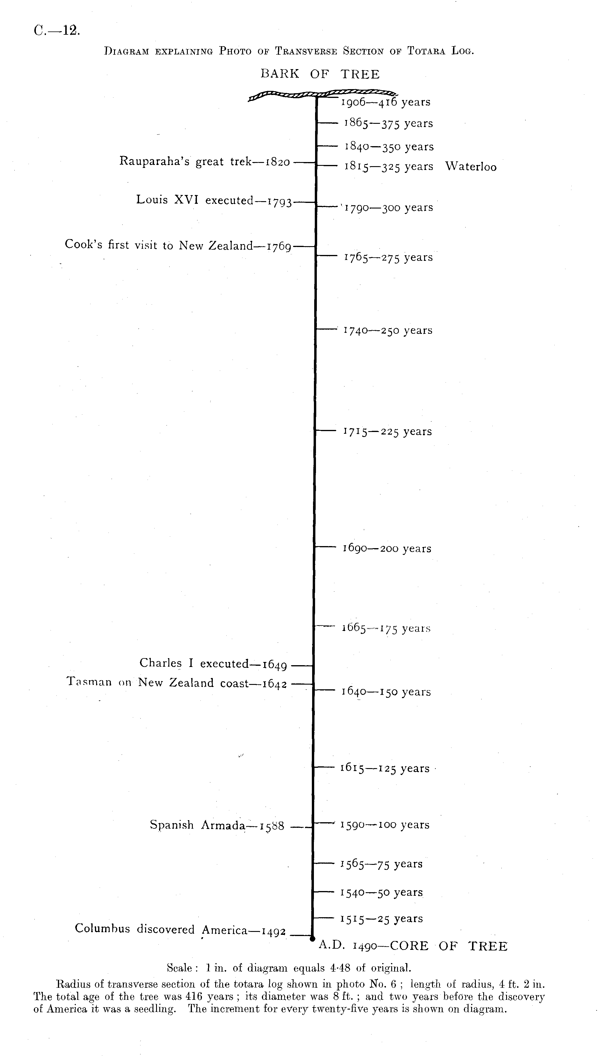 Diagram explaining Photo of Transverse Section of Totara Log. BARK OF TREE igoo—4l6 years 1865—375 years 1840 —350 years Rauparaha's great trek-1820 _ lB i s - 3 2 5 years Waterloo Louis XVI executed— 1703 /yj !79° —300 years Cook's first visit to New Zealand—l 769 1765 —275 years 1740 —250 years 1715 —225 years 1690 —200 years ~ 1665 - -175 years Charles I executed—l 649 Tasman on New Zealand coast—l 642 1640 —150 years - 1615 —125 years Spanish Armada— 15S8 1590—100 years 1565 —75 years 1540 —50 years 1515 —25 years Columbus discovered America— 1492 A.D. 1490—CORE OF TREE Scale : 1 in. of diagram equals 448 of original. Radius of transverse section of tie totara log shown in photo No. 6 ; length of radius, 4 ft. 2 in. The total age of the tree was 416 years ; its diameter was 8 ft. ; and two years before the discovery o£ America it was a seedling. The increment for every twenty-five years is shown on diagram.