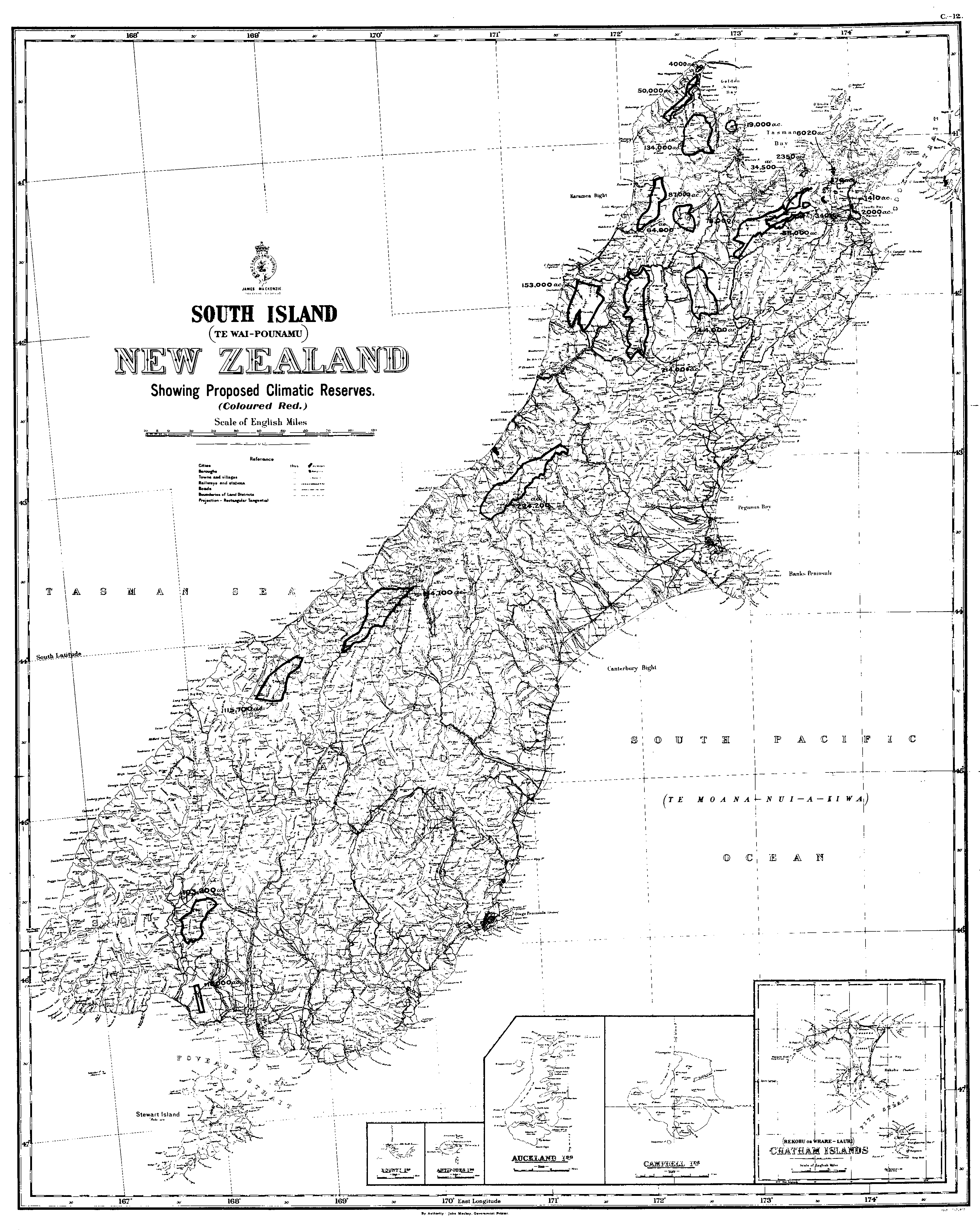 SOUTH ISLAND (TE WAI-POUNAMU) NEW ZEALAND Showing Proposed Climatic Reserves. (Coloured Red.)