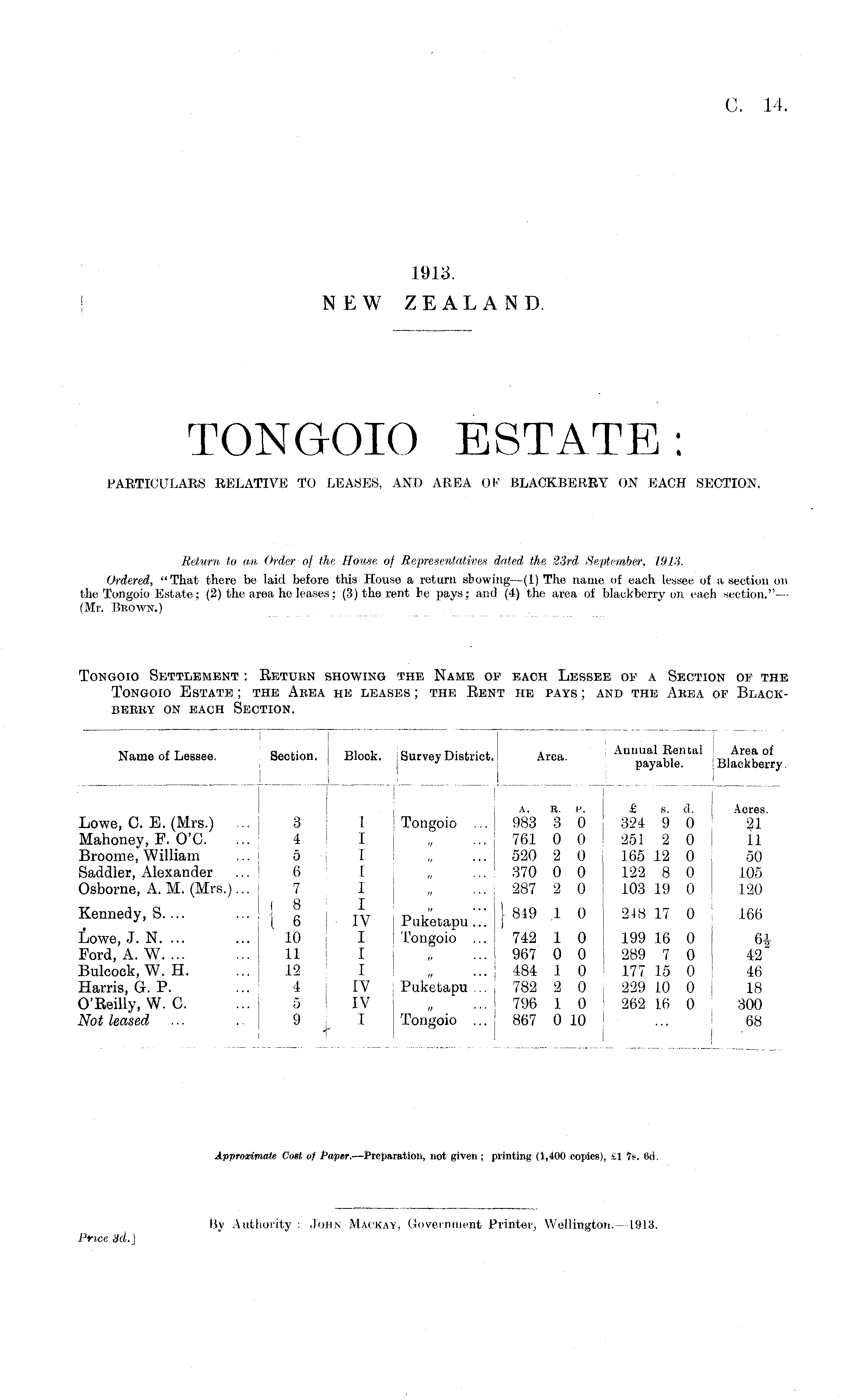 Return to an Order of the, House, of Representatives dated the 23rd September, 1913. Ordered, "That there be laid before this House a return showing—(l) The name of each lessee of ;i section on the Tongoio Estate; (2) the area ho leases; (3) the rent he pays; and (4) the area of blackberry on each section."— (Mr. Bbown.)