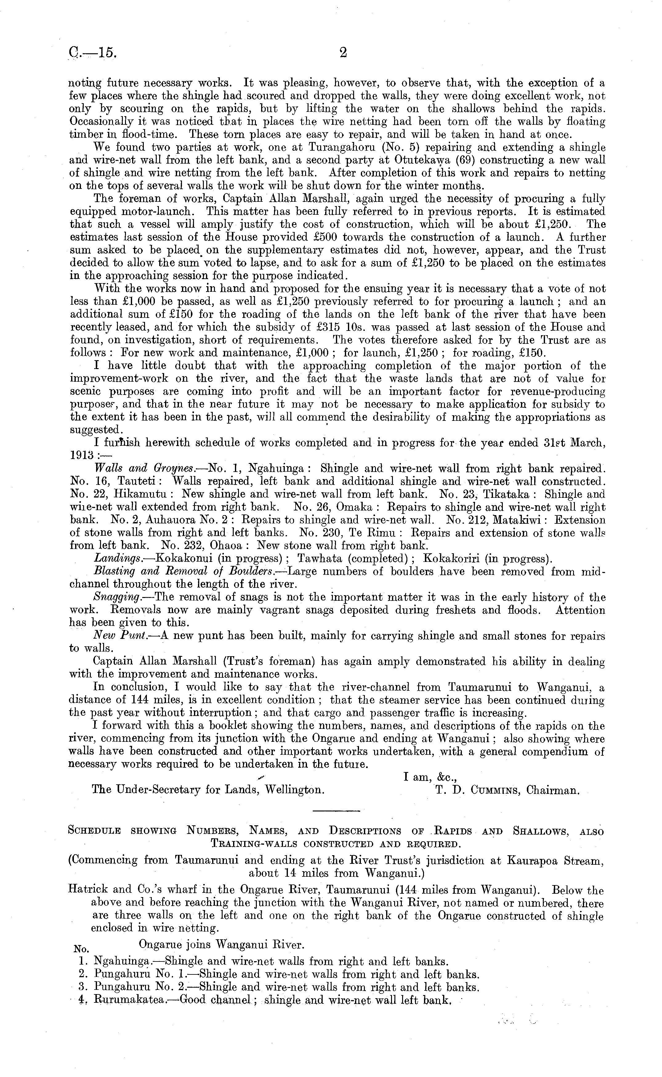 noting future necessary works. It was pleasing, however, to observe that, with the exception of a few places where the shingle had scoured and dropped the walls, they were doing excellent work, not only by scouring on the rapids, but by lifting the water on the shallows behind the rapids. Occasionally it was noticed that in places the wire netting had been torn off the walls by floating timber in flood-time. These torn places are easy to repair, and will be taken in hand at once. We found two parties at work, one at Turangahoru (No. 5) repairing and extending a shingle and wire-net wall from the left bank, and a second party at Otutekawa (69) constructing a new wall of shingle and wire netting from the left bank. After completion of this work and repairs to netting on the tops of several walls the work will be shut down for the winter months. The foreman of works, Captain Allan Marshall, again urged the necessity of procuring a fully equipped motor-launch. This matter has been fully referred to in previous reports. It is estimated that such a vessel will amply justify the cost of construction, which will be about £1,250. The estimates last session of the House provided £500 towards the construction of a launch. A further sum asked to be placed_ on the supplementary estimates did not, however, appear, and the Trust decided to allow the sum voted to lapse, and to ask for a sum of £1,250 to be placed on the estimates in the approaching session for the purpose indicated. With the works now in hand and proposed for the ensuing year it is necessary that a vote of not less than £1,000 be passed, as well as £1,250 previously referred to for procuring a launch ; and an additional sum of £150 for the roading of the lands on the left bank of the river that have been recently leased, and for which the subsidy of £315 10s. was passed at last session of the House and found, on investigation, short of requirements. The votes therefore asked for by the Trust are as follows : For new work and maintenance, £1,000 ; for launch, £1,250 ; for roading, £150. I have little doubt that with the approaching completion of the major portion of the improvement-work on the river, and the fact that the waste lands that are not of value for scenic purposes are coming into profit and will be an important factor for revenue-producing purposer, and that in the near future it may not be necessary to make application for subsidy to the extent it has been in the past, will all commend the desirability of making the appropriations as suggested. I furnish herewith schedule of works completed and in progress for the year ended 31?t March, 1913 :— Walls and Groynes. —No. 1, Ngahuinga : Shingle and wire-net wall from right bank repaired. No. 16, Tauteti: Walls repaired, left bank and additional shingle and wire-net wall constructed. No. 22, Hikamutu : New shingle and wire-net wall from left bank. No. 23, Tikataka : Shingle and wiie-net wall extended from right bank. No. 26, Omaka : Repairs to shingle and wire-net wall right bank. No. 2, Auhauora No. 2 : Repairs to shingle and wire-net wall. No. 212, MataMwi: Extension of stone walls from right and. left banks. No. 230, Te Rimu : Repairs and extension of stone walls from left bank. No. 232, Ohaoa : New stone wall from right bank. Landings. —Kokakonui (in progress) ; Tawhata (completed) ; Kokakoriri (in progress). Blasting and Removal of Boulders .—Large numbers of boulders have been removed from midchannel throughout the length of the river. Snagging. —The removal of snags is not the important matter it was in the early history of the work. Removals now are mainly vagrant snags deposited during freshets and floods. Attention has been given to this. New Punt. —A new punt has been built, mainly for carrying shingle and small stones for repairs to walls. Captain Allan Marshall (Trust's foreman) has again amply demonstrated his ability in dealing with the improvement and maintenance works. In conclusion, I would like to say that the river-channel from Taumarunui to Wanganui, a distance of 144 miles, is in excellent condition ; that the steamer service has been continued duiing the past year without interruption; and that cargo and passenger traffic is increasing. I forward with this a booklet showing the numbers, names, and descriptions of the rapids on the river, commencing from its junction with the Ongarue and ending at Wanganui; also showing where walls have been constructed and other important works undertaken, with a general compendium of necessary works required to be undertaken in the future. I am, &c, The Under-Secretary for Lands, Wellington. T. D. Cummins, Chairman.