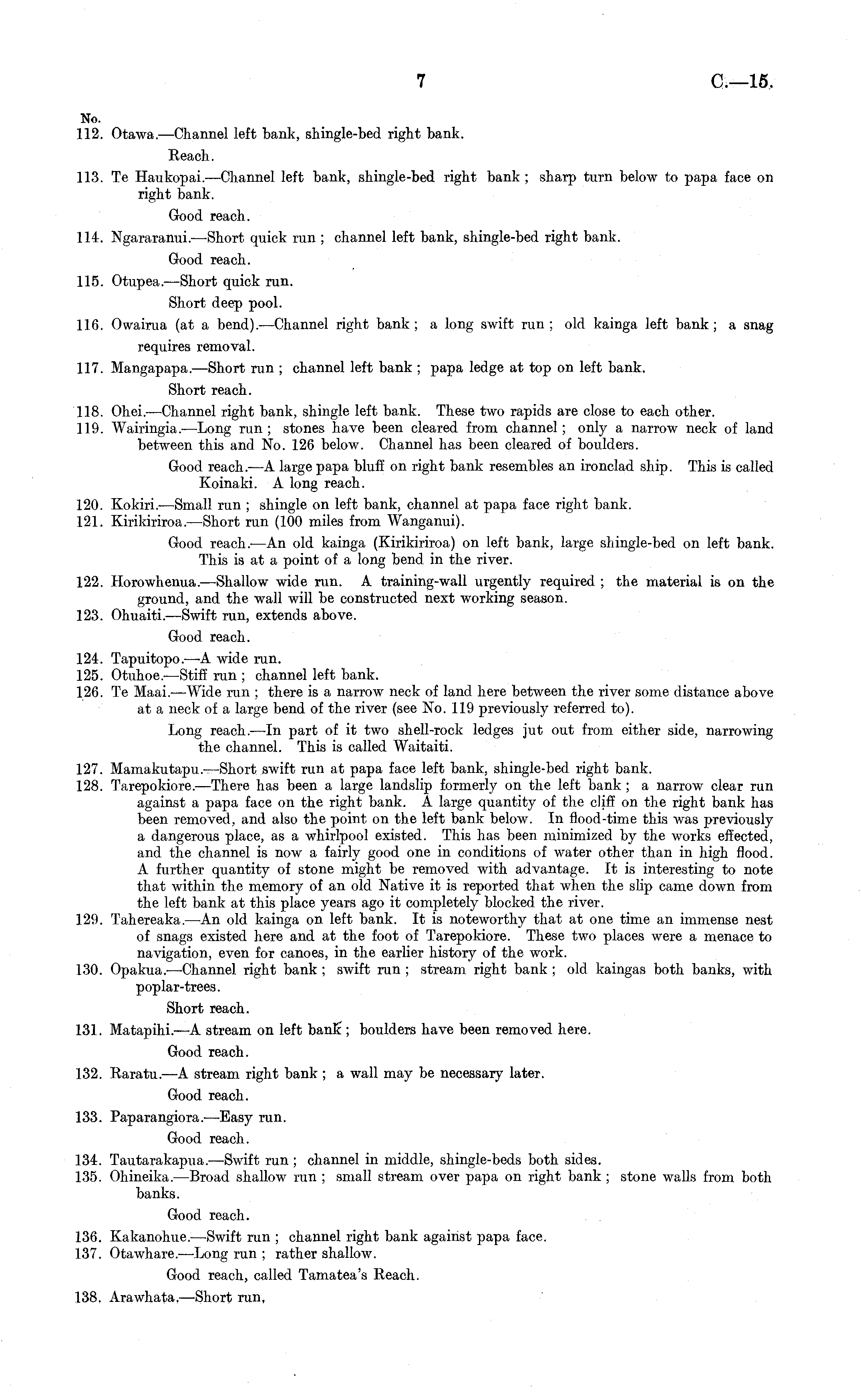 No. 112. Otawa.—Channel left bank, shingle-bed right bank. Reach. 113. Te Haukopai.—Channel left bank, shingle-bed right bank ; sharp turn below to papa face on right bank. Good reach. 114. Ngararanui.—Short quick run ; channel left bank, shingle-bed right bank. Good reach. 115. Otupea.—Short quick run. Short deep pool. 116. Owairua (at a bend). —Channel right bank ; a long swift run ; old kainga left bank ; a snag requires removal. 117. Mangapapa. —Short ran ; channel left bank ; papa ledge at top on left bank. Short reach. 118. Ohei.—Channel right bank, shingle left bank. These two rapids are close to each other. 119. Wairingia.—Long run ; stones have been cleared from channel; only a narrow neck of land between this and No. 126 below. Channel has been cleared of boulders. Good reach. —A large papa bluff on right bank resembles an ironclad ship. This is called Koinaki. A long reach. 120. Kokiri. —Small run ; shingle on left bank, channel at papa face right bank. 121. Kirikiriroa.—Short ran (100 miles from Wanganui). Good reach.- —An old kainga (Kirikiriroa) on left bank, large shingle-bed on left bank. This is at a point of a long bend in the river. 122. Horowhenua. —Shallow wide ran. A training-wall urgently required ; the material is on the ground, and the wall will be constructed next working season. 123. Ohuaiti.—Swift run, extends above. Good reach. 124. Tapuitopo. —A wide run. 125. Otuhoe. —Stiff run ; channel left bank. 126. Te Maai.—Wide run ; there is a narrow neck of land here between the river some distance above at a neck of a large bend of the river (see No. 119 previously referred to). Long reach. —In part of it two shell-rock ledges jut out from either side, narrowing the channel. This is called Waitaiti. 127. Mamakutapu. —Short swift run at papa face left bank, shingle-bed right bank. 128. Tarepokiore.—There has been a large landslip formerly on the left bank ; a narrow clear run against a papa face on the right bank. A large quantity of the cliff on the right bank has been removed, and also the point on the left bank below. In flood-time this was previously a dangerous place, as a whirlpool existed. This has been minimized by the works effected, and the channel is now a fairly good one in conditions of water other than in high flood. A further quantity of stone might be removed with advantage. It is interesting to note that within the memory of an old Native it is reported that when the slip came down from the left bank at this place years ago it completely blocked the river. 129. Tahereaka. —An old kainga on left bank. It is noteworthy that at one time an immense nest of snags existed here and at the foot of Tarepokiore. These two places were a menace to navigation, even for canoes, in the earlier history of the work. 130. Opakua.—-Channel right bank ; swift run ; stream right bank ; old kaingas both banks, with poplar-trees. Short reach. 131. Matapihi.—A stream on left bank ; boulders have been removed here. Good reach. 132. Raratu. —A stream right bank ; a wall may be necessary later. Good reach. 133. Paparangiora.—Easy run. Good reach. 134. Tautarakapua.—Swift run ; channel in middle, shingle-beds both sides. 135. Ohineika.—Broad shallow run ; small stream over papa on right bank ; stone walls from both banks. Good reach. 136. Kakanohue. —Swift run ; channel right bank against papa face. 137. Otawhare.—Long run ; rather shallow. Good reach, called Tamatea's Reach. 138. Arawhata, —Short run,