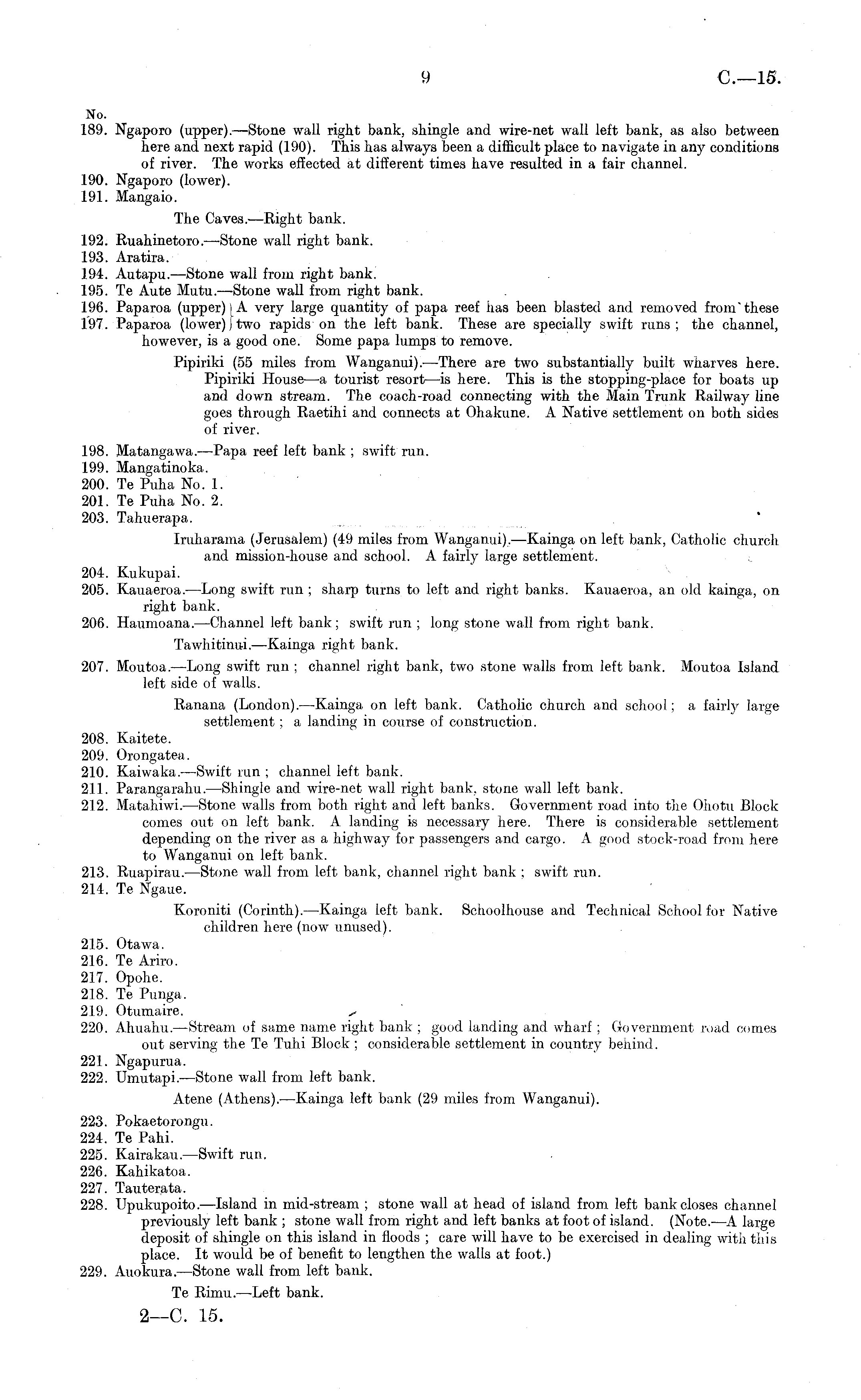 No. 189. Ngaporo (upper).—Stone wall right bank, shingle and wire-net wall left bank, as also between here and next rapid (190). This has always been a difficult place to navigate in any conditions of river. The works effected at different times have resulted in a fair channel. 190. Ngaporo (lower). 191. Mangaio. The Caves. —-Right bank. 192. Ruahinetoro.—Stone wall right bank. 193. Aratira. 194. Autapu. —Stone wall from right bank. 195. Te Aute Mutu.—-Stone wall from right bank. 196. Paparoa (upper) | A very large quantity of papa reef has been blasted and removed from'these 197. Paparoa (lower) j two rapids on the left bank. These are specially swift runs; the channel, however, is a good one. Some papa lumps to remove. Pipiriki (55 miles from Wanganui).—There are two substantially built wharves here. Pipiriki House —a tourist resort —is here. This is the stopping-place for boats up and down stream. The coach-road connecting with the Main Trunk Railway line goes through Raetihi and connects at Ohakune. A Native settlement on both sides of river. 198. Matangawa. —Papa reef left bank ; swift run. 199. Mangatinoka. 200. Te Puha No. 1. 201. Te Puha No. 2. 203. Tahuerapa. Iruharama (Jerusalem) (49 miles from Wanganui). —Kainga on left bank, Catholic church and mission-house and school. A fairly large settlement. 204. Kukupai. 205. Kauaeroa. —Long swift run ; sharp turns to left and right banks. Kauaeroa, an old kainga, on right bank. 206. Haumoana. —Channel left bank; swift ran ; long stone wall from right bank. Tawhitinui.—Kainga right bank. 207. Moutoa.—Long swift run ; channel right bank, two stone walls from left bank. Moutoa Island left side of walls. Ranana (London). —Kainga on left bank. Catholic church and school; a fairly large settlement ; a landing in course of construction. 208. Kaitete. 209. Orongatea. 210. Kaiwaka. —Swift run ; channel left bank. 211. Parangarahu. —Shingle and wire-net wall right bank, stone wall left bank. 212. Matahiwi.—Stone walls from both right and left banks. Government road into the Ohotu Block comes out on left bank. A landing is necessary here. There is considerable settlement depending on the river as a highway for passengers and cargo. A good stock-road from here to Wanganui on left bank. 213. Ruapirau.—Stone wall from left bank, channel right bank ; swift run. 214. Te Ngaue. Koroniti (Corinth). —Kainga left bank. Schoolhouse and Technical School for Native children here (now unused). 215. Otawa. 216. Te Ariro. 217. Opohe. 218. Te Punga. 219. Otumaire. s 220. Ahuahu. —Stream of same name right bank ; good landing and wharf ; Government road comes out serving the Te Tuhi Block ; considerable settlement in country behind. 221. Ngapurua. 222. Umutapi. —Stone wall from left bank. Atene (Athens). —Kainga left bank (29 miles from Wanganui). 223. Pokaetorongu. 224. Te Pahi. 225. Kairakau. —Swift run. 226. Kahikatoa. 227. Tauterata. 228. Upukupoito. —Island in mid-stream ; stone wall at head of island from left bank closes channel previously left bank ; stone wall from right and left banks at foot of island. (Note. —A large deposit of shingle on this island in floods ; care will have to be exercised in dealing with this place. It would be of benefit to lengthen the walls at foot.) 229. Auokura. —Stone wall from left bank.