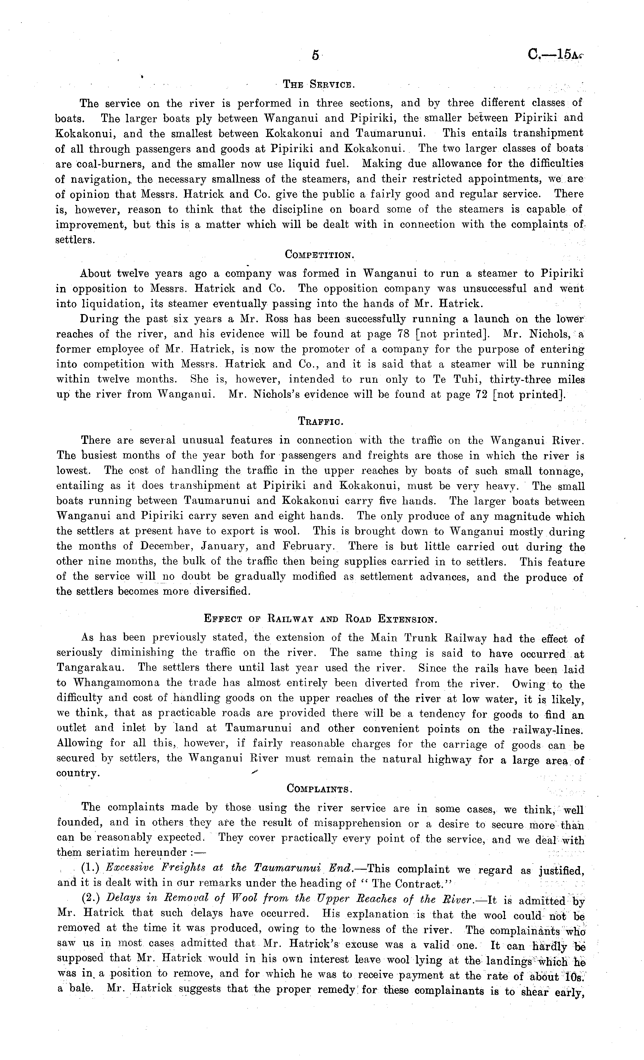 The Service. • . . . : • • The service on the river is performed in three sections, and by three different classes of boats. The larger boats ply between Wanganui and Pipiriki, the smaller between Pipiriki and Kokakonui, and the smallest between Kokakonui and Taumarunui. This entails transhipment of all through passengers and goods at Pipiriki and Kokakonui. The two larger classes of boats are coal-burners, and the smaller now use liquid fuel. Making due allowance for the difficulties of navigation,, the necessary smallness of the steamers, and their restricted appointments, we are of opinion that Messrs. Hatrick and Co. give the public a fairly good and regular service. There is, however, reason to think that the discipline on board some of the steamers is capable of improvement, but this is a matter which will be dealt with in connection with the complaints ofsettlers. Competition. About twelve years ago a company was formed in Wanganui to run a steamer to Pipiriki in opposition to Messrs. Hatrick and Co. The opposition company was unsuccessful and went into liquidation, its steamer eventually passing into the hands of Mr. Hatrick. During the past six years a Mr. Ross has been successfully running a launch on the lower reaches of the river, and his evidence will be found at page 78 [not printed]. Mr. Nichols, a former employee of Mr. Hatrick, is now the promoter of a company for the purpose of entering into competition with Messrs. Hatrick and Co., and it is said that a steamer will be running within twelve months. .She is, however, intended to run only to Te Tuhi, thirty-three miles up the river from Wanganui. Mr. Nichols's evidence will be found at page 72 [not printed]. Traffic. There are several unusual features in connection with the traffic on the Wanganui River. The busiest months of the year both for passengers and freights are those in which the river is lowest. The cost of handling the traffic in the upper reaches by boats of such small tonnage, entailing as it does transhipment at Pipiriki and Kokakonui, must be very heavy. The small boats running between Taumarunui and Kokakonui carry five hands. The larger boats between Wanganui and Pipiriki carry seven and eight hands. The only produce of any magnitude which the settlers at present have to export is wool. This is brought down to Wanganui mostly during the months of December, January, and February. There is but little carried out during the other nine months, the bulk of the traffic then being supplies carried in to settlers. This feature of the service will no doubt be gradually modified as settlement advances, and the produce of the settlers becomes more diversified. Effect of Railway and Road Extension. As has been previously stated, the extension of the Main Trunk Railway had the effect of seriously diminishing the traffic on the river. The same thing is said to have occurred at Tangarakau. The settlers there until last year used the river. Since the rails have been laid to Whangamomona the trade has almost entirely been diverted from the river. Owing to the difficulty and cost of handling goods on the upper reaches of the river at low water, it is likely, we think,, that as practicable roads are provided there will be a tendency for goods to find an outlet and inlet by land at Taumarunui and other convenient points on the railway-lines. Allowing for all this, however, if fairly reasonable charges for the carriage of goods can be secured by settlers, the Wanganui River must remain the natural highway for a large area of country. ** Complaints. The complaints made by those using the river service are in some cases, we think, well founded, and in others they are the result of misapprehension or a desire to secure more than can be reasonably expected. They cover practically every point of the service, and we deal with them seriatim hereunder :— . ;;■..■■■ (1.) Excessive Freights at the Taumarunui End. —This complaint we regard as justified, and it is dealt with in our remarks under the heading of " The Contract." (2.) Delays in Removal of Wool from the Upper Reaches of the River.—lt is admitted by Mr. Hatrick that such delays have occurred. His explanation is that the wool could not be removed at the time it was produced, owing to the lowness of the river. The complainants who saw us in most cases admitted that Mr. Hatrick's excuse was a valid one. It can hardly be supposed that Mr. Hatrick would in his own interest leave wool lying at the : landings' which he was in. a position to remove, and for which he was to receive payment at the rate of about 10s. a bale. Mr. Hatrick suggests that the proper remedy: for these complainants is to shear early,
