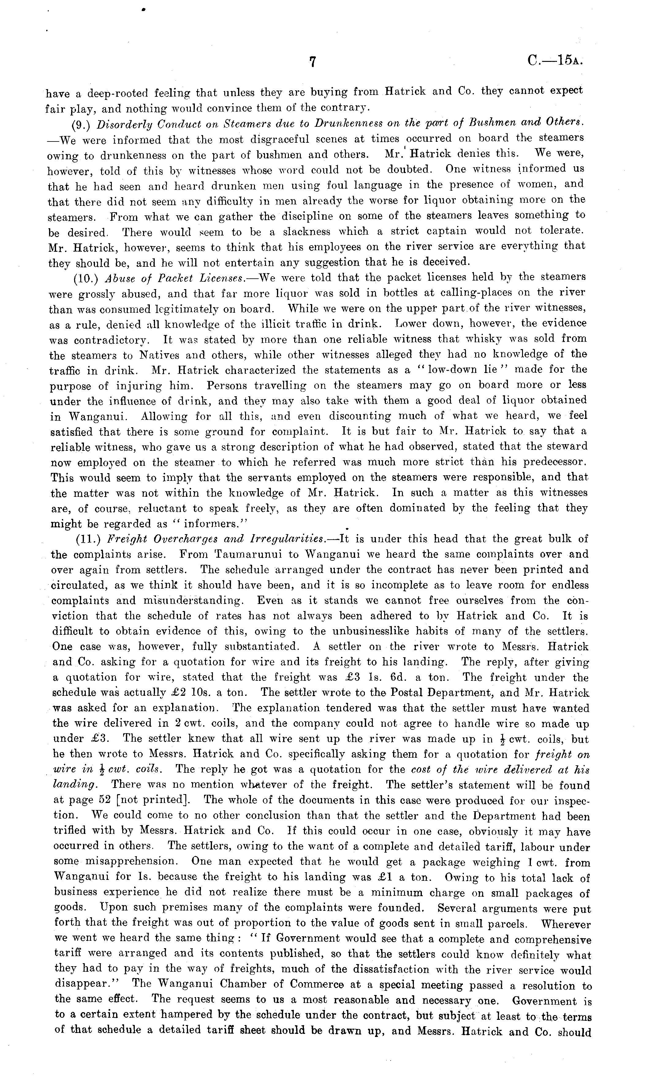 have a deep-rooted feeling that unless they are buying from Hatrick and Co. they cannot expect fair play, and nothing would convince them of the contrary. (9.) Disorderly Conduct on Steamers due to Drunkenness on the part of Bushmen and Others. —We were informed that the most disgraceful scenes at times occurred on board the steamers owing to drunkenness on the part of bushmen and others. Mr.' Hatrick denies this. We were, however, told of this by witnesses whose word could not be doubted. One witness informed us that he had seen and heard drunken men using foul language in the presence of women, and that there did not seem any difficulty in men already the worse for liquor obtaining more on the steamers. From what we can gather the discipline on some of the steamers leaves something to be desired. There would seem to be a slackness which a strict captain would not tolerate. Mr. Hatrick, however, seems to think that his employees on the river service are everything that they should be, and he will not entertain any suggestion that he is deceived. (10.) Abuse of Packet Licenses. —We were told that the packet licenses held by the steamers were grossly abused, and that far more liquor was sold in bottles at calling-places on the river than was consumed legitimately on board. While we were on the upper part of the river witnesses, as a rule, denied all knowledge of the illicit traffic in drink. Lower down, however, the evidence was contradictory. It was stated by more than one reliable witness that whisky was sold from the steamers to Natives and others, while other witnesses alleged they had no knowledge of the traffic in drink. Mr. Hatrick characterized the statements as a " low-down lie " made for the purpose of injuring him. Persons travelling on the steamers may go on board more or less under the influence of drink, and they may also take with them a good deal of liquor obtained in Wanganui. Allowing for all this, and even discounting much of what we heard, we feel satisfied that there is some ground for complaint. It is but fair to Mr. Hatrick to say that a reliable witness, who gave us a strong description of what he had observed, stated that the steward now employed on the steamer to which he referred was much more strict than his predecessor. This would seem to imply that the servants employed on the steamers were responsible, and that the matter was not within the knowledge of Mr. Hatrick. In such a matter as this witnesses are, of course, reluctant to speak freely, as they are often dominated by the feeling that they might be regarded as " informers." (11.) Freight Overcharges and. Irregularities. —-It is under this head that the great bulk of the complaints arise. From Taumarunui to Wanganui we heard the same complaints over and over again from settlers. The schedule arranged under the contract has never been printed and circulated, as we think it should have been, and it is so incomplete as to leave room for endless complaints and misunderstanding. Even as it stands we cannot free ourselves from the conviction that the schedule of rates has not always been adhered to by Hatrick and Co. It is difficult to obtain evidence of this, owing to the unbusinesslike habits of many of the settlers. One case was, however, fully substantiated. A settler on the river wrote to Messrs. Hatrick and Co. asking for a quotation for wire and its freight to his landing. The reply, after giving a quotation for wire, stated that the freight was £3 Is. 6d. a ton. The freight under the schedule was actually £2 10s. a ton. The settler wrote to the Postal Department, and Mr. Hatrick was asked for an explanation. The explanation tendered was that the settler must have wanted the wire delivered in 2 cwt. coils, and the company could not agree to handle wire so made up under £3. The settler knew that all wire sent up the river was made up in | cwt. coils, but he then wrote to Messrs. Hatrick and Co. specifically asking them for a quotation for freight on -wire in \ cwt. coils. The reply he got was a quotation for the cost of the wire delivered at his landing. There was no mention whatever of the freight. The settler's statement will be found at page 52 [not printed]. The whole of the documents in this case were produced for our inspection. We could come to no other conclusion than that the settler and the Department had been trifled with by Messrs. Hatrick and Co. If this could occur in one case, obviously it may have occurred in others. The settlers, owing to the want of a complete and detailed tariff, labour under some misapprehension. One man expected that he would get a package weighing 1 cwt. from Wanganui for Is. because the freight to his landing was £1 a ton. Owing to his total lack of business experience he did not realize there must be a minimum charge on small packages of goods. Upon such premises many of the complaints were founded. Several arguments were put forth that the freight was out of proportion to the value of goods sent in small parcels. Wherever we went we heard the same thing : " If Government would see that a complete and comprehensive tariff were arranged and its contents published, so that the settlers could know definitely what they had to pay in the way of freights, much of the dissatisfaction with the river service would disappear." The Wanganui Chamber of Commerce at a special meeting passed a resolution to the same effect. The request seems to us a most reasonable and necessary one. Government is to a certain extent hampered by the schedule under the contract, but subject at least to the terms of that schedule a detailed tariff sheet should be drawn up, and Messrs. Hatrick and Co. should