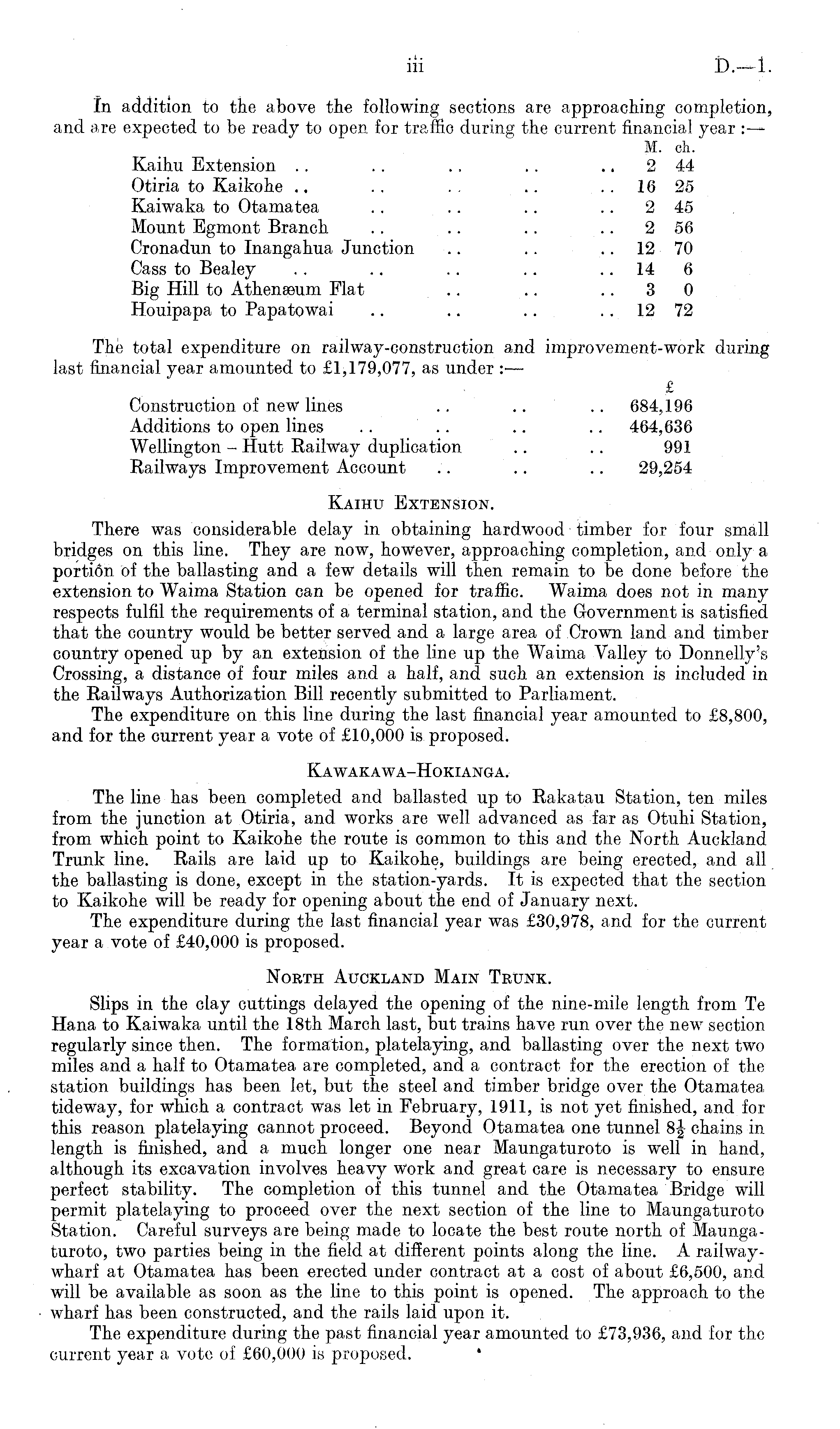 In addition to the above the following sections are approaching completion, and are expected to be ready to open for traffic during the current financial year : — M. oh. Kaihu Extension . . . . .. . . 2 44 Otiria to Kaikohe .. .. . . .. 16 25 Kaiwaka to Otamatea . . .. .. 2 45 Mount Egmont Branch . . .. . . 2 56 Cronadun to Inangahua Junction .. . . 12 70 Cass to Bealey . . .. .. .. 14 6 Big Hill to Athenaeum Flat .. .. ..30 Houipapa to Papatowai .. .. .. . . 12 72 The total expenditure on railway-construction and improvement-work during last financial year amounted to £1,179,077, as under :■ — £ Construction of new lines .. .. .. 684,196 Additions to open lines .. .. .. .. 464,636 Wellington - Hutt Railway duplication .. .. 991 Railways Improvement Account .. .. .. 29,254 Kaihu Extension. There was considerable delay in obtaining hardwood timber for four small bridges on this line. They are now, however, approaching completion, and only a portion of the ballasting and a few details will then remain to be done before the extension to Waima Station can be opened for traffic. Waima does not in many respects fulfil the requirements of a terminal station, and the Government is satisfied that the country would be better served and a large area of Crown land and timber country opened up by an extension of the line up the Waima Valley to Donnelly's Crossing, a distance of four miles and a half, and such an extension is included in the Railways Authorization Bill recently submitted to Parliament. The expenditure on this line during the last financial year amounted to £8,800, and for the current year a vote of £10,000 is proposed. Kawakawa-Hokianga. The line has been completed and ballasted up to Rakatau Station, ten miles from the junction at Otiria, and works are well advanced as far as Otuhi Station, from which point to Kaikohe the route is common to this and the North Auckland Trunk line. Rails are laid up to Kaikohe, buildings are being erected, and all the ballasting is done, except in the station-yards. It is expected that the section to Kaikohe will be ready for opening about the end of January next. The expenditure during the last financial year was £30,978, and for the current year a vote of £40,000 is proposed. North Auckland Main Trunk. Slips in the clay cuttings delayed the opening of the nine-mile length from Te Hana to Kaiwaka until the 18th March last, but trains have run over the new section regularly since then. The formation, platelaying, and ballasting over the next two miles and a half to Otamatea are completed, and a contract for the erection of the station buildings has been let, but the steel and timber bridge over the Otamatea tideway, for which a contract was let in February, 1911, is not yet finished, and for this reason platelaying cannot proceed. Beyond Otamatea one tunnel 8j chains in length is finished, and a much longer one near Maungaturoto is well in hand, although its excavation involves heavy work and great care is necessary to ensure perfect stability. The completion of this tunnel and the Otamatea Bridge will permit platelaying to proceed over the next section of the line to Maungaturoto Station. Careful surveys are being made to locate the best route north of Maungaturoto, two parties being in the field at different points along the line. A railwaywharf at Otamatea has been erected under contract at a cost of about £6,500, and will be available as soon as the line to this point is opened. The approach to the wharf has been constructed, and the rails laid upon it. The expenditure during the past financial year amounted to £73,936, and for the current year a vote of £60,000 is proposed.