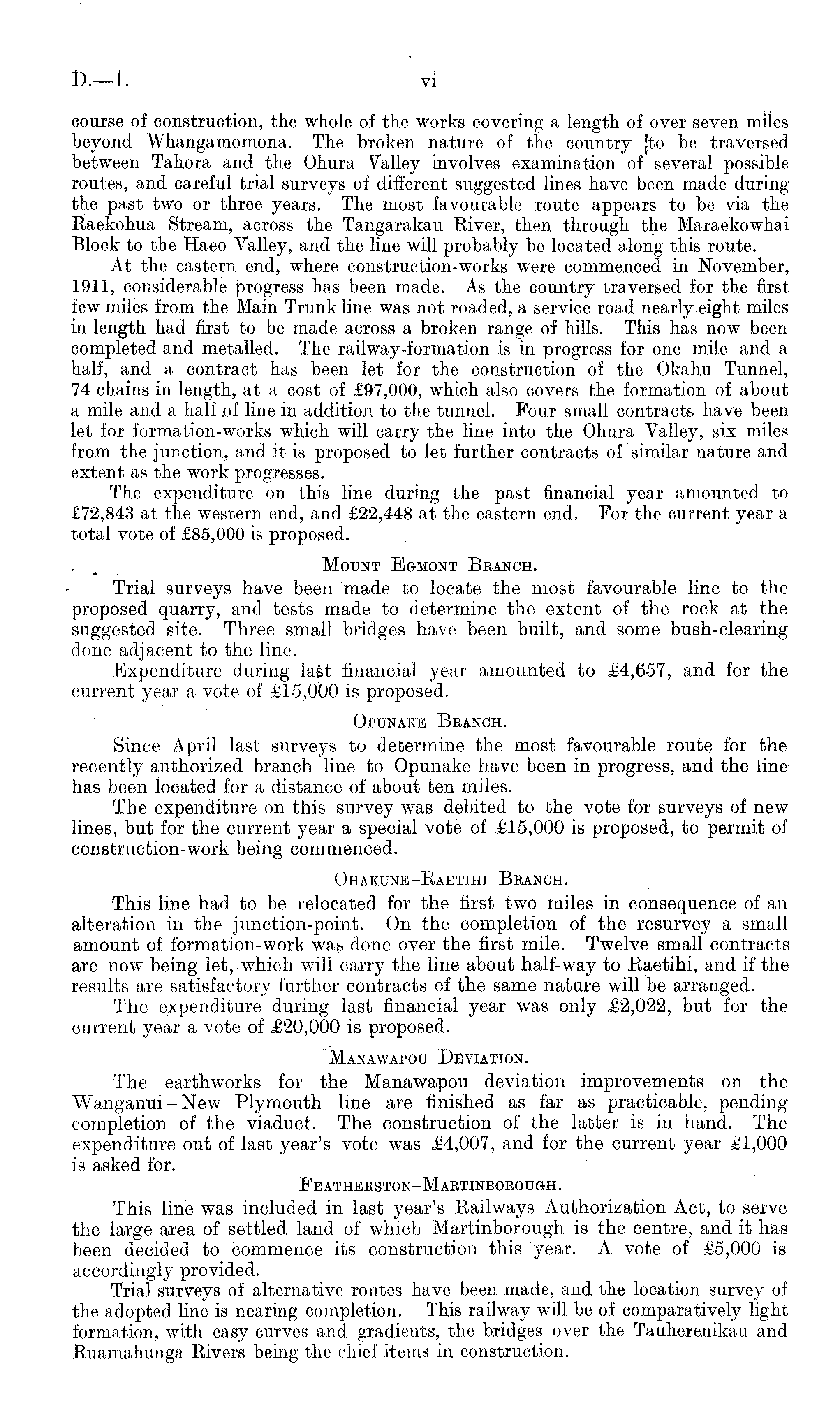 course of construction, the whole of the works covering a length of over seven miles beyond Whangamomona. The broken nature of the country [to be traversed between Tahora and the Ohura Valley involves examination of several possible routes, and careful trial surveys of different suggested lines have been made during the past two or three years. The most favourable route appears to be via the Raekohua Stream, across the Tangarakau River, then through the Maraekowhai Block to the Haeo Valley, and the line will probably be located along this route. At the eastern end, where construction-works were commenced in November, 1911, considerable progress has been made. As the country traversed for the first few miles from the Main Trunk line was not roaded, a service road nearly eight miles in length had first to be made across a broken range of hills. This has now been completed and metalled. The railway-formation is in progress for one mile and a half, and a contract has been let for the construction of the Okahu Tunnel, 74 chains in length, at a cost of £97,000, which also covers the formation of about a mile and a half .of line in addition to the tunnel. Four small contracts have been let for formation-works which will carry the line into the Ohura Valley, six miles from the junction, and it is proposed to let further contracts of similar nature and extent as the work progresses. The expenditure on this line during the past financial year amounted to £72,843 at the western end, and £22,448 at the eastern end. For the current year a total vote of £85,000 is proposed. Mount Egmont Branch. Trial surveys have been made to locate the most favourable line to the proposed quarry, and tests made to determine the extent of the rock at the suggested site. Three small bridges have been built, and some bush-clearing done adjacent to the line. Expenditure during last financial year amounted to £4,657, and for the current year a vote of £15,000 is proposed. Opunake Branch. Since April last surveys to determine the most favourable route for the recently authorized branch line to Opunake have been in progress, and the line has been located for a distance of about ten miles. The expenditure on this survey was debited to the vote for surveys of new lines, but for the current year a special vote of £15,000 is proposed, to permit of construction-work being commenced. Ohakune-Baetihi Branch. This line had to be relocated for the first two miles in consequence of an alteration in the junction-point. On the completion of the resurvey a small amount of formation-work was done over the first mile. Twelve small contracts are now being let, which will carry the line about half-way to Raetihi, and if the results are satisfactory further contracts of the same nature will be arranged. The expenditure during last financial year was only £2,022, but for the current year a vote of £20,000 is proposed. Manawapou Deviation. The earthworks for the Manawapou deviation improvements on the Wanganui - New Plymouth line are finished as far as practicable, pendingcompletion of the viaduct. The construction of the latter is in hand. The expenditure out of last year's vote was £4,007, and for the current year £1,000 is asked for. Featherston-Martlnborough. This line was included in last year's Railways Authorization Act, to serve the large area of settled land of which Martinborough is the centre, and it has been decided to commence its construction this year. A vote of £5,000 is accordingly provided. Trial surveys of alternative routes have been made, and the location survey of the adopted line is nearing completion. This railway will be of comparatively light formation, with easy curves and gradients, the bridges over the Tauherenikau and Ruamahunga Rivers being the chief items in construction.