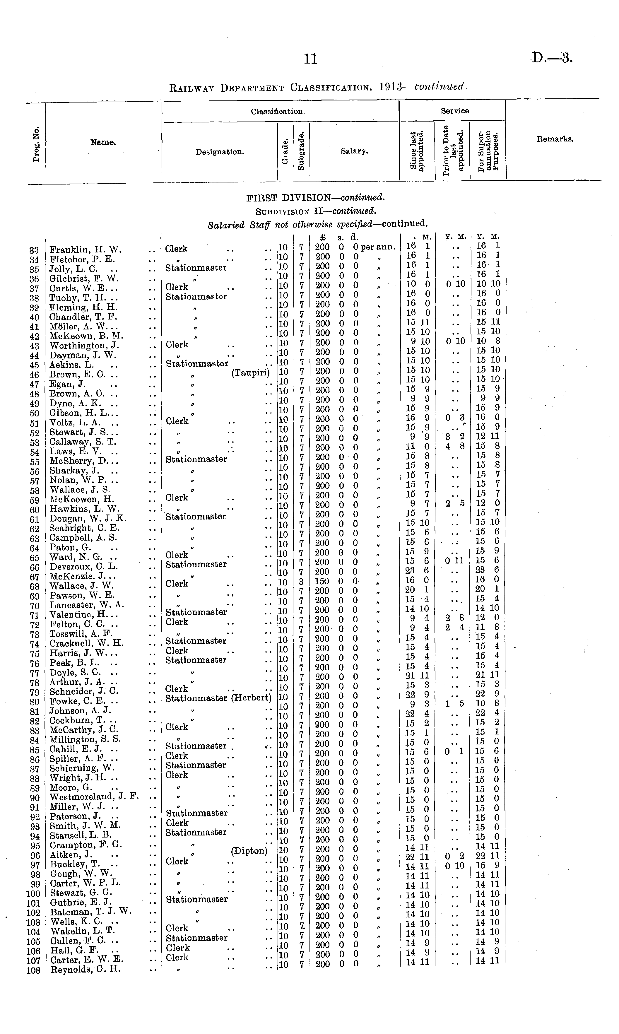 Classification. Service 6 =2 tub o H4 Name. Designation. ,3 ° CD OD CO Salary. ii || |ls -3 +f 43 ft4= CO a, a o u> a a d o 00 -"edo CQ 3 ft a a g" a. 3, a g 35 a ,2 a o a s 01 a 34 cd fc, cdft ft Remarks. FIRS. Dl [VII 3I0N — continued. Sob IIVII 3IOIS : II— continued. Salaried Staff ■lot oth wwise specified —con £ s. d. 200 0 0 perann. 200 0 0 200 0 0 200 0 0 200 0 0 200 0 0 200 0 0 200 0 0 200 0 0 200 0 0 200 0 0 200 0 0 200 0 0 200 0 0 200 0 0 200 0 0 200 0 0 200 0 0 200 0 0 200 0 0 200 0 0 200 0 0 200 0 0 200 0 0 200 0 0 200 0 0 200 0 0 200 0 0 200 0 0 200 0 0 200 0 0 200 0 0 200 0 0 200 0 0 200 0 0 150 0 0 200 0 0 200 0 0 200 0 0 200 0 0 200 0 0 200 0 0 200 0 0 200 0 0 200 0 0 200 0 0 200 0 0 200 0 0 200 0 0 200 0 0 200 0 0 200 0 0 200 0 0 200 0 0 200 0 0 200 0 0 200 0 0 200 0 0 200 0 0 200 0 0 200 0 0 200 0 0 200 0 0 200 0 0 200 0 0 200 0 0 200 0 0 200 0 0 200 0 0 200 0 0 200 0 0 200 0 0 200 0 0 200 0 0 200 0 0 200 0 0 ;inued. 33 34 35 36 37 38 39 40 41 42 43 44 45 46 47 48 49 50 51 52 53 54 55 56 57 58 59 60 61 62 63 64 65 66 67 68 69 70 71 72 73 74 75 76 77 78 79 80 81 82 83 84 85 86 87 88 89 90 91 92 93 94 95 96 97 98 99 100 101 102 103 104 105 106 107 108 Franklin, H. W. Fletcher, P. E. Jolly, L. 0. Gilchrist, F. W. Curtis, W. E. .. Tuohy, T. H. .. Fleming, H. H. Chandler, T. F. Moller, A. W. .. McKeown, B. M. Worthington, J. Dayman, J. W. Aekins, L. Brown, E. 0. .. Egan, J. Brown, A. 0. Dyne, A. K. Gibson, H. L... Voltz, L. A. Stewart, J. S. .. Callaway, S. T. Laws, E. V. McSherry, D. .. Sharkay, J. Nolan, W. P. .. Wallace, J. S. McKeowen, H. Hawkins, L. W. Dougan, W. J. K. Seabright, 0. E. Campbell, A. S. Paton, G. Ward, N. G. Devereux, 0. L. McKenzie, J. .. Wallace, J. W. Pawson, W. E. Lancaster, W. A. Valentine, H. .. Felton, 0.0. Tosswill, A. F. Cracknell, W. H. Harris, J. W. .. Peek, B. L. Doyle, S. 0. .. Arthur, J. A. Schneider, J. 0. Fowke, 0. E. Johnson, A. J. Cockburn, T. .. McCarthy, J. 0. Millington, S. S. Cahill, E. J. Spiller, A. F. .. Schierning, W. Wright, J. H. .. Moore, G. Westmoreland, J. F. Miller, W. J. Paterson, J. .. Smith, J. W. M. Stansell.L. B. Orampton, F. G. Aitken, J. Buckley, T. Gough, W. W. Carter, W. P. L. Stewart, G. G. Guthrie, E. J. Bateman, T. J. W. Wells, K. 0. Wakelin, L. T. Cullen, F. 0. Hall, G. F. Carter, E. W. E. Reynolds, G. H. Clerk Stationmaster Clerk Stationmaster Clerk Stationmaster „ (Taupiri) Clerk" Stationmaster Clerk " Stationmaster Clerk" Stationmaster Clerk" 10 10 10 10 10 10 10 10 10 10 10 10 10 10 10 10 10 10 10 10 10 10 10 10 10 10 10 10 10 10 10 10 10 10 10 10 10 10 10 10 10 10 10 10 10 10 10 10 10 10 10 10 10 10 10 10 10 10 10 10 10 10 10 10 10 10 10 10 10 10 10 10 10 10 10 10 7 7 7 7 7 7 7 7 7 7 7 7 7 7 7 7 7 7 7 7 7 7 7 7 7 7 7 7 7 7 7 7 7 7 7 3 7 7 7 7 7 7 7 7 7 7 7 7 7 7 7 7 7 7 7 7 7 7 7 7 7 7 7 7 7 7 7 7 7 7 7 7 7 7 7 7 . M. 16 1 16 1 16 1 16 1 10 0 16 0 16 0 16 0 15 11 15 10 9 10 15 10 15 10 15 10 15 10 15 9 9 9 15 9 15 9 15 9 9 9 11 0 15 8 15 8 15 7 15 7 15 7 9 7 15 7 15 10 15 6 15 6 15 9 15 6 23 6 16 0 20 1 15 4 14 10 9 4 9 4 15 4 15 4 15 4 15 4 21 11 15 3 22 9 9 3 22 4 15 2 15 1 15 0 15 6 15 0 15 0 15 0 15 0 15 0 15 0 15 0 15 0 15 0 14 11 22 11 14 11 14 11 14 11 14 10 14 10 14 10 14 10 14 10 14 9 14 9 14 11 Y. M. o'io o'io 0 " 8 . s"2 4 8 2 '5 oil a"8 2 4 l"5 o"i 0"2 0 10 Y. M. 16 1 16 1 16 1 16 1 10 10 16 0 16 0 16 0 15 11 15 10 10 8 15 10 15 10 15 10 15 10 15 9 9 9 15 9 16 0 15 9 12 11 15 8 15 8 15 8 15 7 15 7 15 7 12 0 15 7 15 10 15 6 15 6 15 9 15 6 23 6 16 0 20 1 15 4 14 10 12 0 11 8 15 4 15 4 15 4 15 4 21 11 15 3 22 9 10 8 22 4 15 2 15 1 15 0 15 6 15 0 15 0 15 0 15 0 15 0 15 0 15 0 15 0 15 0 14 11 22 11 15 9 14 11 14 11 14 10 14 10 14 10 14 10 14 10 14 9 14 9 14 11 Stationmaster Clerk Stationmaster Clerk Stationmaster Clerk " Stationmaster (Herbert) Clerk Stationmaster . Clerk Stationmaster Clerk Stationmaster Clerk Stationmaster (Dipton) Clerk Stationmaster Clerk Stationmaster Clerk Clerk
