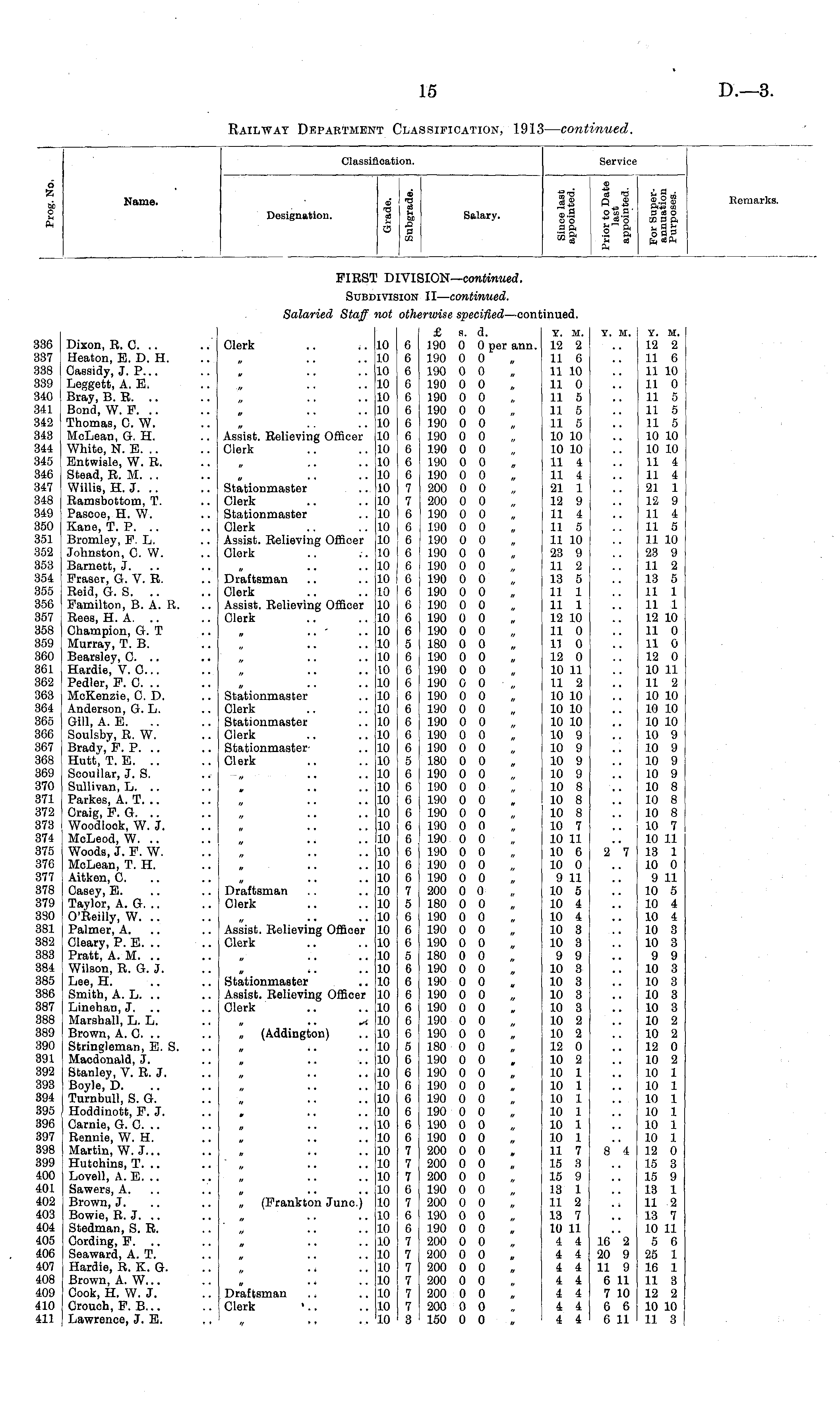 Classi] [cation. Service 6 tub p Name. Designation. o 3 u 00 O 02 Salary. li U 111 cd9 0(C 9 3cdo cdo cd o t/3 3 ft oo, g" a 3. a w ao. -2 ft o a 3 m cd 3. oS ft edft Remarks. FIRS' 1 D IVK 3ION— continued. Stjbi HVIi JION II— continued. Salaried Staff not otht \rwise specified —com iinued. 336 337 338 339 340 341 342 343 344 345 346 347 348 349 350 351 362 353 354 355 356 357 358 359 360 361 362 363 364 365 366 367 368 369 370 371 372 373 374 375 376 377 378 379 330 381 382 383 384 385 386 387 388 389 390 391 392 393 394 395 396 397 398 399 400 401 402 403 404 405 406 407 408 409 410 411 Dixon, R. 0. Heaton, E. D. H. Cassidy, J. P... Leggett, A. E. Bray, B. R. Bond, W. F. Thomas, 0. W. McLean, G. H. White, N. E. .. Entwisle, W. R. Stead, R. M. .. Willis, H. J. Ramsbottom, T. Pascoe, H. W. Kane, T. P. Bromley, F. L. Johnston, 0. W. Barnett, J. Fraser, G. V. R. Reid, G. S. .. Familton, B. A. R. Rees, H. A. Champion, G. T Murray, T. B. Bearsley, 0. .. Hardie, V. 0... Pedler, F. 0. .. McKenzie, 0. D. Anderson, G. L. Gill, A. E. Soulsby, R. W. Brady, F. P. Hutt, T. E. Scoullar, J. S. Sullivan, L. .. Parkes, A. T. .. Graig, F. G. Woodlook, W. J. McLeod, W. .. Woods, J. F. W. McLean, T. H. Aitken, C. Casey, E. Taylor, A. G. .. O'Reilly, W. .. Palmer, A. Cleary, P. E. .. Pratt, A. M. Wilson, R. G. J. Lee, H. Smith, A. L. Linehan, J. Marshall, L. L. Brown, A. 0. Stringleman, E. S. Macdonald, J. Stanley, V. R. J. Boyle, D. Turnbull, S. G. Hoddinott, F. J. Carnie, G. 0. Rennie, W. H. Martin, W.J... Hutohins, T. .. Lovell, A. E. .. Sawers, A. Brown, J. Bowie, R. J. Stedman, S. R. Cording, F. .. Seaward, A. T. Hardie, R. K. G. Brown, A. W... Cook, H. W. J. Crouch, F. B... Lawrence, J. E. Clerk Assist. Relieving Officer Clerk Stationmaster Clerk Stationmaster Clerk Assist. Relieving Officer Clerk Draftsman Clerk Assist. Relieving Officer Clerk Stationmaster Clerk Stationmaster Clerk StationmasterClerk 10 10 10 10 10 10 10 10 10 10 10 10 10 10 10 10 10 10 10 10 10 10 10 10 10 10 10 10 10 10 10 10 10 10 10 10 10 10 10 10 10 10 10 10 10 1.0 10 10 10 10 10 10 10 10 10 10 1.0 10 10 10 10 10 10 10 10 10 10 10 10 10 10 10 10 10 10 10 6 6 G 6 6 G G 6 6 6 G 7 7 G G 6 6 6 G 6 6 6 6 5 6 G 6 G 6 6 G 6 5 6 6 6 6 6 6 6 6 6 7 5 C 6 G 5 G 6 6 6 6 6 5 6 6 6 6 6 6 6 7 7 7 6 7 6 6 7 7 7 7 7 7 3 £ s. d. 190 0 0 per ann. 190 0 0 190 0 0 190 0 0 190 0 0 190 0 0 190 0 0 190 0 0 190 0 0 190 0 0 190 0 0 200 0 0 200 0 0 190 0 0 190 0 0 190 0 0 190 0 0 190 0 0 190 0 0 190 0 0 190 0 0 190 0 0 190 0 0 180 0 0 190 0 0 190 0 0 190 0 0 190 0 0 190 0 0 190 0 0 190 0 0 190 0 0 180 0 0 190 0 0 190 0 0 190 0 0 190 0 0 190 0 0 190 0 0 190 0 0 190 0 0 190 0 0 200 0 0 180 0 0 190 0 0 190 0 0 190 0 0 180 0 0 190 0 0 190 0 0 190 0 0 190 0 0 190 0 0 190 0 0 180 0 0 190 0 0 190 0 0 190 0 0 190 0 0 190 0 0 190 0 0 190 0 0 200 0 0 200 0 0 200 0 0 190 0 0 200 0 0 190 0 0 190 0 0 200 0 0 200 0 0 200 0 0 200 0 0 200 0 0 200 0 0 150 0 0 Y. M. 12 2 11 6 11 10 11 0 11 5 11 5 11 5 10 10 10 10 11 4 11 4 21 1 12 9 11 4 11 5 11 10 23 9 11 2 13 5 11 1 11 1 12 10 11 0 11 0 12 0 10 11 11 2 10 10 10 10 10 10 10 9 10 9 10 9 10 9 10 8 10 8 10 8 10 7 10 11 10 6 10 0 9 11 10 5 10 4 10 4 10 3 10 3 9 9 10 3 10 3 10 3 10 3 10 2 10 2 12 0 10 2 10 1 10 1 10 1 10 1 10 1 10 1 11 7 15 3 15 9 13 1 11 2 13 7 10 11 4 4 4 4 4 4 4 4 4 4 4 4 4 4 Y. M. 2 7 8 4 i6"a 20 9 11 9 6 11 7 10 6 6 6 11 Y. M. 12 2 11 6 11 10 11 0 11 5 11 5 11 5 10 10 10 10 11 4 11 4 21 1 12 9 11 4 11 5 11 10 23 9 11 2 13 5 11 1 11 1 12 10 11 0 11 0 12 0 10 11 11 2 10 10 10 10 10 10 10 9 10 9 10 9 10 9 10 8 10 8 10 8 10 7 10 11 13 1 10 0 9 11 10 5 10 4 10 4 10 3 10 3 9 9 10 3 10 3 10 3 10 3 10 2 10 2 12 0 10 2 10 1 10 1 10 1 10 1 10 1 10 1 12 0 15 3 15 9 13 1 11 2 13 7 10 11 5 6 25 1 16 1 11 3 12 2 10 10 11 3 Draftsman Clerk Assist. Relieving Officer Clerk Stationmaster Assist. Relieving Officer Clerk „ (Addington) „ (Frankton June.) Draftsman Clerk tf ' t • •