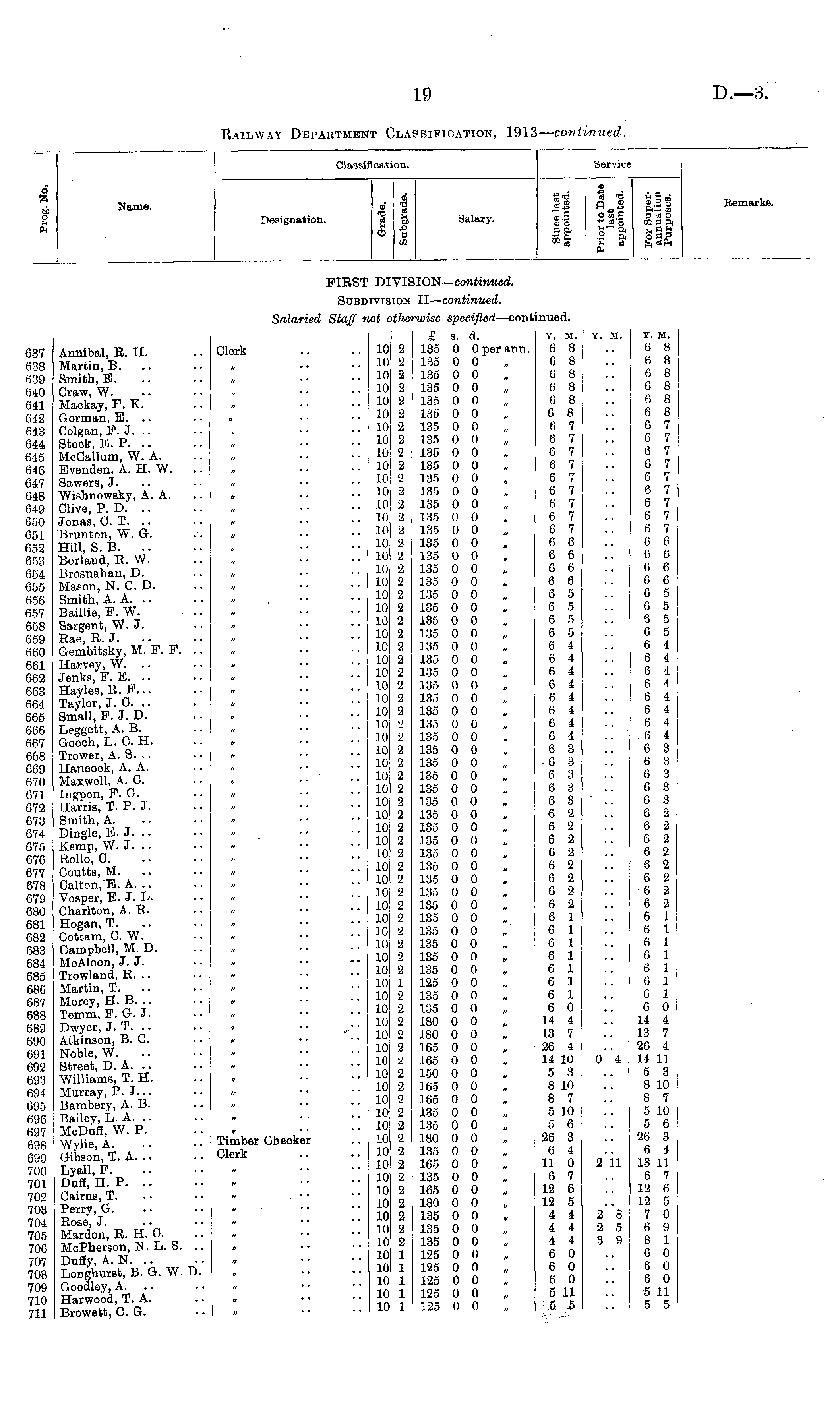 Classification. Service 6 e'e p ft Name. Designation. a eg 1 o -g CO Salary. i| i.| Mi cd9 0~S SdO oo ccaa a a g~ a 3. a g ag 1 I 3 g§ft ft Remarks. FIRST DI VIS HON— continued. SUBDIVIS! ION II— continued. 637 638 639 640 641 642 643 644 645 646 647 648 649 650 651 652 653 654 655 656 657 658 659 660 661 662 663 664 665 666 667 668 669 670 671 672 673 674 675 676 677 678 679 680 681 682 683 684 685 686 687 688 689 690 691 692 693 694 695 696 697 698 699 700 701 702 703 704 705 706 707 708 709 710 711 Annibal, R. H. Martin, B. Smith, E. Craw, W. Mackay, F. K. Gorman, E. .. Colgan, F. J. .. Stock, E. P. .. McCallum, W. A. Evenden, A. H. W. Sawers, J. Wishnowsky, A. A. Clive, P. D. .. Jonas, 0. T. .. Brunton, W. G. Hill, S. B. Borland, R. W. Brosnahan, D. Mason, N. CD. Smith, A. A. .. Baillie, F. W. Sargent, W. J. Rae, R. J. Gembitsky, M. F. F. Harvey, W. .. Jenks, F. E. .. Hayles, R. F... Taylor, J. 0. .. Small, F. J. D. Leggett, A. B. Gooch, L. 0. H. Trower, A. S. .. Hancock, A. A. Maxwell, A. 0. Ingpen, F. G. Harris, T. P. J. Smith, A. Dingle, E. J. .. Kemp, W. J. .. Rollo, 0. Coutts, M. Calton.E. A. .. Vosper, E. J. L. Charlton, A. R. Hogan, T. Cottam, 0. W. Campbell, M. D. McAloon, J. J. Trowland, R. .. Martin, T. .. Morey, H. B. .. Temm, F. G. J. Dwyer, J. T. .. Atkinson, B. 0. Noble, W. Street, D. A. .. Williams, T. H. Murray, P.J... Bambery, A. B. Bailey, L. A. .. McDuff, W. P. Wylie, A Gibson, T. A. .. Lyall, F. Duff, H. P Gairns, T. Perry, G. Rose, J. Mardon, R. H. 0. McPherson, N. L. S. Duffy, A. N. .. Longhurst, B. G. W. D. Goodley, A. Harwood, T. A. Browett, C.G. Salaried Staff not o Clerk .. ..10 in ..10 in ..10 in ..10 in ..10 in ..10 in ..10 in ..10 in ..10 in ..10 in ..10 in ..10 in ..10 in •• 1" in • • io in ..10 in .. 10 in ..10 in ..10 m ..10 in •• io in ••10 in ■•10 in • ■ 1° in • • io in ••10 in ..10 in ••10 in ••10 in ••1° in ..10 in ..10 in -.10 in ..10 in ..10 in ..10 in 10 10 10 10 10 10 10 1.0 10 10 10 10 10 10 10 10 10 10 10 10 10 10 10 10 10 10 10 10 10 10 1.0 10 10 10 10 10 10 10 10 10 10 10 10 10 10 10 10 10 10 10 10 10 10 10 10 1.0 10 10 10 10 10 10 10 10 10 10 10 10 10 10 10 10 10 10 10 ithei 2 2 2 2 2 2 2 2 2 2 2 2 2 2 2 2 2 2 2 2 2 2 2 2 2 2 2 2 2 o 2 2 2 2 2 2 2 2 2 2 2 2 2 2 2 2 2 2 2 1 2 2 2 2 2 2 2 2 2 2 2 2 2 2 2 2 2 2 2 2 1 1 1 1 1 'wise specified —cont; £ a. d. 135 0 0 per ann. 135 0 0 135 0 0 135 0 0 135 0 0 135 0 0 135 0 0 135 0 0 135 0 0 135 0 0 135 0 0 135 0 0 135 0 0 135 0 0 135 0 0 135 0 0 135 0 0 135 0 0 135 0 0 135 0 0 135 0 0 135 0 0 135 0 0 135 0 0 135 0 0 135 0 0 135 0 0 135 0 0 135 0 0 135 0 0 135 0 0 135 0 0 135 0 0 135 0 0 135 0 0 135 0 0 135 0 0 135 0 0 135 0 0 135 0 0 135 0 0 135 0 0 135 0 0 135 0 0 . 1 135 0 0 135 0 0 135 0 0 135 0 0 135 0 0 125 0 0 135 0 0 135 0 0 180 0 0 180 0 0 165 0 0 165 0 0 150 0 0 165 0 0 165 0 0 135 0 0 135 0 0 180 0 0 135 0 0 165 0 0 135 0 0 165 0 0 180 0 0 135 0 0 135 0 0 135 0 0 125 0 0 125 0 0 125 0 0 125 0 0 125 0 0 inued. Y. M. 6 8 6 8 6 8 6 8 6 8 6 8 6 7 6 7 6 7 6 7 6 7 6 7 6 7 6 7 6 7 6 6 6 6 6 6 6 6 6 5 6 5 6 5 6 5 6 4 6 4 6 4 6 4 6 4 6 4 6 4 6 4 6 3 6 3 6 3 6 3 6 3 6 2 6 2 6 2 6 2 6 2 6 2 6 2 6 2 6 1 6 1 6 1 6 1 6 1 6 1 6 1 6 0 14 4 13 7 26 4 14 10 5 3 8 10 8 7 5 10 5 6 26 3 6 4 11 0 6 7 12 6 12 5 4 4 4 4 4 4 6 0 6 0 6 0 5 11 5 5 Y. M. o"4 211 2"8 2 5 3 9 Y. M. 6 8 6 8 6 8 6 8 6 8 6 8 6 7 6 7 6 7 6 7 6 7 6 7 6 7 6 7 6 7 6 6 6 6 6 6 6 6 6 5 6 5 6 5 6 5 6 4 6 4 6 4 6 4 6 4 6 4 6 4 6 4 6 3 6 3 6 3 6 3 6 3 6 2 6 2 6 2 6 2 6 2 6 2 6 2 6 2 6 1 6 1 6 1 6 1 6 1 6 1 6 1 6 0 14 4 13 7 26 4 14 11 5 3 8 10 8 7 5 10 5 6 26 3 6 4 13 11 6 7 12 6 12 5 7 0 6 9 8 1 6 0 6 0 6 0 5 11 5 5 ■•10 m ..10 . 10 in ..10 in ..10 in ..10 in ..10 in ..10 in ..10 in ••10 in •■10 in ..10 in ••10 in ••1° in ..10 in ■•1° in .. 10 ■■10 in •■1° m •• io in .. 10 in ..10 in ..10 in • • 1° in •• io Timber Checker .. 10 Clerk .. ..10 in ..10 in ..10 in ••1° in .. 10 in ••1° m .. 10 in •■10 in ••1° in .. 10 in ..10 in .. 10 in ..10