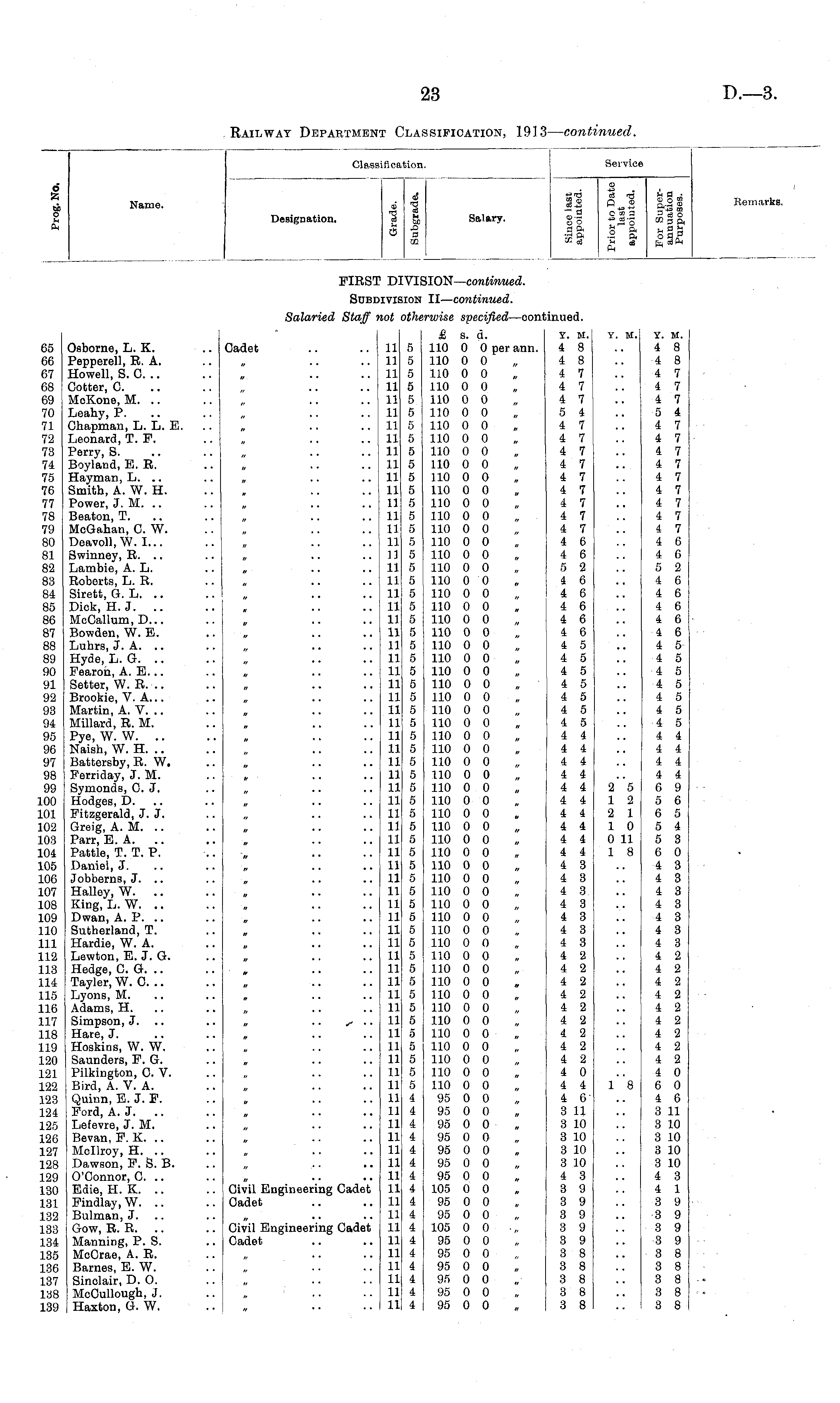 Classification. Service I DD O 34 ft Name. Designation. CD* ?> DC 5 % 02 J Salary. itii 111 aft a. a u a * Remarks. FIRS' 1 d: VII 3I0N— continued. SUB] HVIl SION II— continued. Salaried Staff clot othi '.rwise specified —coni iinued. 65 66 67 68 69 70 71 72 73 74 75 76 77 78 79 80 81 82 83 84 85 86 87 88 89 90 91 92 93 94 95 96 97 98 99 100 101 102 103 104 105 106 107 108 109 110 111 112 113 114 115 116 117 118 119 120 121 122 123 124 125 126 127 128 129 130 131 132 133 134 135 136 137 138 139 Osborne, L. K. Pepperell, R. A. Howell, S. 0. .. Cotter, 0. McKone, M. .. Leahy,P. Chapman, L. L. E. Leonard, T. F. Perry, S. Boyland, E. R. Hayman, L. .. Smith, A. W. H. Power, J. M. .. Beaton, T. McGahan, 0. W. Deavoll, W. I... Swinney, R. .. Lambie, A. L. Roberts, L. R. Sirett, G. L. Dick, H.J. .. McCallum, D... Bowden, W. E. Luhrs, J. A. Hyde, L. G. Fearon, A. E... Setter, W. R. .. Brookie, V. A... Martin, A. V. .. Millard, R. M. Pye, W. W. .. Naish, W. H. .. Battersby, R. W. Ferriday, J. M. Symonds, 0. J. Hodges, D. Fitzgerald, J. J. Greig, A. M. Parr, E. A. Pattle, T. T. P. Daniel, J. Jobberns, J. .. Halley, W. .. King, L. W. Dwan, A. P. Sutherland, T. Hardie, W. A. Lewton, E. J. G. Hedge, C. G. .. Tayler, W. O. .. Lyons, M. Adams, H. Simpson, J. Hare, J. Hoskins, W. W. Saunders, F. G. Pilkington, 0. V. Bird, A. V. A. Quinn, E. J. F. Ford, A. J. Lefevre, J. M. Bevan, F. K. Mcllroy, H. .. Dawson, F. S. B. O'Connor, O. .. Edie, H. K. .. Findlay, W. .. Bulman, J. Gow, R. R. Manning, P. S. McCrae, A. R. Barnes, E. W. Sinclair, D. O. McCullough, J. Haxton, G. W. Cadet 11 11 11 11 11 11 11 11 11 11 11 11 11 11 11 11 11 11 11 11 11 11 11 11 11 11 11 11 11 11 11 11 11 11 11 11 11 11 11 11 11 11 11 11 11 1.1 11 11 11 11 11 11 11 11 11 11 11 11 11 11 11 11 11 .11 1.1 11 11 11 11 11 11 11 11 11 11 5 5 5 5 5 5 5 5 5 5 5 5 5 5 5 5 5 5 5 5 5 5 5 5 5 5 5 5 5 5 5 5 5 5 5 5 5 5 5 5 5 5 5 5 5 5 5 5 5 5 5 5 5 5 5 5 5 5 4 4 4 4 4 4 4 4 4 4 4 4 4 4 4 4 4 £ s. d. 110 0 0 per ann. 110 0 0 110 0 0 110 0 0 110 0 0 110 0 0 110 0 0 110 0 0 110 0 0 110 0 0 110 0 0 110 0 0 110 0 0 110 0 0 „ . 110 0 0 110 0 0 110 0 0 110 0 0 110 0 0 110 0 0 110 0 0 110 0 0 110 0 0 110 0 0 110 0 0 110 0 0 110 0 0 „ 110 0 0 110 0 0 110 0 0 110 0 0 110 0 0 110 0 0 110 0 0 110 0 0 110 0 0 110 0 0 110 0 0 110 0 0 110 0 0 110 0 0 110 0 0 110 0 0 110 0 0 110 0 0 110 0 0 110 0 0 110 0 0 110 0 0 110 0 0 110 0 0 110 0 0 110 0 0 110 0 0 110 0 0 110 0 0 110 0 0 110 0 0 95 0 0 95 0 0 95 0 0 95 0 0 95 0 0 95 0 0 95 0 0 105 0 0 95 0 0 95 0 0 105 0 0 „ 95 0 0 95 0 0 95 0 0 95 0 0 95 0 0 95 0 0 Y. M. 4 8 4 8 4 7 4 7 4 7 5 4 4 7 4 7 4 7 4 7 4 7 4 7 4 7 4 7 4 7 4 6 4 6 5 2 4 6 4 6 4 6 4 6 4 6 4 5 4 5 4 5 4 5 4 5 4 5 4 5 4 4 4 4 4 4 4 4 4 4 4 4 4 4 4 4 4 4 4 4 4 3 4 3 4 3 4 3 4 3 4 3 4 3 4 2 4 2 4 2 4 2 4 2 4 2 4 2 4 2 4 2 4 0 4 4 4 6 3 11 3 10 3 10 3 10 3 10 4 3 3 9 3 9 3 9 3 9 3 9 3 8 3 8 3 8 3 8 3 8 Y. M. 2"s 1 2 2 1 1 0 0 11 1 8 1 8 Y. M. 4 8 4 8 4 7 4 7 4 7 5 4 4 7 4 7 4 7 4 7 4 7 4 7 4 7 4 7 4 7 4 6 4 6 5 2 4 6 4 6 4 6 4 6 i 6 4 5 4 5 4 5 4 5 4 5 4 5 4 5 4 4 4 4 4 4 4 4 6 9 5 6 6 5 5 4 5 3 6 0 4 3 4 3 4 3 4 3 4 3 4 3 4 3 4 2 4 2 4 2 4 2 4 2 4 2 4 2 4 2 4 2 4 0 6 0 4 6 3 11 3 10 3 10 3 10 3 10 4 3 4 1 3 9 3 9 3 9 3 9 3 8 3 8 3 8 3 8 3 8 // • • .. Civil Engineering Cadet Cadet Civil Engineering Cadet Cadet