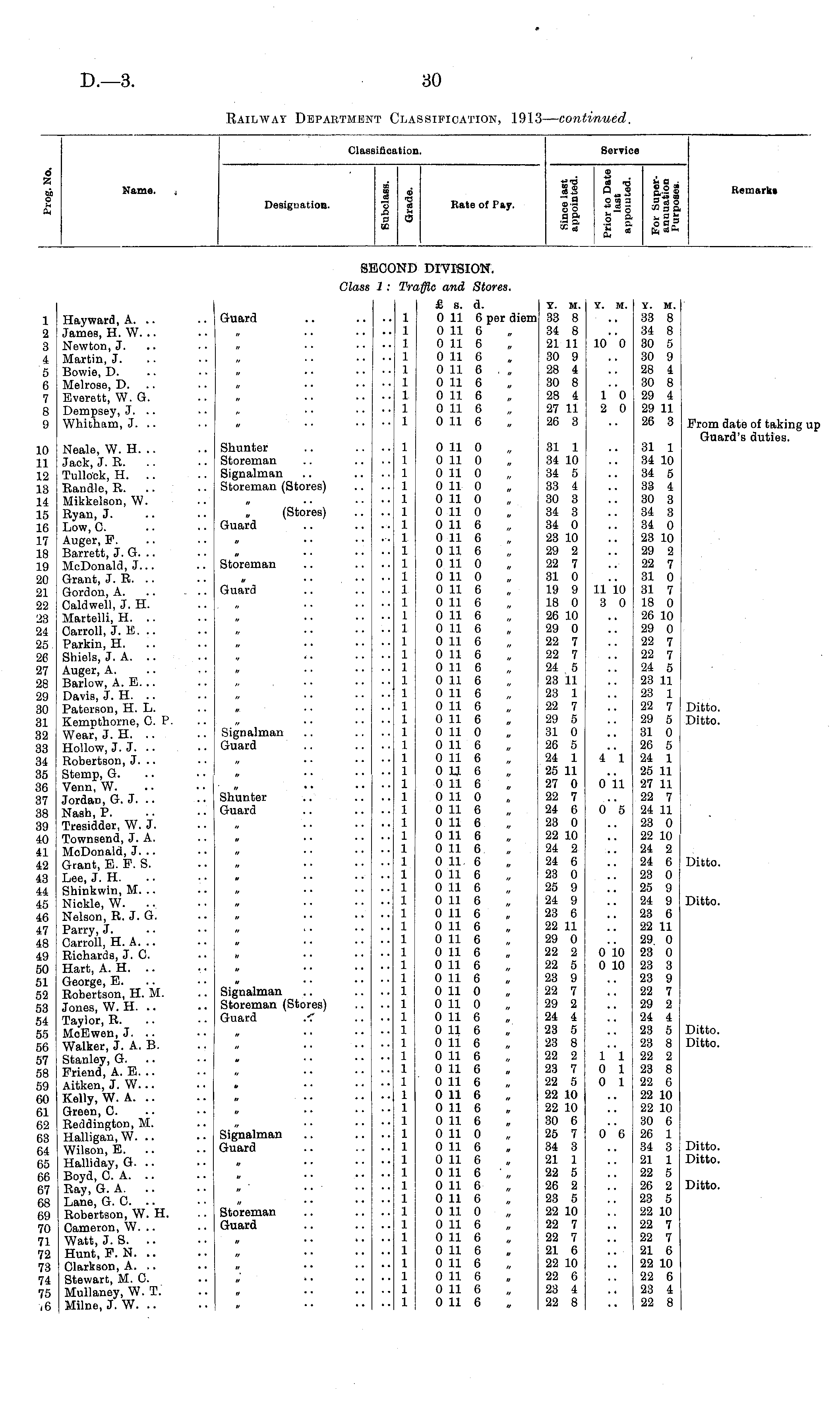 Clasi lification. Service d A DO O 34 ft Name. Designation. CO £ 'o X 3 CO a •a cd 34 0 Rate of Fay. §2 0.1 8,2 8 oS of a oSg a o ■"» 3 M s ft oft S ft .»S iS | g £§£ Remarks S3 L.CC DIVISION. Class 1 : iffic and Stores. 1 2 3 4 5 6 7 8 9 Hay ward, A. James, H. W. .. Newton, J. Martin, J. Bowie, D. Melrose, D. .. Everett, W. G. Dempsey, J. .. Whitham, J. .. Guard 1 1 1 1 1 1 1 1 1 £ s. d. 0 11 6 per diem 0 11 6 0 11 6 0 11 6 0 11 6 0 11 6 0 11 6 0 11 6 0 11 6 Y. let. 33 8 34 8 21 11 30 9 28 4 30 8 28 4 27 11 26 3 Y. M. io"o Y. M. 33 8 34 8 30 5 30 9 28 4 30 8 29 4 29 11 26 3 10 2 0 10 11 12 13 14 15 16 17 18 19 20 21 22 23 24 25 26 27 28 29 30 81 32 33 34 35 36 37 38 39 40 41 42 43 44 45 46 47 48 40 50 51 52 53 54 55 56 57 58 59 Neale, W. H. .. Jack, J. R. Tulloek, H. .. Randle, R. Mikkelson, W. Ryan, J. Low, 0. Auger, F. Barrett, J. G. McDonald, J... Grant, J. R. Gordon, A. Caldwell, J. H. Martelli, H. .. Carroll, J. E. .. Parkin, H. Shiels, J. A. Auger, A. Barlow, A. E. .. Davis, J. H. Paterson, H. L. Kempthorne, 0. P. Wear, J. H. Hollow, J. J. Robertson, J. .. Stemp, G. Venn, W. Jordan,G. J. .. Nash, P. Tresidder, W. J. Townsend, J. A. McDonald, J. .. Grant, E. F. S. Lee, J. H. Shinkwin, M. .. Nickle, W. .. Nelson, R. J. G. Parry, J. Carroll, H. A. .. Richards, J. 0. Hart, A. H. George, E. Robertson, H. M. Jones, W. H. Taylor, R. MoEwen, J. .. Walker, J. A. B. Stanley, G. Friend, A. E. .. Aitken, J. W. .. Kelly, W. A. Green, 0. Reddington, M. Halligan.W. .. Wilson, E. Halliday, G. .. Boyd, 0. A. Ray, G. A. Lane, G. 0. Robertson, W. H. Cameron, W. .. Watt, J. S. .. Hunt, F. N. .. Olarkson, A. .. Stewart, M. 0. Mullaney, W. T. Milne, J. W. .. Shunter Storeman Signalman Storeman (Stores) 1 1 1 1 1 1 1 1 1 1 1 1 1 1 1 1 1 1 1 1 1 1 1 1 1 1 1 1 1 1 1 1 1 1 1 1 1 1 1 1 1 1 1 1 1 1 1 1 1 1 1 1 1 1 1 1 1 1 1 1 1 1 1 1 1 1 1 0 11 0 0 11 0 0 11 0 0 11 0 0 11 0 0 11 0 0 11 6 0 11 6 0 11 6 0 11 0 0 11 0 0 11 6 0 11 6 0 11 6 0 11 6 0 11 6 0 11 6 0 11 6 0 11 6 0 11 6 0 11 6 0 11 6 0 11 0 0 11 6 0 11 6 0 11 6 0 11 6 0 11 0 0 11 6 0 11 6 0 11 6 0 11 6 0 11 6 0 11 6 0 11 6 0 11 6 0 11 6 0 11 6 0 11 6 0 11 6 0 11 6 0 11 6 0 11 0 0 11 0 0 11 6 0 11 6 0 li 6 0 11 6 0 11 6 0 11 6 0 11 6 0 11 6 0 11 6 0 11 0 0 11 6 0 11 6 0 11 6 0 11 6 0 11 6 0 11 0 0 11 6 0 11 6 0 11 6 0 11 6 0 11 6 0 11 6 0 11 6 31 1 34 10 34 5 33 4 30 3 34 3 34 0 23 10 29 2 22 7 31 0 19 9 18 0 26 10 29 0 22 7 22 7 24 5 23 11 23 1 22 7 29 5 31 0 26 5 24 1 25 11 27 0 22 7 24 6 23 0 22 10 24 2 24 6 23 0 25 9 24 9 23 6 22 11 29 0 22 2 22 5 23 9 22 7 29 2 24 4 23 5 23 8 22 2 23 7 22 5 22 10 22 10 30 6 25 7 34 3 21 1 22 5 26 2 23 5 22 10 22 7 22 7 21 6 22 10 22 6 23 4 22 8 31 1 34 10 34 5 33 4 30 3 34 3 34 0 23 10 29 2 22 7 31 0 31 7 18 0 26 10 29 0 22 7 22 7 24 5 23 11 23 1 22 7 29 5 31 0 26 5 24 1 25 11 27 11 22 7 24 11 23 0 22 10 24 2 24 6 23 0 25 9 24 9 23 6 22 11 29 0 23 0 23 3 23 9 22 7 29 2 24 4 23 5 23 8 22 2 23 8 22 6 22 10 22 10 30 6 26 1 34 3 21 1 22 5 26 2 23 5 22 10 22 7 22 7 21 6 22 10 22 6 23 4 22 8 From date of taking up Guard's duties. „ (Stores) Guard Storeman » • • Guard li io 3 0 Ditto. Ditto. Signalman Guard 4*1 o'ii Shunter Guard o"5 Ditto. Ditto. o'io o 10 Signalman Storeman (Stores) Guard Ditto. Ditto. l l 0 1 0 1 61 62 63 C4 65 66 67 68 69 70 71 72 73 74 75 ,6 Signalman Guard Storeman Guard 0*6 Ditto. Ditto. Ditto.