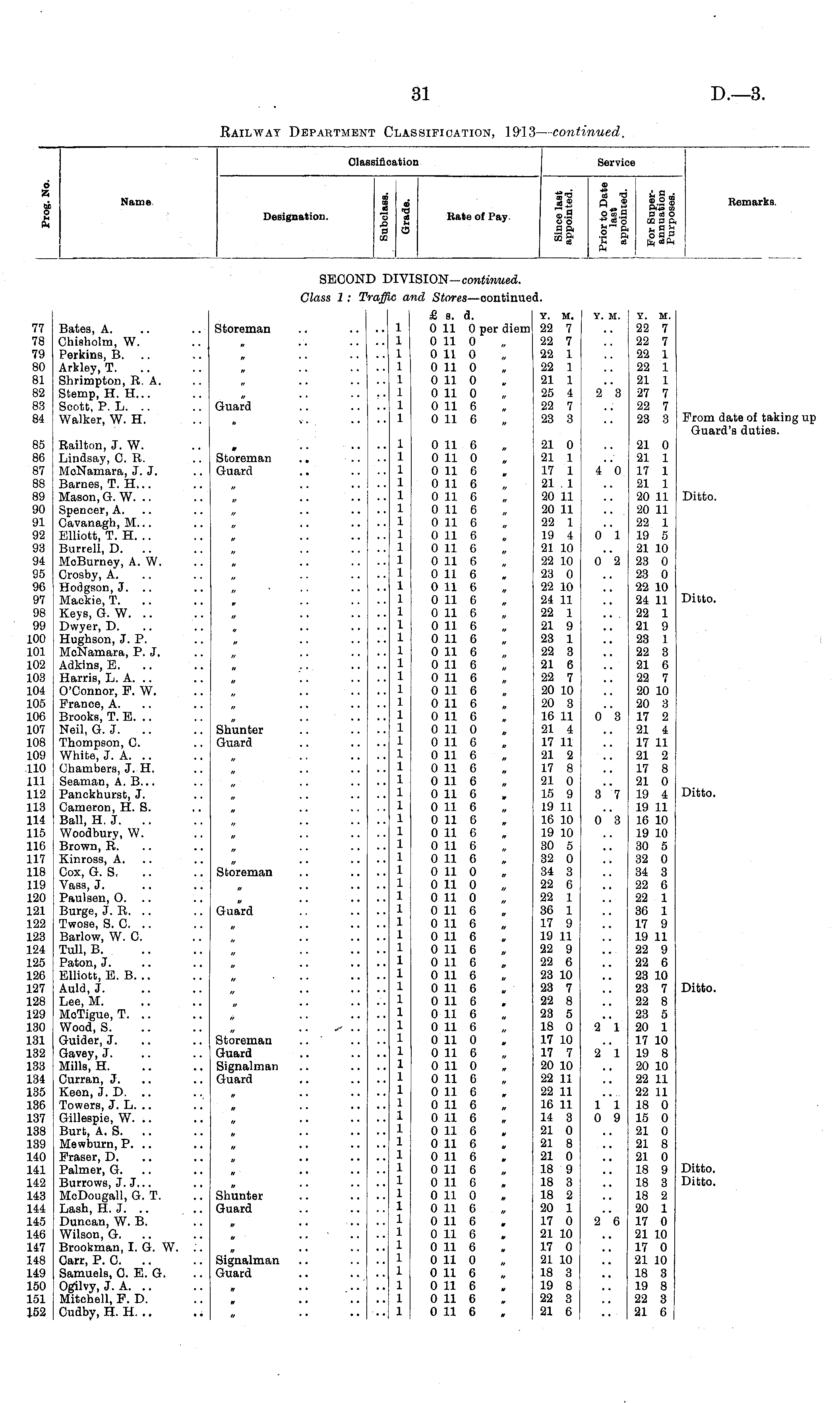 Clasi sifici .tioi Service 6 A DC O 34 ft Name. Designation. ed co £ 'o x a 01 a •a cd 34 C5 Rate of Fay. Id's £2 O.S o o a a a * 'S it § CD a ® a o ™ o co a a cd o *■ cd 3 CQ 3 a a" ft 34 a 34 ■2 n oas 34 ed £< cdft Remarks. SECON SION— continued. Class 1 : T \a. id Stores —continue id. 77 78 79 80 81 82 83 84 Bates, A. Chisholm, W. Perkins, B. Arkley, T. Shrimpton, R. A. Stemp, H. H... Scott, P. L. .. Walker, W. H. Storeman 1 1 1 1 1 1 1 1 £ s. d. 0 11 0 per diem 0 11 0 0 11 0 0 11 0 0 11 0 0 11 0 0 11 6 0 11 6 Y. M. 22 7 22 7 22 1 22 1 21 1 25 4 22 7 23 3 Y. M. Y. M. 22 7 22 7 22 1 22 1 21 1 27 7 22 7 23 3 2 3 Guard 85 8G 87 88 80 90 91 92 98 94 95 9G 97 98 99 LOO 101 02 108 104 105 106 107 LOS LOO L10 Lll L12 L13 L14 L15 L16 L17 11.8 [19 120 L2.1. L22 L23 24 .25 L2G .27 .28 ,29 130 .31 .32 .33 L34 L35 L36 L37 138 L39 140 141 L42 143 L44 L45 L40 L47 L4.8 L49 L50 L51 L52 Railton, J. W. Lindsay, 0. R. McNamara, J. J, Barnes, T. H... Mason, G. W. .. Spencer, A. Cavanagh, M... Elliott, T. H. .. Burrell, D. .. MoBurney, A. W. Crosby, A. Hodgson, J. .. Mackie, T. Keys, G. W. Dwyer, D. Hughson, J. P. McNamara, P. J. Adkins, E. Harris, L. A. O'Connor, F. W. France, A. Brooks, T. E. Neil, G. J. Thompson, C White, J. A. Chambers, J. H. Seaman, A. B... Panckhurst, J. Cameron, H. S. Ball, H. J. Woodbury, W. Brown, R. Kinross, A. Cox, G. S, Vass, J. Paulsen, 0. Burge, J. R. Twose, S. 0. Barlow, W. 0. Tull, B. Paton, J. Elliott, E. B. .. Auld, J. Lee, M. McTigue, T. .. Wood, S. Guider, J. Gavey, J. Mills, H. Curran, J. Keen, J. D. Towers, J. L. .. Gillespie, W. .. Burt, A. S. Mewimrn, P. .. Fraser, D. Palmer, G. Burrows, J. J... MeDougall, G. T. Lash, H. J. Duncan, W. B. Wilson, G. .. Brookman, I. G. W. Garr, P. 0. Samuels, 0. E. G, Ogilvy, J. A. Mitchell, F. D. Cudby, H. H. .. * Storeman Guard 1 1 1 1 1 1 1 1 1 1 1 1 1 1 1 1 1 1 1 1 1 1 1 1 1 1 1 1 1 1 1 1 1 1 1 1 1 1 1 1 1 1 1 1 1 1 1 1 1 1 1 1 1 1 1 1 1 1 1 1 1 1 1 1 1 1 1 1 0 11 6 0 11 0 0 11 6 0 11 6 0 11 6 0 11 6 0 11 6 0 11 6 0 11 6 0 11 6 0 11 6 0 11 6 0 11 6 0 11 6 0 11 6 0 11 6 0 11 6 0 11 6 0 11 6 0 11 6 0 11 6 0 11 6 0 11 0 0 11 6 0 11 6 0 11 6 0 11 6 0 11 6 0 11 6 0 11 6 0 11 6 0 11 6 0 11 6 0 11 0 0 11 0 0 11 0 0 11 6 0 11 6 0 11 6 0 11 6 0 11 6 0 11 6 0 11 6 0 11 6 0 11 6 0 11 6 0 11 0 0 11 6 0 11 0 0 11 6 0 11 6 0 11 6 0 11 6 0 11 6 0 11 6 0 11 6 0 11 6 0 11 6 0 11 0 0 11 6 0 11 6 0 11 6 0 11 6 0 11 0 0 11 6 0 11 6 0 11 6 0 11 6 21 0 21 1 17 1 21 . 1 20 11 20 11 22 1 19 4 21 10 22 10 23 0 22 10 24 11 22 1 21 9 23 1 22 3 21 6 22 7 20 10 20 3 16 11 21 4 17 11 21 2 17 8 21 0 15 9 19 11 16 10 19 10 30 5 32 0 34 3 22 6 22 1 36 1 17 9 19 11 22 9 22 6 23 10 23 7 22 8 23 5 18 0 17 10 17 7 20 10 22 11 22 11 16 11 14 3 21 0 21 8 21 0 18 9 18 3 18 2 20 1 17 0 21 10 17 0 21 10 18 3 19 8 22 3 21 6 21 0 21 1 17 1 21 1 20 11 20 11 22 1 19 5 21 10 23 0 23 0 22 10 24 11 22 1 21 9 23 1 22 3 21 6 22 7 20 10 20 3 17 2 21 4 17 11 21 2 17 8 21 0 19 4 19 11 16 10 19 10 30 5 32 0 34 3 22 6 22 1 36 1 17 9 19 11 22 9 22 6 23 10 23 7 22 8 23 5 20 1 17 10 19 8 20 10 22 11 22 11 18 0 15 0 21 0 21 8 21 0 18 9 18 3 18 2 20 1 17 0 21 10 17 0 21 10 18 3 19 8 22 3 21 6 From date of taking up Guard's duties. 4 "o Ditto. 0 1 o "2 Ditto. 0 "3 Ditto. Shunter Guard 3"7 0 "3 Storeman Guard Ditto. Storeman Guard Signalman Guard 2 1 2 1 1 "l 0 9 Ditto. Ditto. Shunter Guard 2"6 Signalman Guard