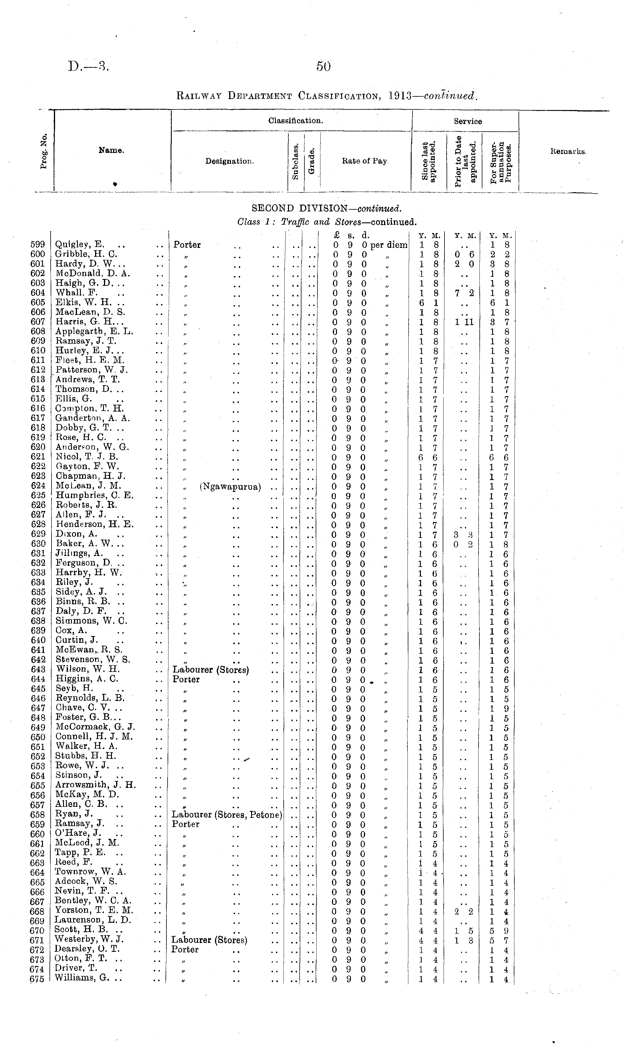 Class lification. Service 6 A cc p Name. Designation. to to © ti rtf O ti % 3 Ol Rate of Pay o "Stcj ed .a it a i» PS o.o| a .9 ° « .9 3 "ed o o o o CX 3 ft a a g" a 3. a j, •a a, .2 a o a 3 ed 3. ed En co ft ft. m Remarks. • SE.COS )iv: ISION — continued. Quigley, E. .. Gribble, H. 0. Hardy, D. W. .. McDonald, D. A. Haigh, G. D. .. Whall. F. Elkis, W. H. MacLean, D. S. Harris, G. H... Applegarth, E. L. Ramsay, J. T. Hurley, E. J. .. Fleet, H. E. M. Patterson, W. J. Andrews, T. T. Thomson, D. .. Ellis, G. Gornpton, T. H. Ganderton, A. A. Dobby, G. T. Rose, H. C. .. Anderson, W. G. Nicol, T. J. B. Gayton, F. W. Chapman, H. J. McLean, J. M. Humphries, 0. E. Robeits, J. R. Allen, F. J. .. Henderson, H. E. D.xon, A. Baker, A. W. .. Jilbngs, A. Ferguson, D. .. Harrhy, H. W. Riley, J. Sidey, A. J. Binns, R. B. Daly, D. F. Simmons, W. C. Cox, A. Curtin, J. McEwan,. R. S. Stevenson, W. S. Wilson, W. H. Higgins, A. C Seyb, H. Reynolds, L. B. Chave, 0. V. Foster, G. B... McCormack, G. J. Connell, H. J. M. Walker, H. A. Stubbs, H. H. Rowe, W. J. Stinson, J. Arrowsmith, J. H. McKay, M. D. Allen,'0. B. .. Ryan, J. Ramsay, J. O'Hare, J. McLeod, J. M. Taop, P. E. Reed, F. Townrow, W. A. Adcock, W. S. Nevin, T. F. .. Bentley, W. 0. A. Yorston, T. E. M. Laurenson, L. D. Scott, H. B. .. Westerby.W. J. Deareley, O. T. Otton, F. T. Driver, T. Williams, G. .. Class 1 : '. TO, ic a md Stores —continue id. 599 600 601 602 603 604 605 606 607 608 609 610 611 612 613 614 615 616 617 618 619 620 621 622 623 624 625 626 627 628 629 630 631 632 633 634 635 636 637 638 639 640 641 642 643 644 645 646 647 648 649 650 651 652 653 654 655 656 657 658 659 660 661 662 663 664 665 666 667 668 669 670 671 672 673 674 Porter (Ngawapurua) .. £ a. d. 0 9 0 per diem 0 9 0 0 9 0 0 9 0 0 9 0 0 9 0 0 9 0 0 9 0 0 9 0 0 9 0 0 9 0 0 9 0 09 0 0 9 0 0 9 0 0 9 0 0 9 0 0 9 0 0 9 0 0 9 0 0 9 0 0 9 0 0 9 0 0 9 0 0 9 0 0 9 0 0 9 0 0 9 0 0 9 0 0 9 0 0 9 0 0 9 0 0 9 0 0 9 0 0 9 0 0 9 0 0 9 0 0 9 0 0 9 0 0 9 0 0 9 0 0 9 0 0 9 0 0 9 0 0 9 0 0 9 0.,, 0 9 0 0 9 0 0 9 0 0 9 0 0 9 0 0 9 0 0 9 0 0 9 0 0 9 0 0 9 0 0 9 0 0 9 0 0 9 0 0 9 0 0 9 0 0 9 0 0 9 0 0 9 0 0 9 0 0 9 0 0 9 0 0 9 0 0 9 0 0 9 0 0 9 0 0 9 0 0 9 0 0 9 0 0 9 0 0 9 0 i I Y. St. I 1 8 1 8 1 8 1 8 1 8 1 8 6 1 1 8 1 8 1 8 1 8 1 8 1 7 1 7 1 7 1 7 1 7 1 7 i 1 7 1 7 1 7 1 7 6 6 1 7 1 7 1 7 1 7 1 7 1 7 1 7 1 7 1 6 1 6 1 6 1 6 1 6 1 6 1 6 1 6 1 6 1 6 1 6 1 6 1 6 1 6 1 6 1 5 1 5 1 5 1 5 1 5 1 5 1 5 1 5 1 5 1 5 1 5 1 5 1 5 1 5 1 5 1 5 I 5 1 5 1 4 1 4 1 4 1 4 1 4 1 4 1 4 4 4 4 4 1 4 1 4 1 4 Y. St. o"6 2 0 7'*2 111 3".3 0 2 Y. St. 1 8 2 2 3 8 1 8 1 8 1 8 6 1 1 8 3 7 1 8 1 8 1 8 1 7 1 7 1 7 1 7 1 7 1 7 1 7 1 7 1 7 1 7 G 6 1 7 1 7 1 7 1 7 1 7 1 7 1 7 1 7 1 8 1 6 1 6 1 6 1 6 1 6 1 6 1 6 1 6 1 6 1 6 1 6 1 6 1 6 1 6 1 5 1 5 1 9 1 5 1 5 1 5 1 5 1 5 1 5 1 5 1 5 1 5 1 5 1 5 1 5 1 5 1 5 1 5 1 4 1 4 1 4 1 4 1 4 1 4 1 4 5 9 5 7 1 4 1 4 1 4 Labourer (Stores) Porter „ .. S Labourer (Stores, Petone) Porter 2 2 Labourer (Stores) Porter 1 5 1 3