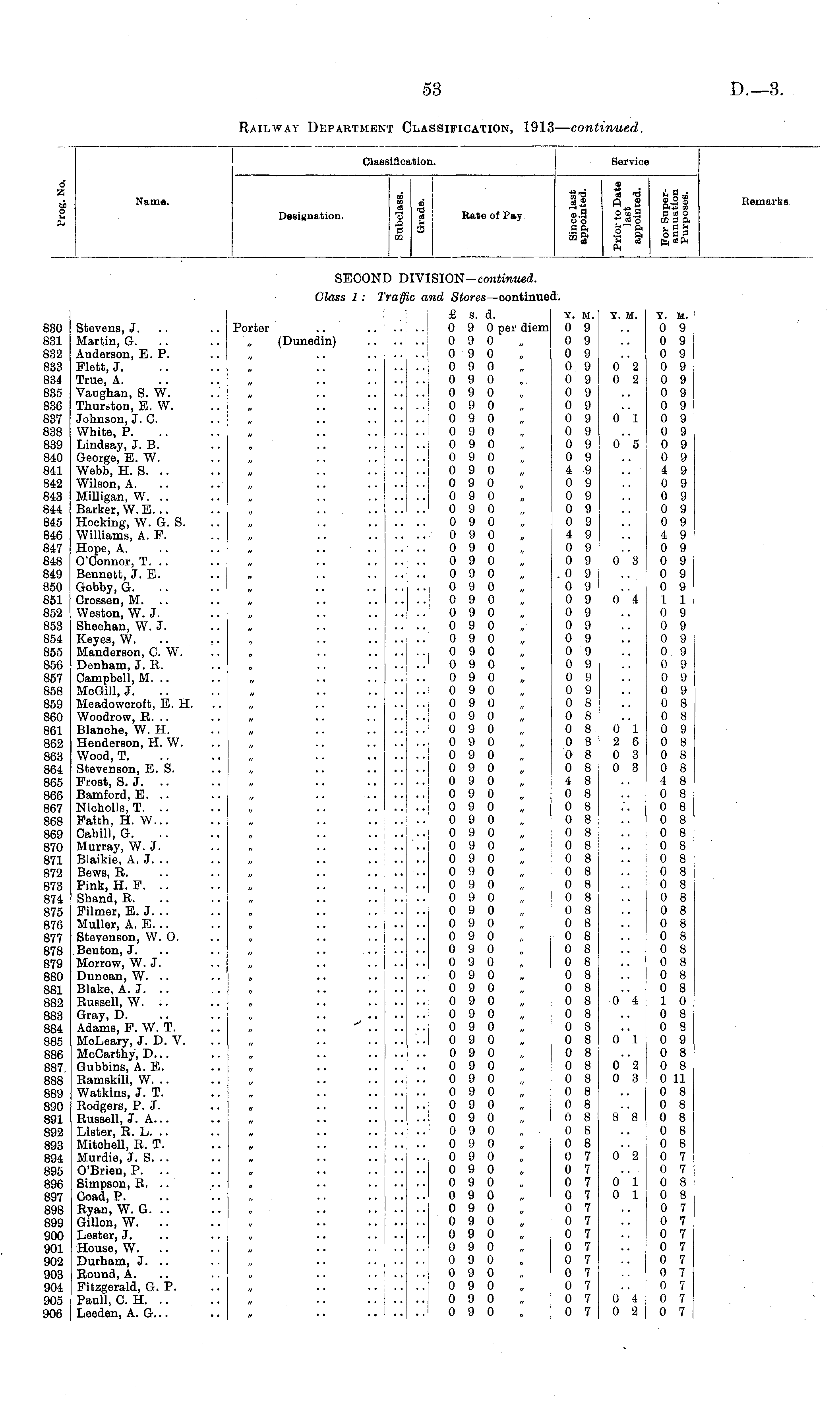 Class iification. Service o" A ci o 34 3. Name. Designation. CO . ' ti rrj : o ti •§ 3 Ol Rate of Pay a »■= a i> i 9 co £% G 2 gja ©.9 °co.2 SedO o'o 033ft a a g~ ft 3, a 34 ao. .2 ft o a 3 m ed >. d ft «ft ft Remark b SECOND r ISION— continued. Stevens, J. Martin, G. Anderson, E. P. Flett, J. True, A. Vaughan, S. W. Thurston, E. W. Johnson, J. 0. White, P. Lindsay, J. B. George, E. W. Webb, H. S. Wilson, A. Milligan, W. .. Barker, W.E... Hocking, W. G. S. Williams, A. F. Hope, A. O'Connor, T. .. Bennett, J. E. Gobby, G. Crossen, M. Weston, W. J. Sheehan, W. J. Keyes, W. Manderson, O. W. Denham, J. R. Campbell, M. .. McGill, J. Meadoworoft, E. H. Woodrow, R. .. Blanche, W. H. Henderson, H. W. Wood, T. Stevenson, E. S. Frost, S. J. Bamford, E. .. Nicholls, T. .. Faith, H. W... Cahill, G. Murray, W. J. Blaikie, A. J. .. Bews, R. Pink, H. F. Shand, R. Filmer, E. J. .. Muller, A. E. .. Stevenson, W. O. Benton, J. Morrow, W. J. Duncan, W. .. Blake, A. J. .. Russell, W. .. Gray, D. Adams, F. W. T. MoLeary, J. D. V. McCarthy, D... Gubbins, A. E. Ramskill, W. .. Watkins, J. T. Rodgers, P. J. Russell, J. A... Lister, R. L. Mitohell, R. T. Murdie, J. S. .. O'Brien, P. .. Simpson, R. .. Coad, P. Ryan, W. G. Gillon, W. .. Lester, J. House, W. Durham, J. Round, A. Fitzgerald, G. P. Paull, O. H. Leeden, A. G... Glass 1 : Trafj 'ra. ,nd Stores —continue. i. 830 831 832 833 834 835 836 837 838 839 840 841 842 843 844 845 846 847 848 849 850 851 852 853 854 855 856 857 858 859 860 861 862 863 864 865 866 867 868 869 870 871 872 873 874 875 876 877 878 879 880 881 882 883 884 885 886 887 888 889 890 891 892 893 894 895 896 897 898 899 900 901 902 903 904 905 906 Porter (Dunedin) £ a. d. 0 9 0 per diem 0 9 0 0 9 0 0 9 0 0 9 0 0 9 0 0 9 0 0 9 0 0 9 0 0 9 0 0 9 0 0 9 0 0 9 0 0 9 0 0 9 0 0 9 0 0 9 0 0 9 0 0 9 0 0 9 0 0 9 0 0 9 0 0 9 0 0 9 0 0 9 0 0 9 0 0 9 0 0 9 0 0 9 0 0 9 0 0 9 0 0 9 0 0 9 0 0 9 0 0 9 0 0 9 0 0 9 0 0 9 0 0 9 0 0 9 0 0 9 0 0 9 0 0 9 0 0 9 0 0 9 0 0 9 0 0 9 0 0 9 0 0 9 0 0 9 0 0 9 0 0 9 0 0 9 0 0 9 0 0 9 0 0 9 0 0 9 0 0 9 0 0 9 0 0 9 0 0 9 0 0 9 0 0 9 0 0 9 0 0 9 0 0 9 0 0 9 0 0 9 0 0 9 0 0 9 0 0 9 0 0 9 0 0 9 0 0 9 0 0 9 0 0 9 0 0 9 0 Y. SI. 0 9 0 9 0 9 0 9 0 9 0 9 0 9 0 9 0 9 0 9 0 9 4 9 0 9 0 9 0 9 0 9 4 9 0 9 0 9 . 0 9 0 9 0 9 0 9 0 9 0 9 0 9 0 9 0 9 0 9 0 8 0 8 0 8 0 8 0 8 0 8 4 8 0 8 0 8 0 8 0 8 0 8 0 8 0 8 0 8 0 8 0 8 0 8 0 8 0 8 0 8 0 8 0 8 0 8 0 8 0 8 0 8 0 8 0 8 0 8 0 8 0 8 0 8 0 8 0 8 0 7 0 7 0 7 0 7 0 7 0 7 0 7 0 7 0 7 0 7 0 7 0 7 0 7 Y. M. 0 2 0 2 0 1 o"5 o"3 0 4 0 1 2 6 0 3 0 3 Y. If. 0 9 0 9 0 9 0 9 0 9 0 9 0 9 0 9 0 9 0 9 0 9 4 9 0 9 0 9 0 9 0 9 4 9 0 9 0 9 0 9 0 9 1 1 0 9 0 9 0 9 0. 9 0 9 0 9 0 9 0 8 0 8 0 9 0 8 0 8 0 8 4 8 0 8 0 8 0 8 0 8 0 8 0 8 0 8 0 8 0 8 0 8 0 8 0 8 0 8 0 8 0 8 0 8 1 0 0 8 0 8 0 9 0 8 0 8 0 11 0 8 0 8 0 8 0 8 0 8 0 7 0 7 0 8 0 8 0 7 0 7 0 7 0 7 0 7 0 7 0 7 0 7 0 7 it .. .. j .. .. .. o"4 S* o"i 0"2 0 3 8"8 o"2 0 1 0 1 " I " 0 4 0 2 . . I . .