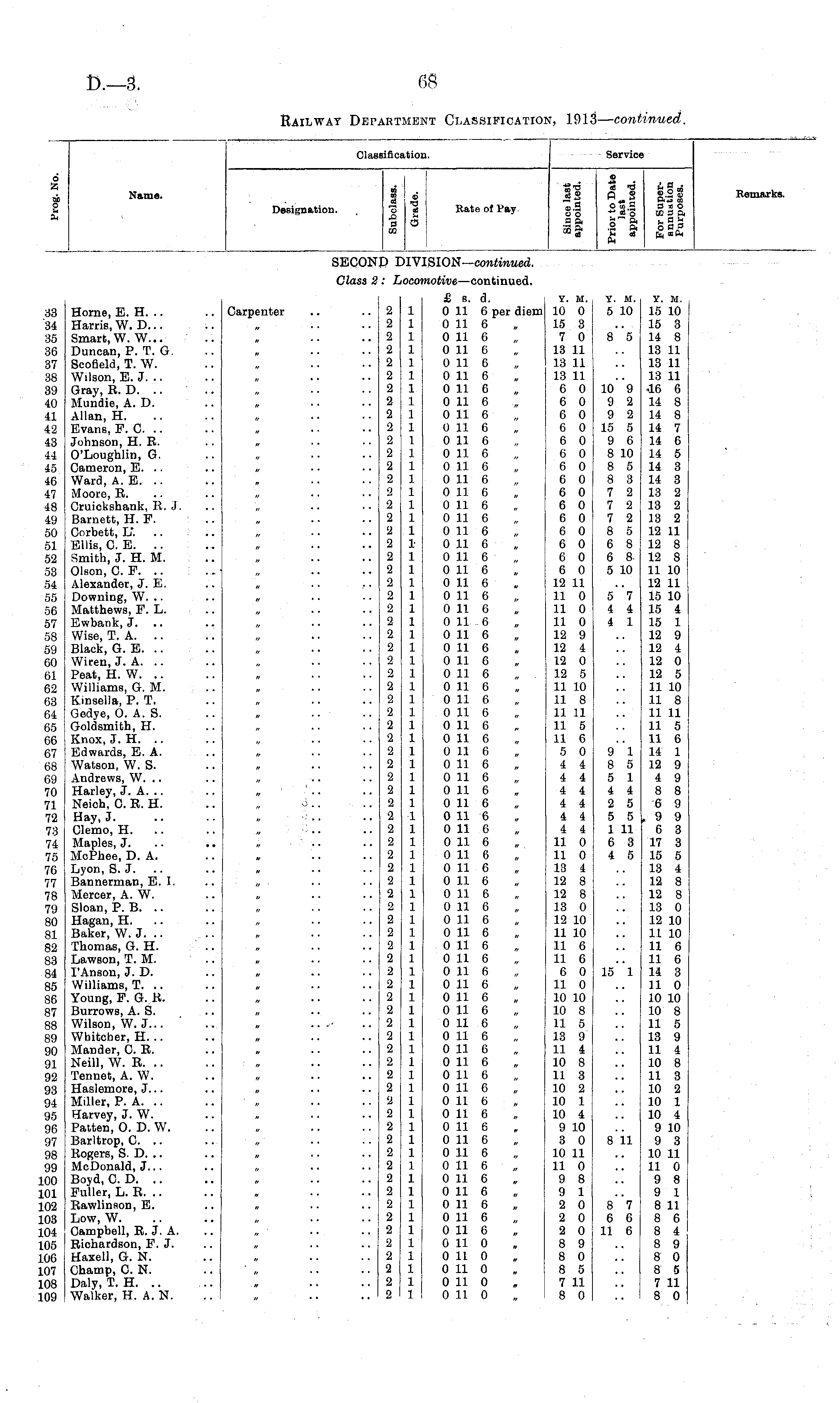 Classification. Service d 5 :-. 3h Name. Designation. cd co © £ i-i o ed •§ s 02 Rate of Pay II' I J 111 ©3 °eO,2 SeCO OO ** ed o 023ft a a g~ ft 3. 0 * a a .2 ft o 0 3 03 cd 3< <d Enecft ft Remarks. SECON nv: !SION— continued. Class 2 lOCOJ notive —continued. 33 34 35 36 37 38 39 40 41 42 43 44 45 46 47 48 49 50 51 52 53 .54 55 56 57 58 59 60 61 62 63 64 65 66 G7 68 GO 70 71 72 73 74 75 70 77 78 79 80 81 82 83 84 85 86 87 88 89 90 91 92 93 94 95 96 97 98 99 100 101 102 103 104 L05 LOO 107 108 109 Home, E. H. .. Harris, W. D... Smart, W. W... Duncan, P. T. G. Scofield, T. W. Wilson, E. J. .. Gray, R. D. Mundie, A. D. Allan, H. Evans, F. 0. Johnson, H. R. O'Loughlin, G. Cameron, E. .. Ward, A. E. .. Moore, R. Cruiokshank, R. J. Barnett, H. F. Corbett, L". Ellis, 0. E. Smith, J. H. M. Olson, 0. F. .. Alexander, J. E. Downing, W. .. Matthews, F. L. Ewbank, J. Wise, T. A. Black, G. E. Wiren, J. A. Peat, H. W. Williams, G. M. Kinsella, P. T, Gedye, O. A. S. Goldsmith, H. Knox, J. H. Edwards, E. A. Watson, W. S. Andrews, W. .. Harley, J. A. .. Neich, 0. R. H. Hay, J. Clemo, H. Maples, J. McPhee, D. A. Lyon, S. J. Bannerman, E. I. Mercer, A. W. Sloan, P. B. Hagan, H. Baker, W. J. Thomas, G. H. Lawson, T. M. I'Anson, J. D. Williams, T. .. Young, F. G. R. Burrows, A. S. Wilson, W.J... Whitcher, H. .. Mander, C. R. Neill, W. R. Tennet, A. W. Haslemore, J... Miller, P. A. Harvey, J. W. Patten, O. D. W. Barltrop, 0. .. Rogers, S. D. .. McDonald, J... Boyd, CD. .. Fuller, L. R. .. Rawlinson, E. Low, W. Campbell, R. J. A. Richardson, F. J. Haxell, G. N. Champ, 0. N. Daly, T. H. Walker, H. A. N. Carpenter 2 2 2 2 2 2 2 2 2 2 2 2 2 2 2 2 2 2 2 2 2 2 2 2 2 2 2 2 2 2 2 2 2 2 2 2 2 2 2 2 2 2 2 2 2 2 2 2 2 2 2 2 2 2 2 2 2 2 2 2 2 2 2 2 2 2 2 2 2 2 2 2 2 2 2 2 2 1 1 1 1 1 1 1 1 1 1 1 1 1 1 1 1 1 1 1 1 1 1 1 1 1 1 1 1 1 1 1 1 1 1 1 1 1 1 1 1 1 1 1 1 1 1 1 1 1 1 1 1 1 1 1 1 1 1 1 1 1 1 1 1 1 1 1 1 1 1 1 1 1 1 1 1 1 £ s. d. 0 11 6 per diem 0 11 6 0 11 6 0 11 6 0 11 6 0 11 6 0 11 6 0 11 6 0 11 6 0 11 6 0 11 6 0 11 6 0 11 6 0 11 6 0 11 6 0 11 6 0 11 6 0 11 6 0 11 6 0 11 6 0 11 6 0 11 6 0 11 6 0 11 6 0 11 6 0 11 6 0 11 6 0 11 6 0 11 6 0 11 6 0 11 6 0 11 6 0 11 6 0 11 6 0 11 6 0 11 6 0 11 6 0 11 6 0 11 6 0 11 6 0 11 6 0 11 6 0 11 6 0 11 6 0 11 6 0 11 6 0 11 6 0 11 6 0 11 6 0 11 6 0 11 6 0 11 6 0 11 6 0 11 6 0 11 6 0 11 6 0 11 6 0 11 6 0 11 6 0 11 6 0 11 6 0 11 6 0 11 6 0 11 6 0 11 6 0 11 6 0 11 6 0 11 6 0 11 6 0 11 6 0 11 6 0 11 6 0 11 0 0 11 0 0 11 0 0 11 0 0 11 0 Y. SI. 10 0 15 3 7 0 13 11 13 11 13 11 6 0 6 0 6 0 6 0 6 0 6 0 6 0 6 0 6 0 6 0 6 0 6 0 6 0 6 0 6 0 12 11 11 0 11 0 11 0 12 9 12 4 12 0 12 5 11 10 11 8 11 11 11 5 11 6 5 0 4 4 4 4 4 4 4 4 4 4 4 4 11 0 11 0 13 4 12 8 12 8 13 0 12 10 11 10 11 6 11 6 6 0 11 0 10 10 10 8 11 5 13 9 11 4 10 8 11 3 10 2 10 1 10 4 9 10 3 0 10 11 11 0 9 8 9 1 2 0 2 0 2 0 8 9 8 0 8 5 7 11 8 0 Y. M. 5 10 8"5 10 9 9 2 9 2 15 5 9 6 8 10 8 5 8 3 7 2 7 2 7 2 8 5 6 8 6 8 5 10 5 7 4 4 4 1 9 1 8 5 5 1 4 i 2 5 5 5 1 11 6 3 4 5 Y. M. 15 10 15 3 14 8 13 11 13 11 13 11 16 6 14 8 14 8 14 7 14 6 14 5 14 3 14 3 13 2 13 2 13 2 12 11 12 8 12 8 11 10 12 11 15 10 15 4 15 1 12 9 12 4 12 0 12 5 11 10 11 8 11 11 11 5 11 6 14 1 12 9 4 9 8 8 6 9 9 9 6 3 17 3 15 5 13 4 12 8 12 8 13 0 12 10 11 10 11 6 11 6 14 3 11 0 10 10 10 8 11 5 13 9 11 4 10 8 11 3 10 2 10 1 10 4 9 10 9 3 10 11 11 0 9 8 9 1 8 11 8 6 8 4 8 9 8 0 8 5 7 11 8 0 15"l 8 ii 8 7 6 6 11 6